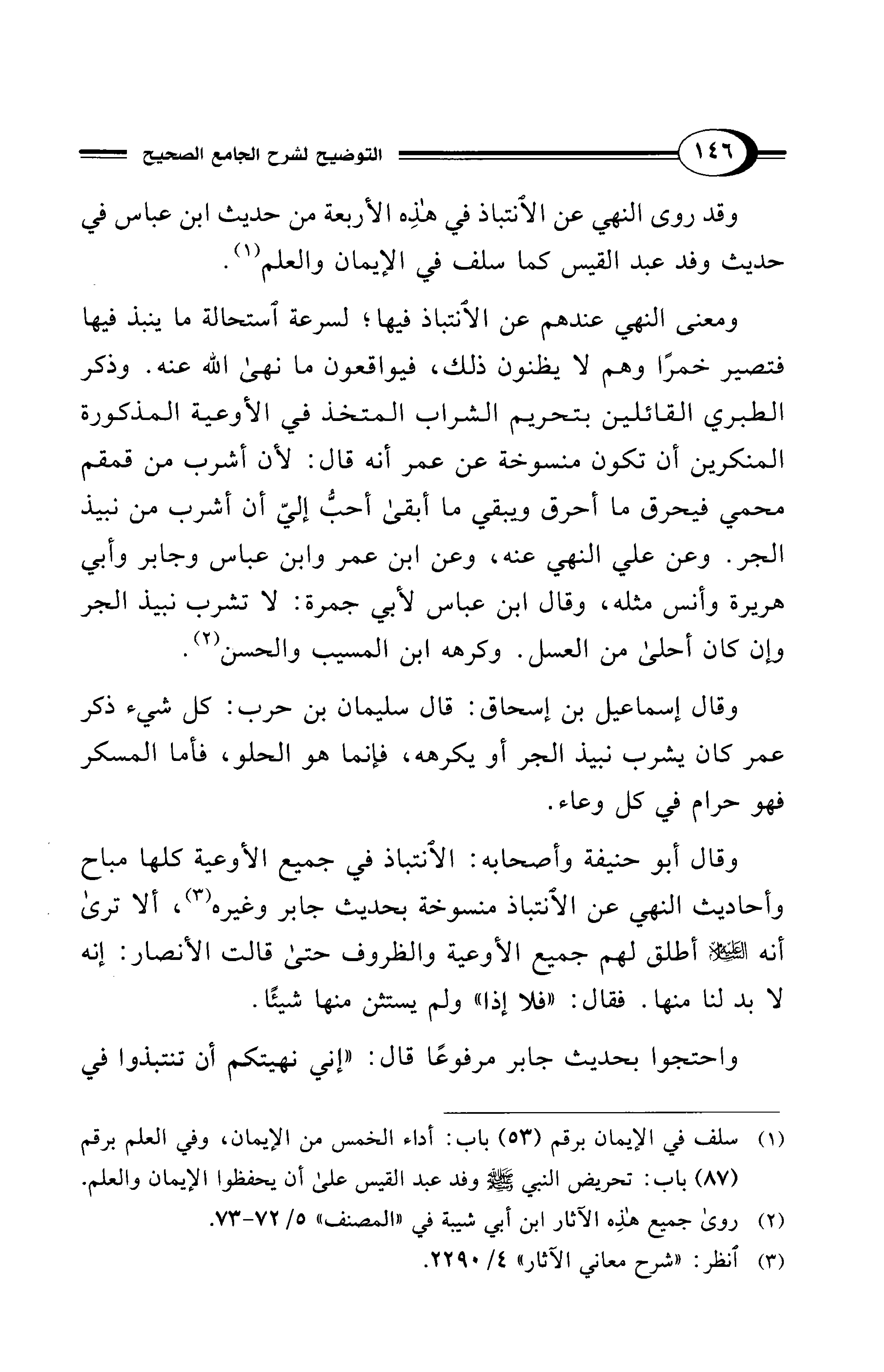 ومعنى النهي عندهم عن الانتباذ فيها؛ لسرعة استحالة ما ينبذ فيها فتصير خمرًا وهم لا يظنون ذلك، فيواقعون ما نهى الله عنه. وذكر الطبري القائلين بتحريم الشراب المتخذ في الأوعية المذكورة المنكرين أن تكون منسوخة عن عمر أنه قال: لأن أشرب من قمقم محمي فيحرق ما أحرق ويبقي ما أبقى أحبُّ إليّ أن أشرب من نبيذ الجر. وعن علي النهي عنه، وعن ابن عمر وابن عباس وجابر وأبي هريرة وأنس مثله، وقال ابن عباس لأبي جمرة: لا تشرب نبيذ الجر وإن كان أحلى من العسل. وكرهه ابن المسيب والحسن (¬2).