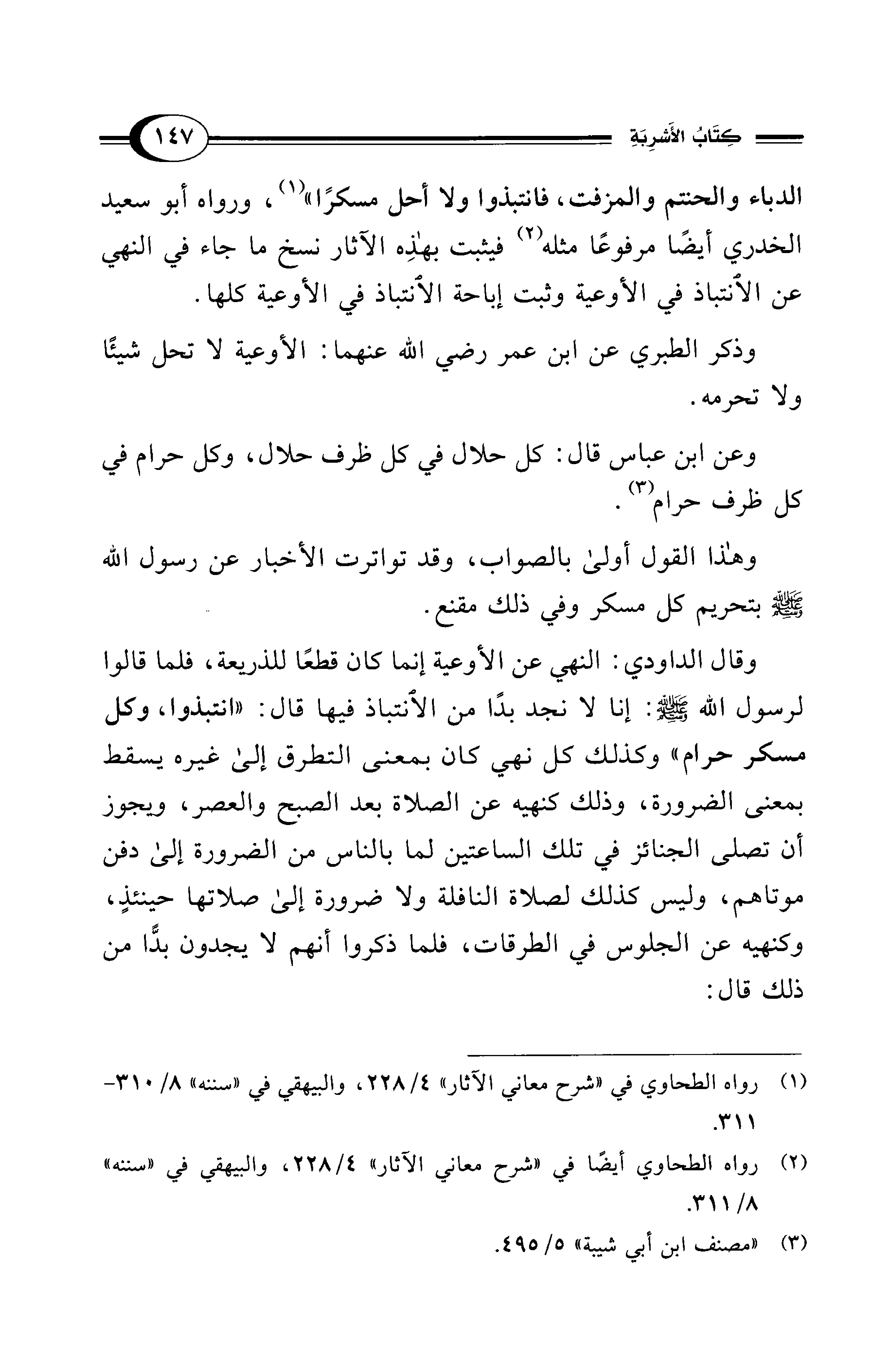 وقال الداودي: النهي عن الأوعية إنما كان قطعًا للذريعة، فلما قالوا لرسول الله - صلى الله عليه وسلم -: إنا لا نجد بدًا من الانتباذ فيها قال: "انتبذوا، وكل مسكر حرام" وكذلك كل نهي كان بمعنى التطرق إلى غيره يسقط بمعنى الضرورة، وذلك كنهيه عن الصلاة بعد الصبح والعصر، ويجوز أن تصلى الجنائز في تلك الساعتين لما بالناس من الضرورة إلى دفن موتاهم، وليس كذلك لصلاة النافلة ولا ضرورة إلى صلاتها حينئذٍ، وكنهيه عن الجلوس في الطرقات، فلما ذكروا أنهم لا يجدون بدًّا من ذلك قال: