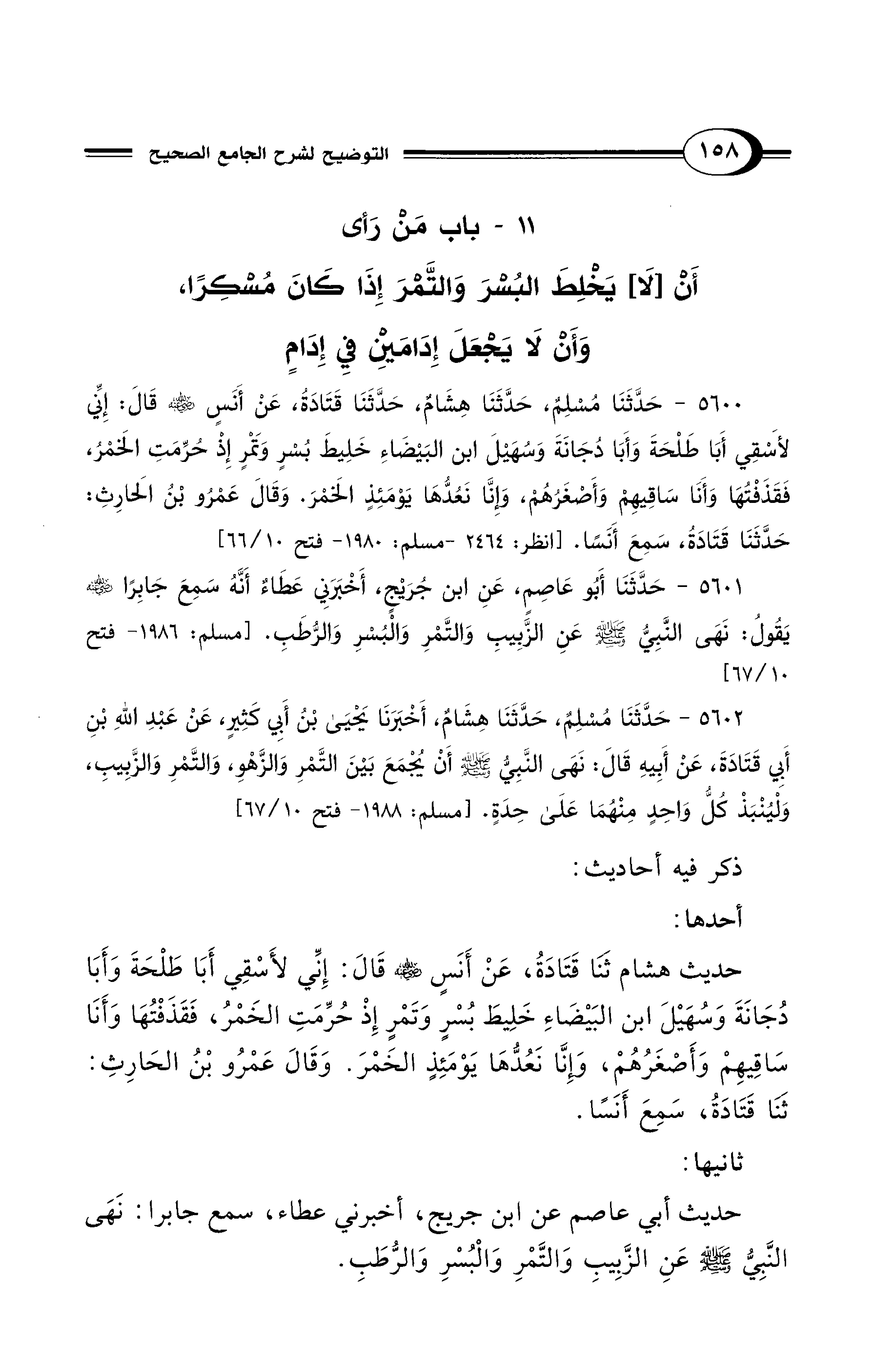 حديث هشام ثَنَا قَتَادَةُ، عَنْ أَنَسٍ - رضي الله عنه - قَالَ: إِنِّي لأَسْقِي أَبَا طَلْحَةَ وَأَبَا دُجَانَةَ وَسُهَيْلَ ابن البَيْضَاءِ خَلِيطَ بُسْرٍ وَتَمْرٍ إِذْ حُرِّمَتِ الخَمْرُ، فَقَذَفْتُهَا وَأَنَا سَاقِيهِمْ وَأَصْغَرُهُمْ، وَإِنَّا نَعُدُّهَا يَوْمَئِذٍ الخَمْرَ. وَقَالَ عَمْرُو بْنُ الحَارِثِ: ثَنَا قَتَادَةُ، سَمِعَ أَنَسًا.