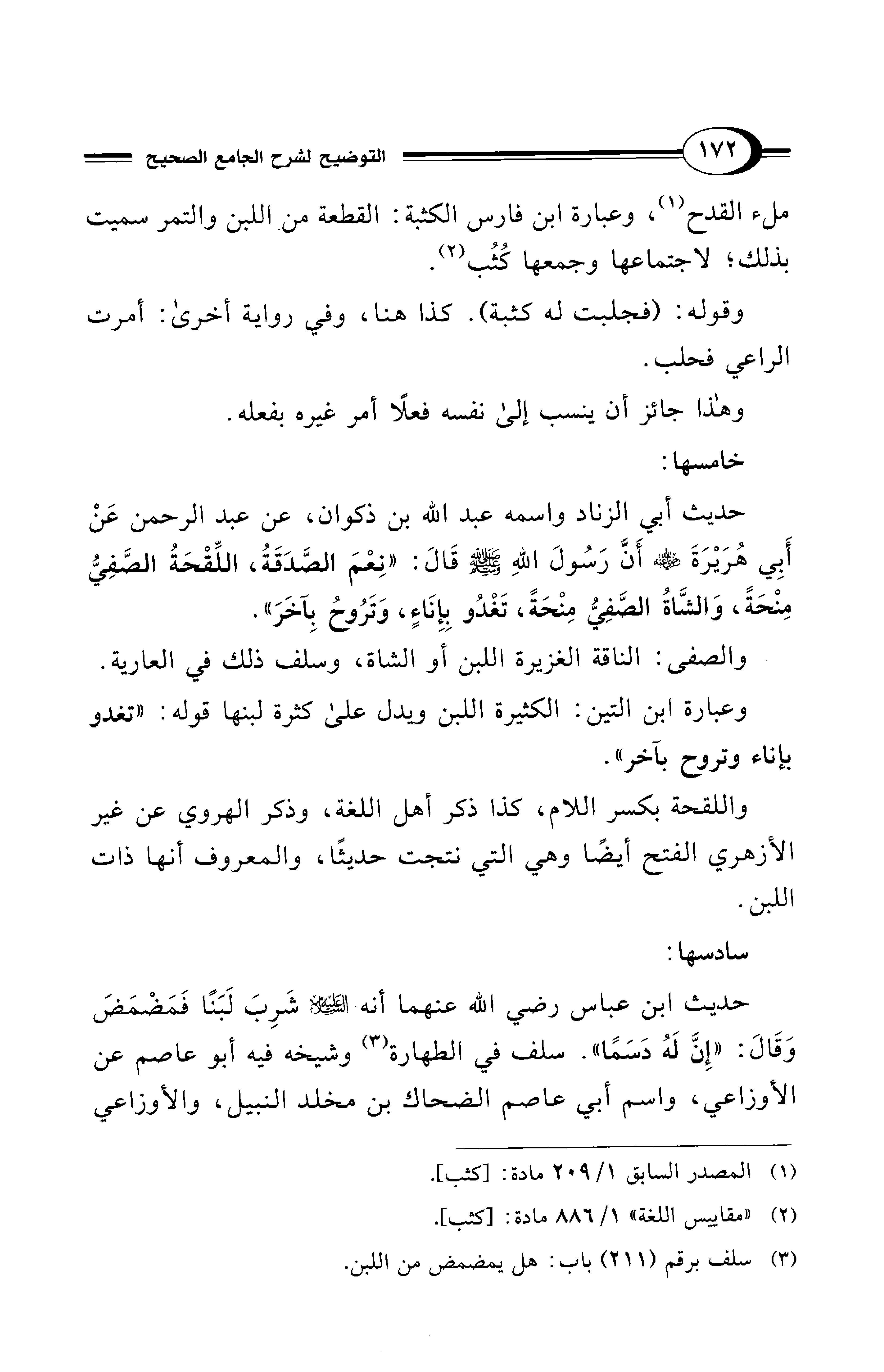 حديث أبي الزناد واسمه عبد الله بن ذكوان، عن عبد الرحمن عَنْ أَبِي هُرَيْرَةَ - رضي الله عنه - أَنَّ رَسُولَ اللهِ - صلى الله عليه وسلم - قَالَ: "نِعْمَ الصَّدَقَةُ، اللِّقْحَةُ الصَّفِيُّ مِنْحَةً، وَالشَّاةُ الصَّفِيُّ مِنْحَةً، تَغْدُو بِإِنَاءٍ، وَتَرُوحُ بِآخَرَ".