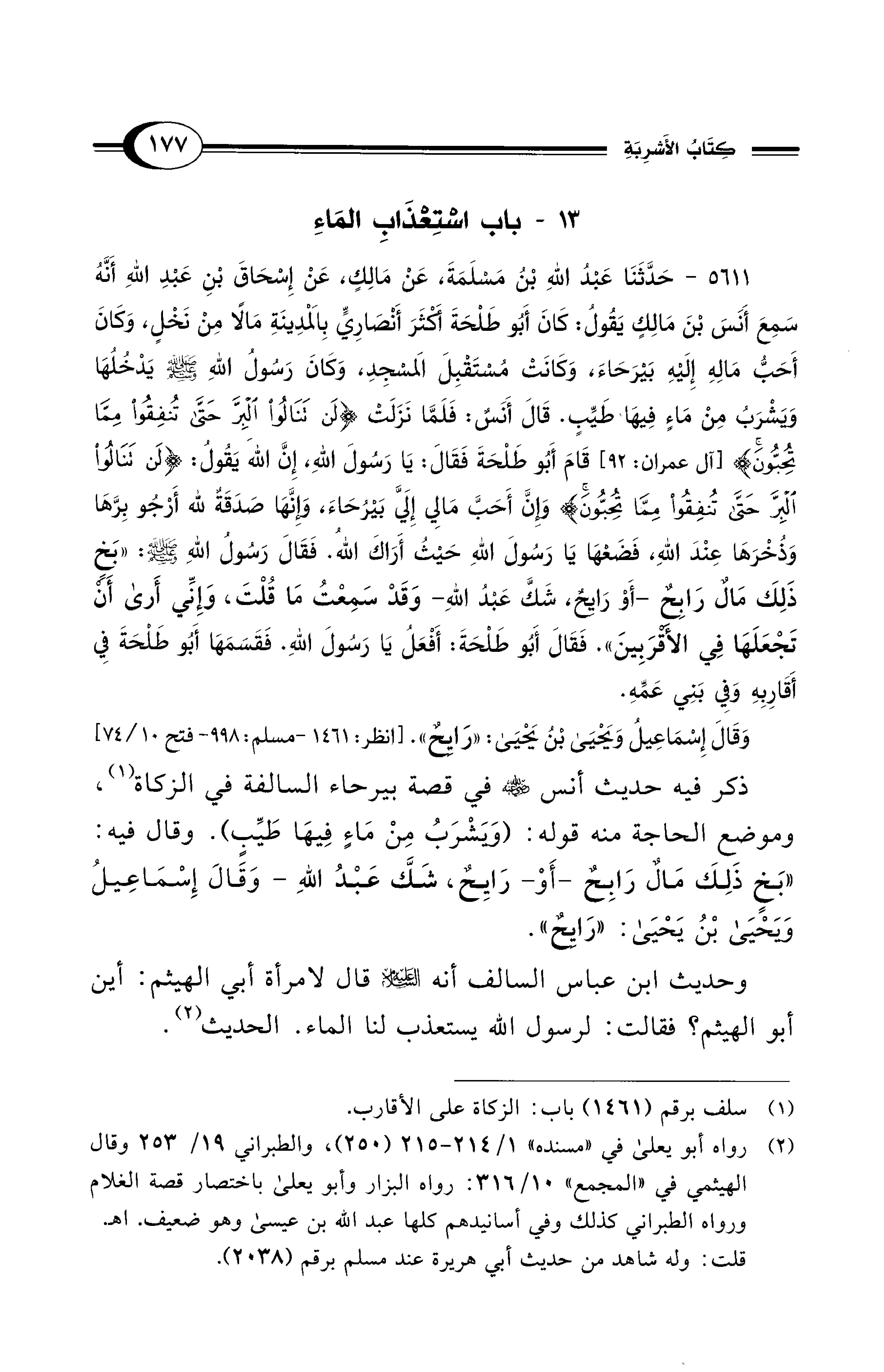 5611 - حَدَّثَنَا عَبْدُ اللهِ بْنُ مَسْلَمَةَ، عَنْ مَالِكٍ، عَنْ إِسْحَاقَ بْنِ عَبْدِ اللهِ أَنَّهُ سَمِعَ أَنَسَ بْنَ مَالِكٍ يَقُولُ: كَانَ أَبُو طَلْحَةَ أَكْثَرَ أَنْصَارِيٍّ بِالْمَدِينَةِ مَالاً مِنْ نَخْلٍ، وَكَانَ أَحَبُّ مَالِهِ إِلَيْهِ بَيْرَحَاءَ، وَكَانَتْ مُسْتَقْبِلَ الْمَسْجِدِ، وَكَانَ رَسُولُ اللهِ - صلى الله عليه وسلم - يَدْخُلُهَا وَيَشْرَبُ مِنْ مَاءٍ فِيهَا طَيِّبٍ. قَالَ أَنَسٌ: فَلَمَّا نَزَلَتْ {لَنْ تَنَالُوا الْبِرَّ حَتَّى تُنْفِقُوا مِمَّا تُحِبُّونَ} [آل عمران:92] قَامَ أَبُو طَلْحَةَ فَقَالَ: يَا رَسُولَ اللهِ، إِنَّ اللهَ يَقُولُ: {لَنْ تَنَالُوا الْبِرَّ حَتَّى تُنْفِقُوا مِمَّا تُحِبُّونَ} وَإِنَّ أَحَبَّ مَالِي إِلَيَّ بَيْرُحَاءَ، وَإِنَّهَا صَدَقَةٌ لِلَّهِ أَرْجُو بِرَّهَا وَذُخْرَهَا عِنْدَ اللهِ، فَضَعْهَا يَا رَسُولَ اللهِ حَيْثُ أَرَاكَ اللهُ. فَقَالَ رَسُولُ اللهِ - صلى الله عليه وسلم -: «بَخٍ ذَلِكَ مَالٌ رَابِحٌ -أَوْ رَايِحٌ، شَكَّ عَبْدُ اللهِ- وَقَدْ سَمِعْتُ مَا قُلْتَ، وَإِنِّي أَرَى أَنْ تَجْعَلَهَا فِي الأَقْرَبِينَ». فَقَالَ أَبُو طَلْحَةَ: أَفْعَلُ يَا رَسُولَ اللهِ، فَقَسَمَهَا أَبُو طَلْحَةَ فِي أَقَارِبِهِ وَفِي بَنِي عَمِّهِ.