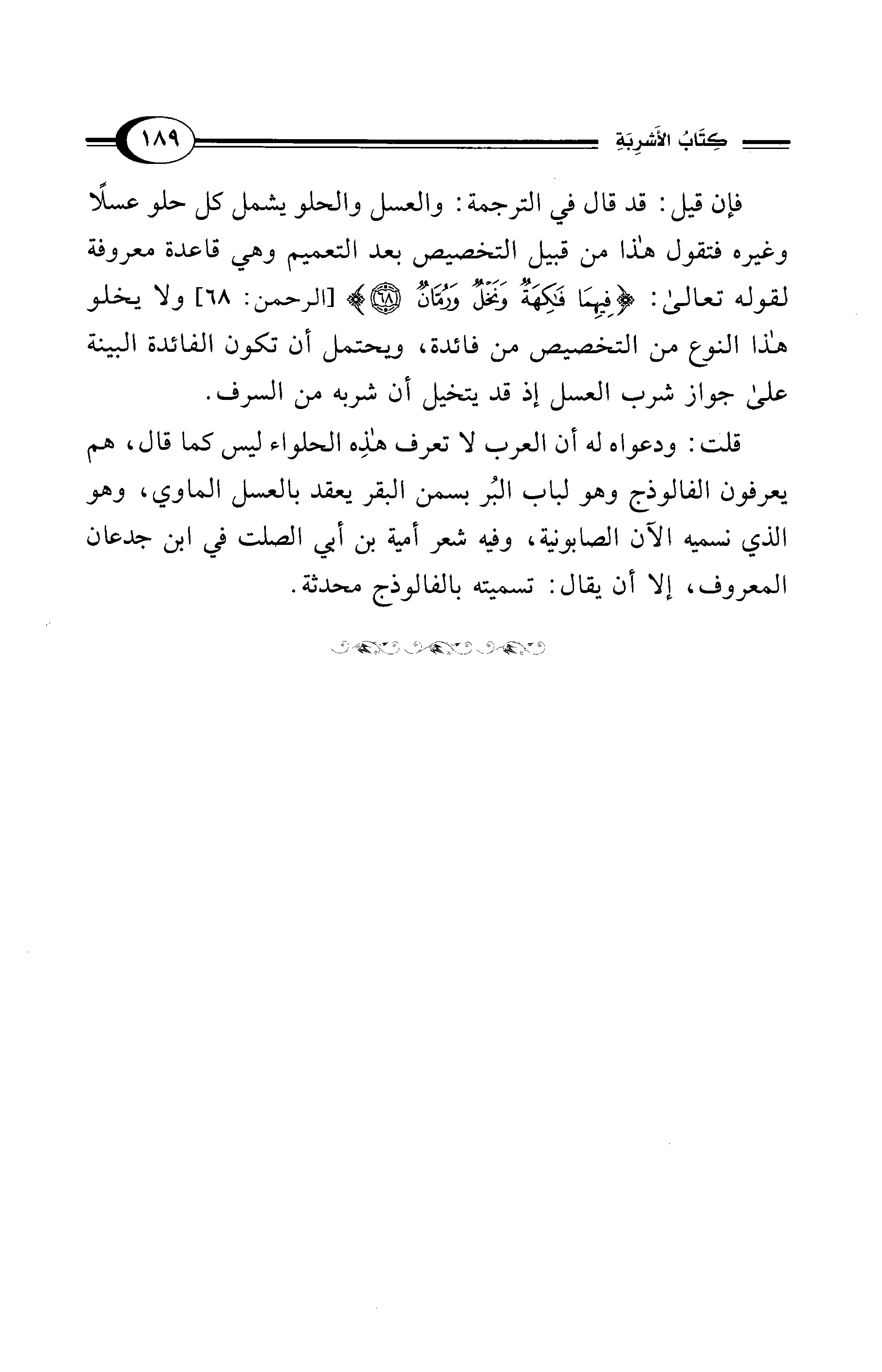 قلت: ودعواه له أن العرب لا تعرف هذِه الحلواء ليس كما قال، هم يعرفون الفالوذج وهو لباب البُر بسمن البقر يعقد بالعسل الماوي، وهو الذي نسميه الآن الصابونية، وفيه شعر أمية بن أبي الصلت في ابن جدعان المعروف، إلا أن يقال: تسميته بالفالوذج محدثة.