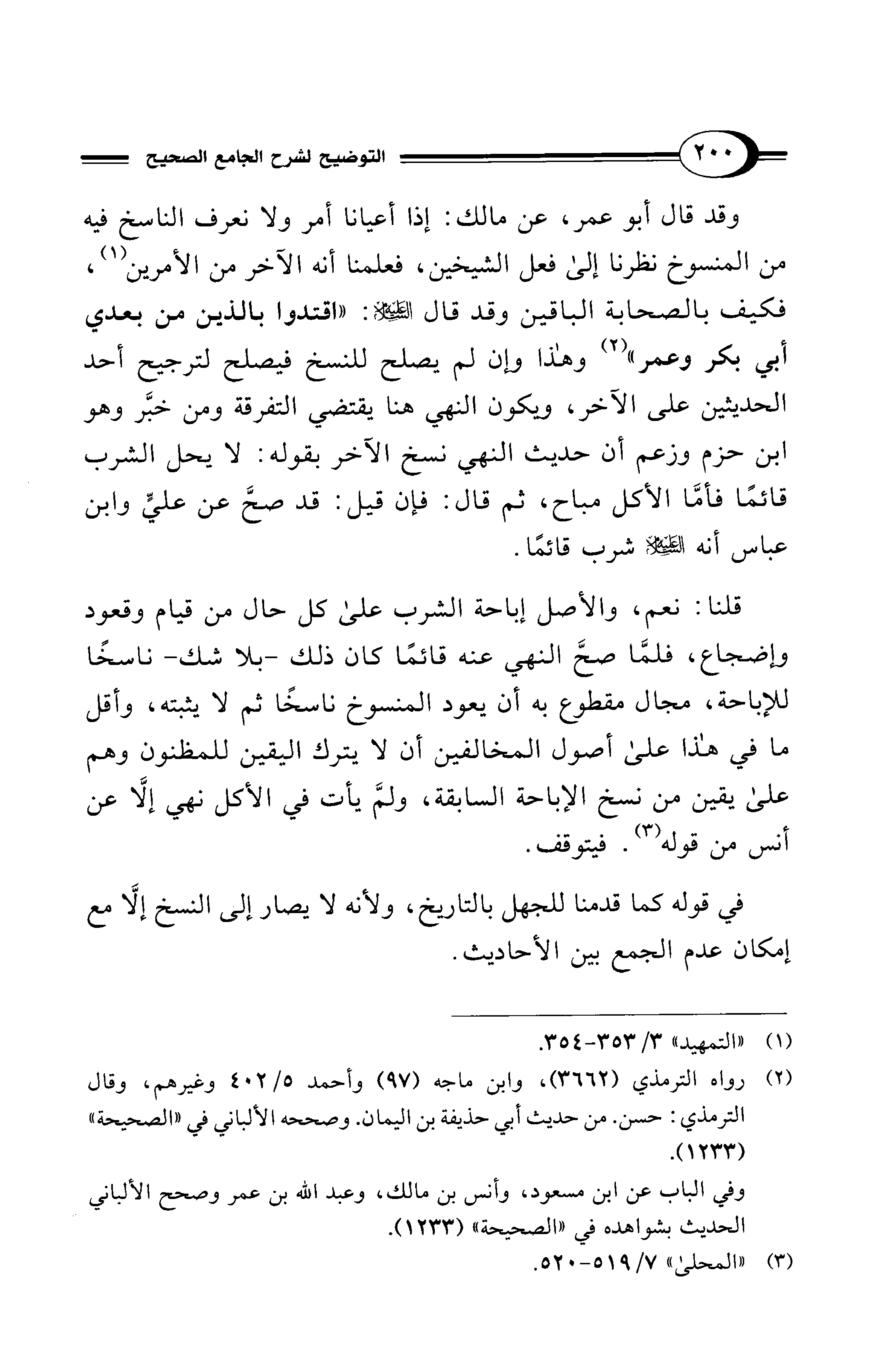 وقد قال أبو عمر، عن مالك: إذا أعيانا أمر ولا نعرف الناسخ فيه من المنسوخ نظرنا إلى فعل الشيخين، فعلمنا أنه الآخر من الأمرين (¬1)، فكيف بالصحابة الباقين وقد قال - عليه السلام -: "اقتدوا بالذين من بعدي أبي بكر وعمر" (¬2) وهذا وإن لم يصلح للنسخ فيصلح لترجيح أحد الحديثين على الآخر، ويكون النهي هنا يقتضي التفرقة ومن خبَّر وهو ابن حزم وزعم أن حديث النهي نسخ الآخر بقوله: لا يحل الشرب قائمًا فأمَّا الأكل مباح، ثم قال: فإن قيل: قد صحَّ عن عليٍّ وابن عباس أنه - عليه السلام - شرب قائمًا.