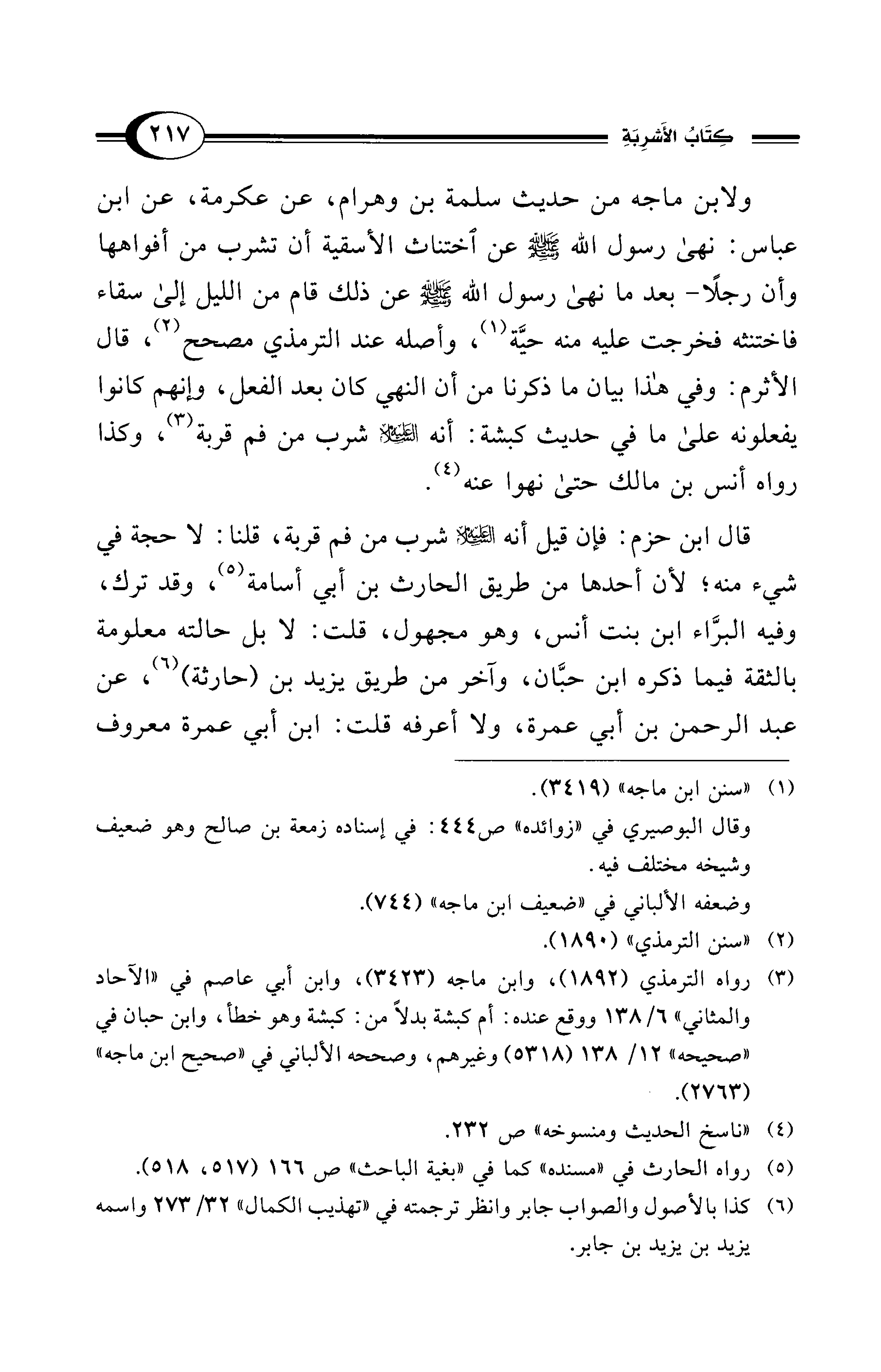 ولابن ماجه من حديث سلمة بن وهرام، عن عكرمة، عن ابن عباس: نهى رسول الله - صلى الله عليه وسلم - عن اختناث الأسقية أن تشرب من أفواهها وأن رجلاً- بعد ما نهى رسول الله - صلى الله عليه وسلم - عن ذلك قام من الليل إلى سقاء فاختنثه فخرجت عليه منه حيَّة (¬1)، وأصله عند الترمذي مصحح (¬2)، قال الأثرم: وفي هذا بيان ما ذكرنا من أن النهي كان بعد الفعل، وإنهم كانوا يفعلونه على ما في حديث كبشة: أنه - عليه السلام - شرب من فم قربة (¬3)، وكذا رواه أنس بن مالك حتى نهوا عنه (¬4).