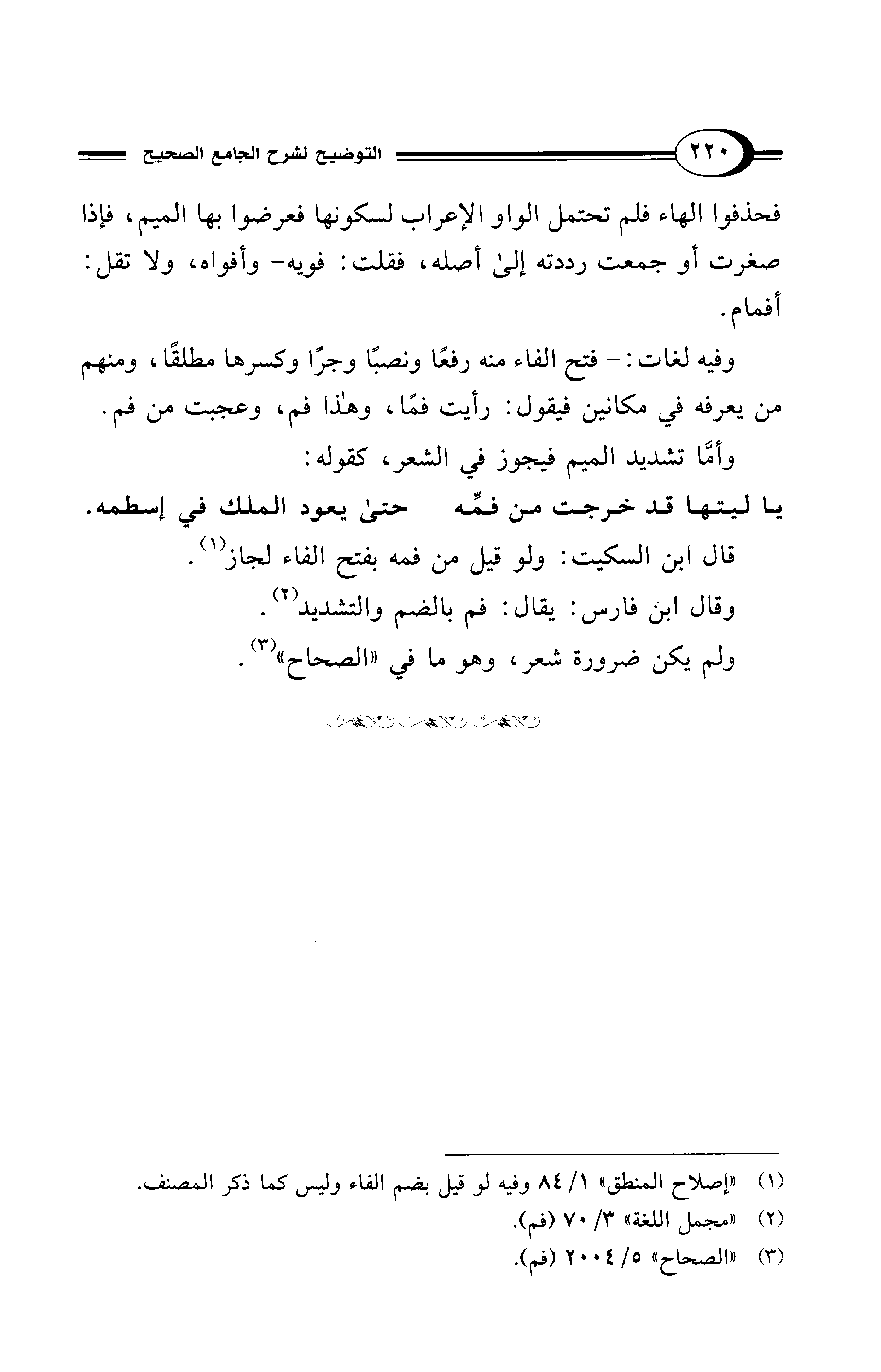 وفيه لغات: - فتح الفاء منه رفعًا ونصبًا وجرًا وكسرها مطلقًا، ومنهم من يعرفه في مكانين فيقول: رأيت فمًا، وهذا فم، وعجبت من فم.