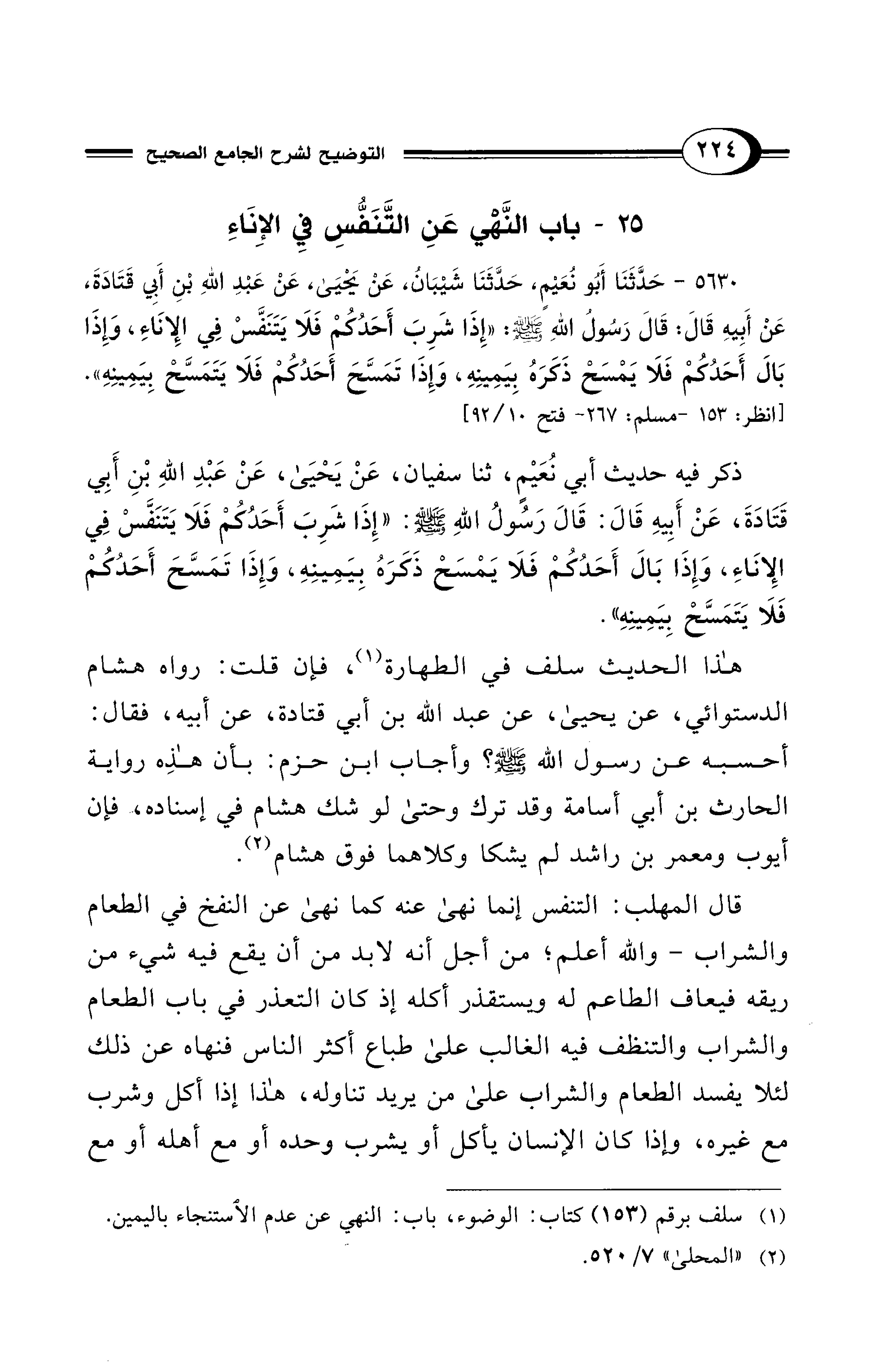 5630 - حَدَّثَنَا أَبُو نُعَيْمٍ، حَدَّثَنَا شَيْبَانُ، عَنْ يَحْيَى، عَنْ عَبْدِ اللهِ بْنِ أَبِي قَتَادَةَ، عَنْ أَبِيهِ قَالَ: قَالَ رَسُولُ اللهِ - صلى الله عليه وسلم -: «إِذَا شَرِبَ أَحَدُكُمْ فَلاَ يَتَنَفَّسْ فِي الإِنَاءِ، وَإِذَا بَالَ أَحَدُكُمْ فَلاَ يَمْسَحْ ذَكَرَهُ بِيَمِينِهِ، وَإِذَا تَمَسَّحَ أَحَدُكُمْ فَلاَ يَتَمَسَّحْ بِيَمِينِهِ». [انظر: 153 - مسلم: 267 - فتح 10/ 92]