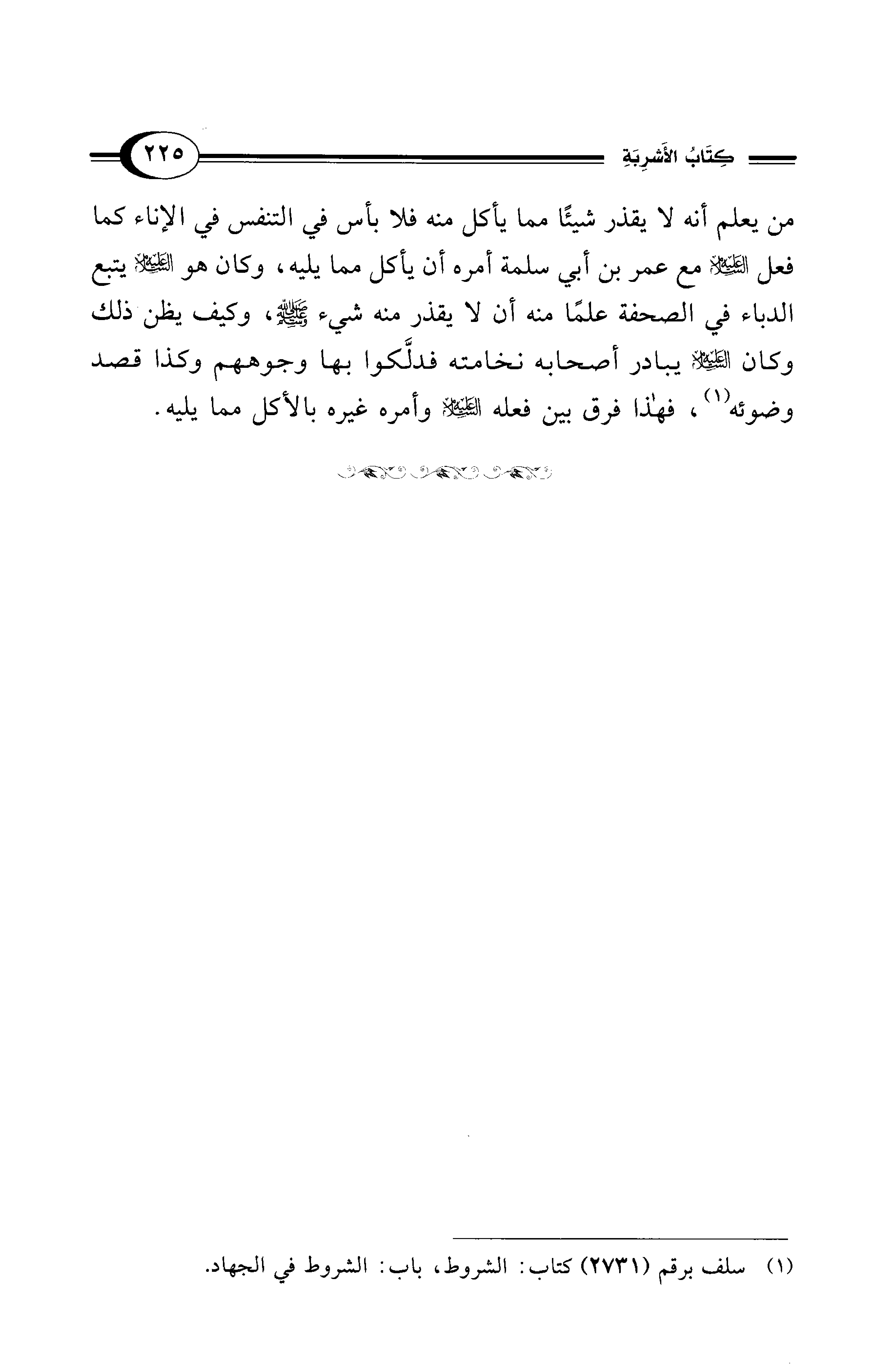 من يعلم أنه لا يقذر شيئًا مما يأكل منه فلا بأس في التنفس في الإناء كما فعل - عليه السلام - مع عمر بن أبي سلمة أمره أن يأكل مما يليه، وكان هو - عليه السلام - يتبع الدباء في الصحفة علمًا منه أن لا يقذر منه شيء - عليه السلام -، وكيف يظن ذلك وكان - عليه السلام - يبادر أصحابه نخامته فدلَّكوا بها وجوههم وكذا قصد وضوئه (¬1)، فهذا فرق بين فعله - عليه السلام - وأمره غيره بالأكل مما يليه.