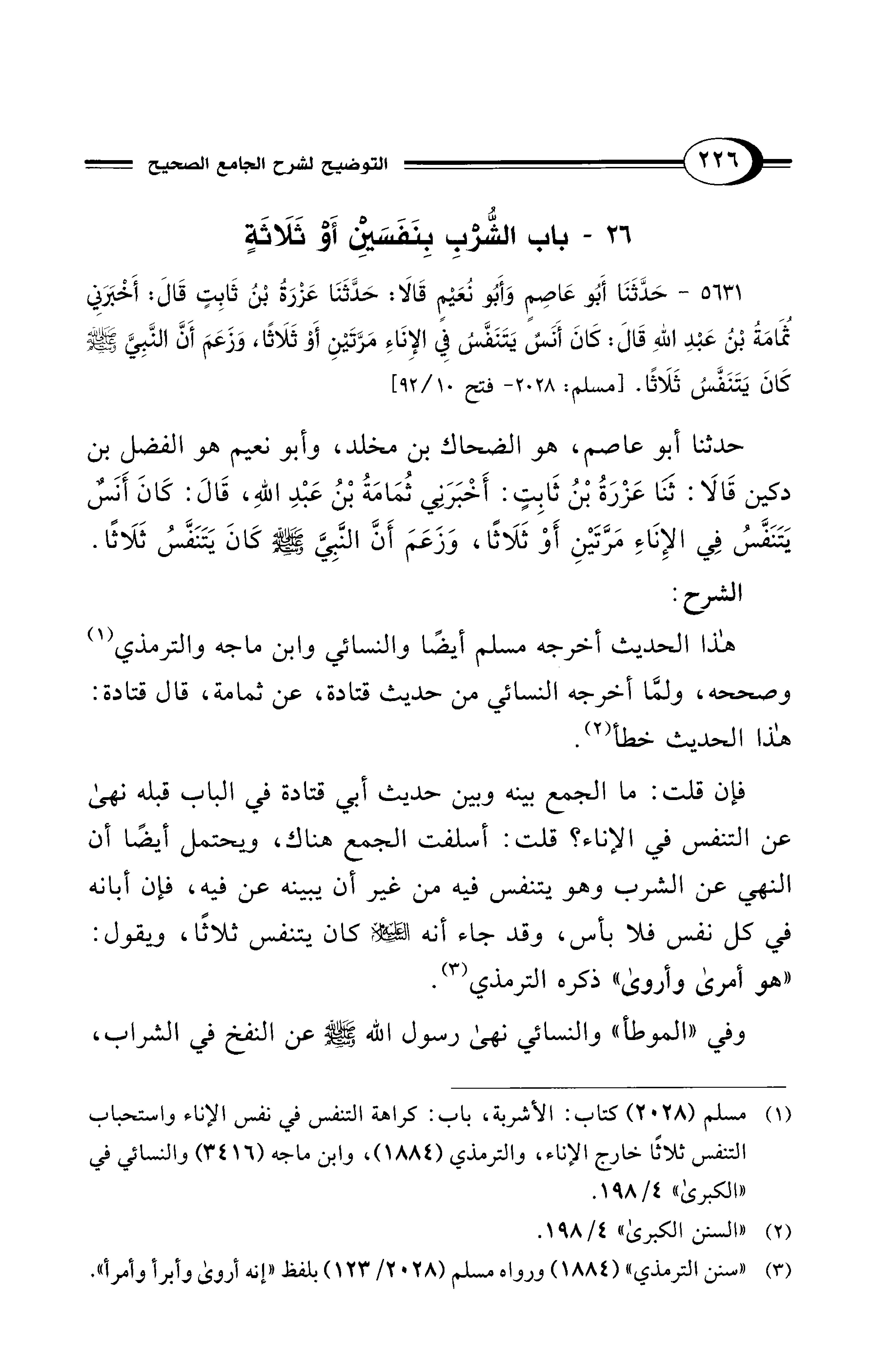حدثنا أبو عاصم، هو الضحاك بن مخلد، وأبو نعيم هو الفضل بن دكين قَالَا: ثَنَا عَزْرَةُ بْنُ ثَابِتٍ: أَخْبَرَنِي ثُمَامَةُ بْنُ عَبْدِ اللهِ، قَالَ: كَانَ أَنَسٌ يَتَنَفَّسُ فِي الإِنَاءِ مَرَّتَيْنِ أَوْ ثَلَاثًا، وَزَعَمَ أَنَّ النَّبِيَّ - صلى الله عليه وسلم - كَانَ يَتَنَفَّسُ ثَلَاثًا.