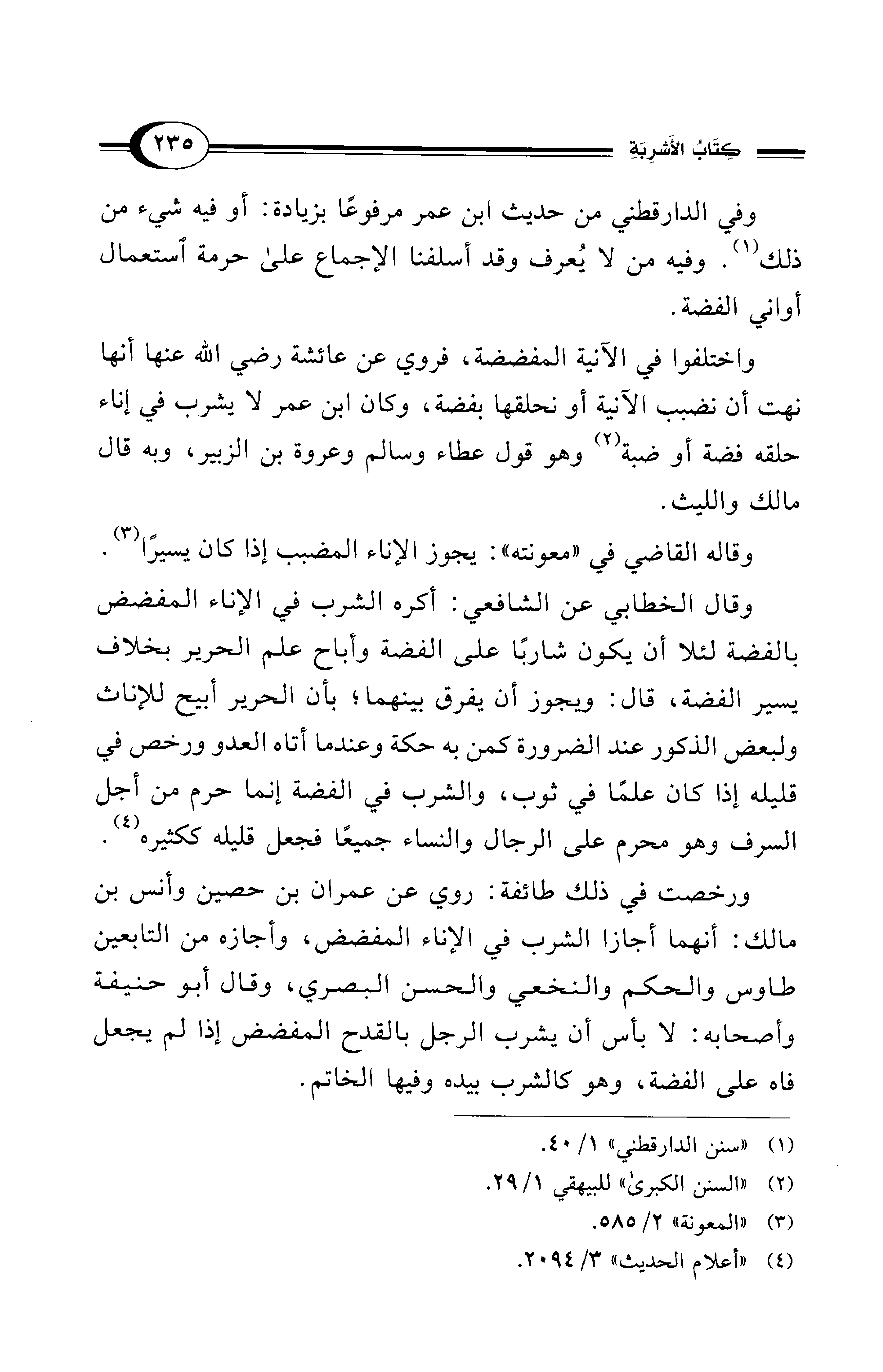 واختلفوا في الآنية المفضضة، فروي عن عائشة - رضي الله عنها - أنها نهت أن نضبب الآنية أو نحلقها بفضة، وكان ابن عمر لا يشرب في إناء حلقه فضة أو ضبة (¬2) وهو قول عطاء وسالم وعروة بن الزبير، وبه قال مالك والليث.