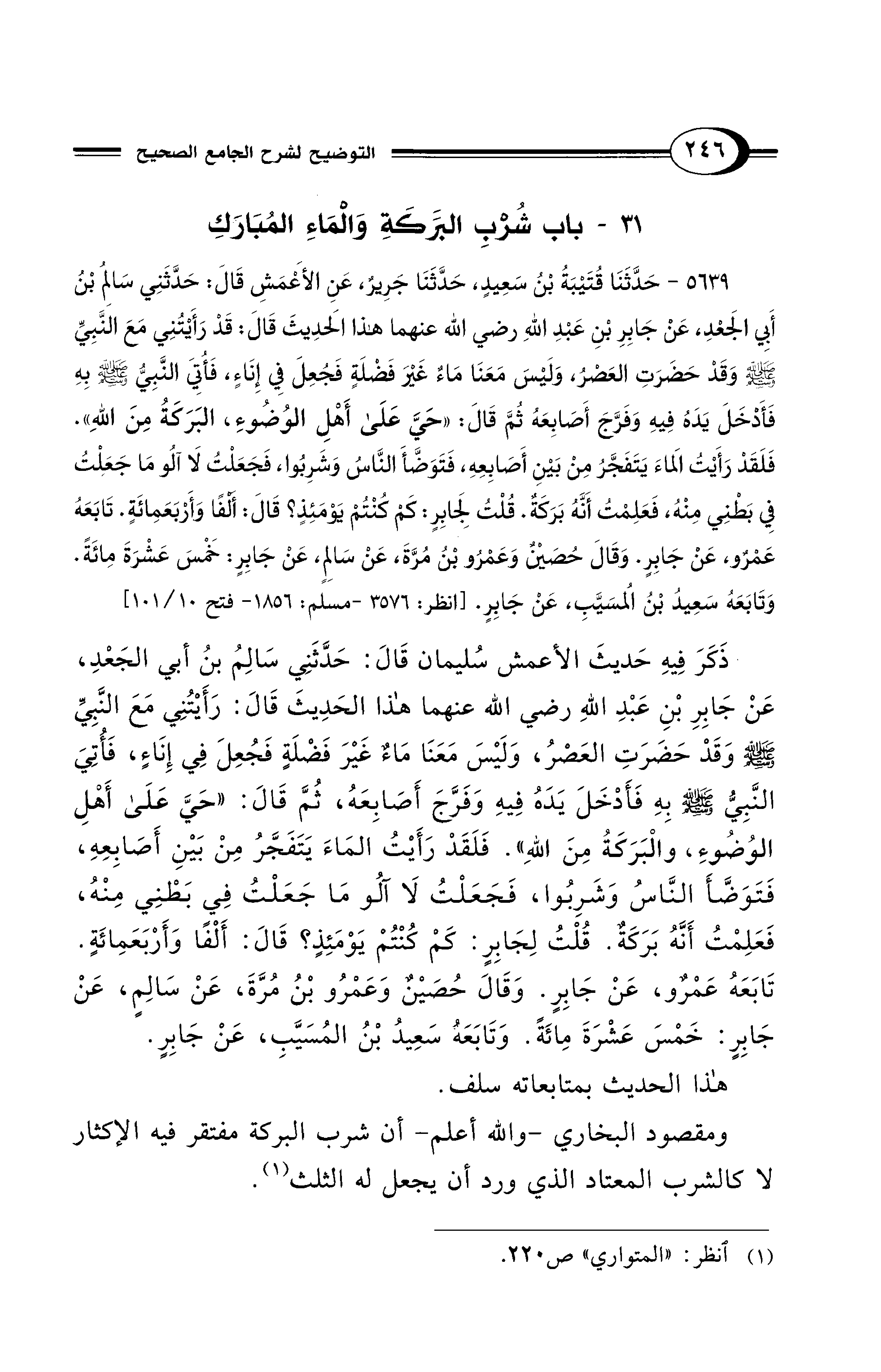 ذَكَرَ فِيهِ حَديثَ الأعمش سُليمان قَالَ: حَدَّثَنِي سَالِمُ بنُ أبي الجَعْدِ، عَنْ جَابِرِ بْنِ عَبْدِ اللهِ - رضي الله عنهما - هذا الحَدِيثَ قَالَ: رَأَيْتُنِي مَعَ النَّبِيِّ - صلى الله عليه وسلم - وقَدْ حَضَرَتِ العَصْرُ، وَلَيْسَ مَعَنَا مَاءٌ غَيْرَ فَضْلَةٍ فَجُعِلَ فِي إِنَاءٍ، فَأُتِيَ النَّبِيُّ - صلى الله عليه وسلم - بِهِ فَأَدْخَلَ يَدَهُ فِيهِ وَفَرَّجَ أَصَابِعَهُ، ثُمَّ قَالَ: "حَيَّ عَلَى أَهْلِ الوُضُوءِ، والْبَرَكَةُ مِنَ اللهِ". فَلَقَدْ رَأَيْتُ المَاءَ يَتَفَجَّرُ مِنْ بَيْنِ أَصَابِعِهِ، فَتَوَضَّأَ النَّاسُ وَشَرِبُوا، فَجَعَلْتُ لَا آلُو مَا جَعَلْتُ في بَطْنِي مِنْهُ، فَعَلِمْتُ أَنَّهُ بَرَكَةٌ. قُلْتُ لِجَابِرٍ: كَمْ كُنْتُمْ يَوْمَئِذٍ؟ قَالَ: أَلْفًا وَأَرْبَعَمِائَةٍ. تَابَعَهُ عَمْروٌ، عَنْ جَابِرٍ. وَقَالَ حُصَيْنٌ وَعَمْرُو بْنُ مُرَّةَ، عَنْ سَالِمٍ، عَنْ جَابِرٍ: خَمْسَ عَشْرَةَ مِائَةً. وَتَابَعَهُ سَعِيدُ بْنُ المُسَيَّبِ، عَنْ جَابِرٍ.