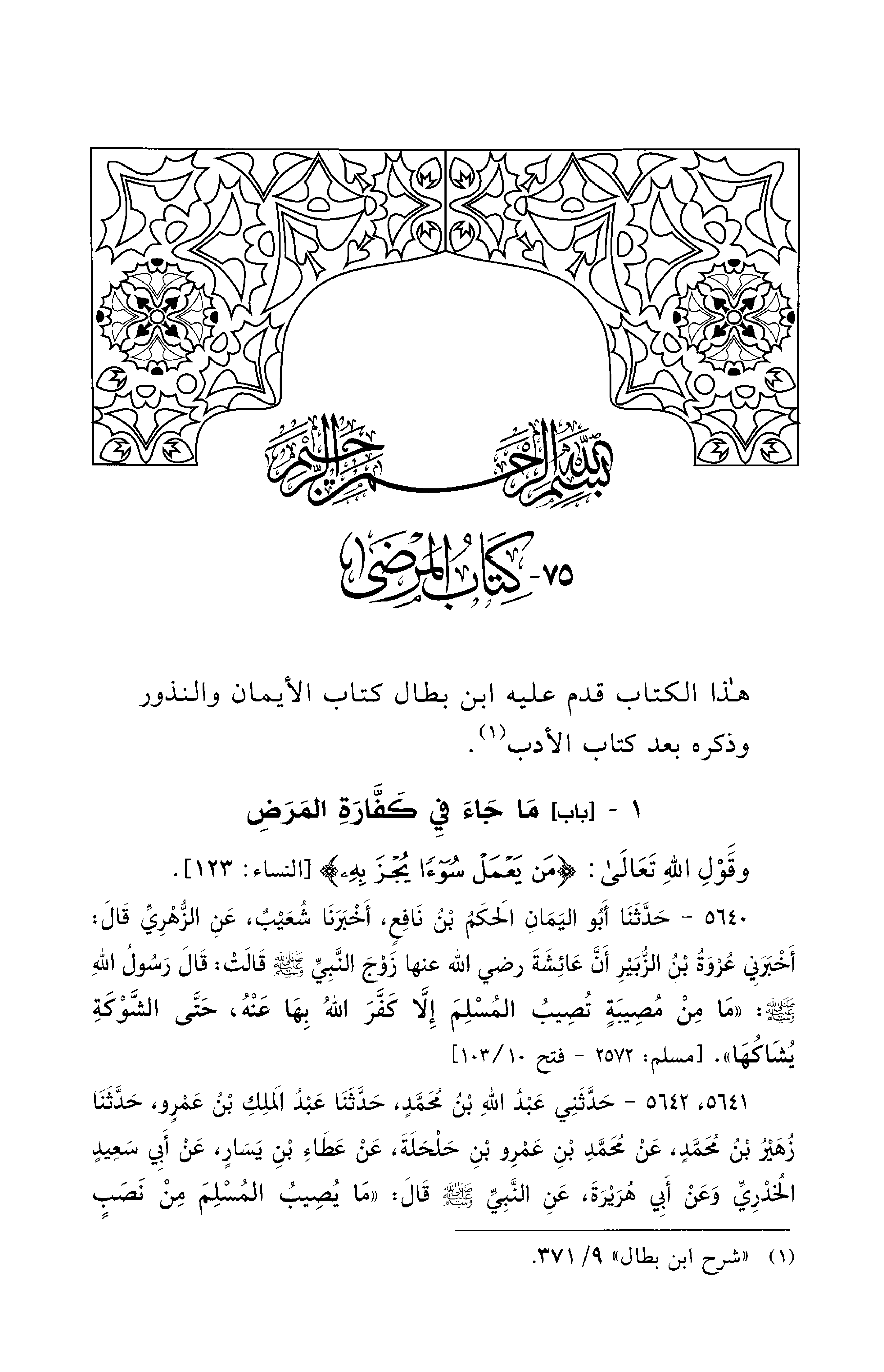 5640 - حَدَّثَنَا أَبُو الْيَمَانِ الْحَكَمُ بْنُ نَافِعٍ، أَخْبَرَنَا شُعَيْبٌ، عَنِ الزُّهْرِيِّ قَالَ: أَخْبَرَنِي عُرْوَةُ بْنُ الزُّبَيْرِ أَنَّ عَائِشَةَ - رضي الله عنها - زَوْجَ النَّبِيِّ - صلى الله عليه وسلم - قَالَتْ: قَالَ رَسُولُ اللهِ - صلى الله عليه وسلم -: «مَا مِنْ مُصِيبَةٍ تُصِيبُ الْمُسْلِمَ إِلاَّ كَفَّرَ اللهُ بِهَا عَنْهُ، حَتَّى الشَّوْكَةِ يُشَاكُهَا». [مسلم: 2572 - فتح 10/ 103]