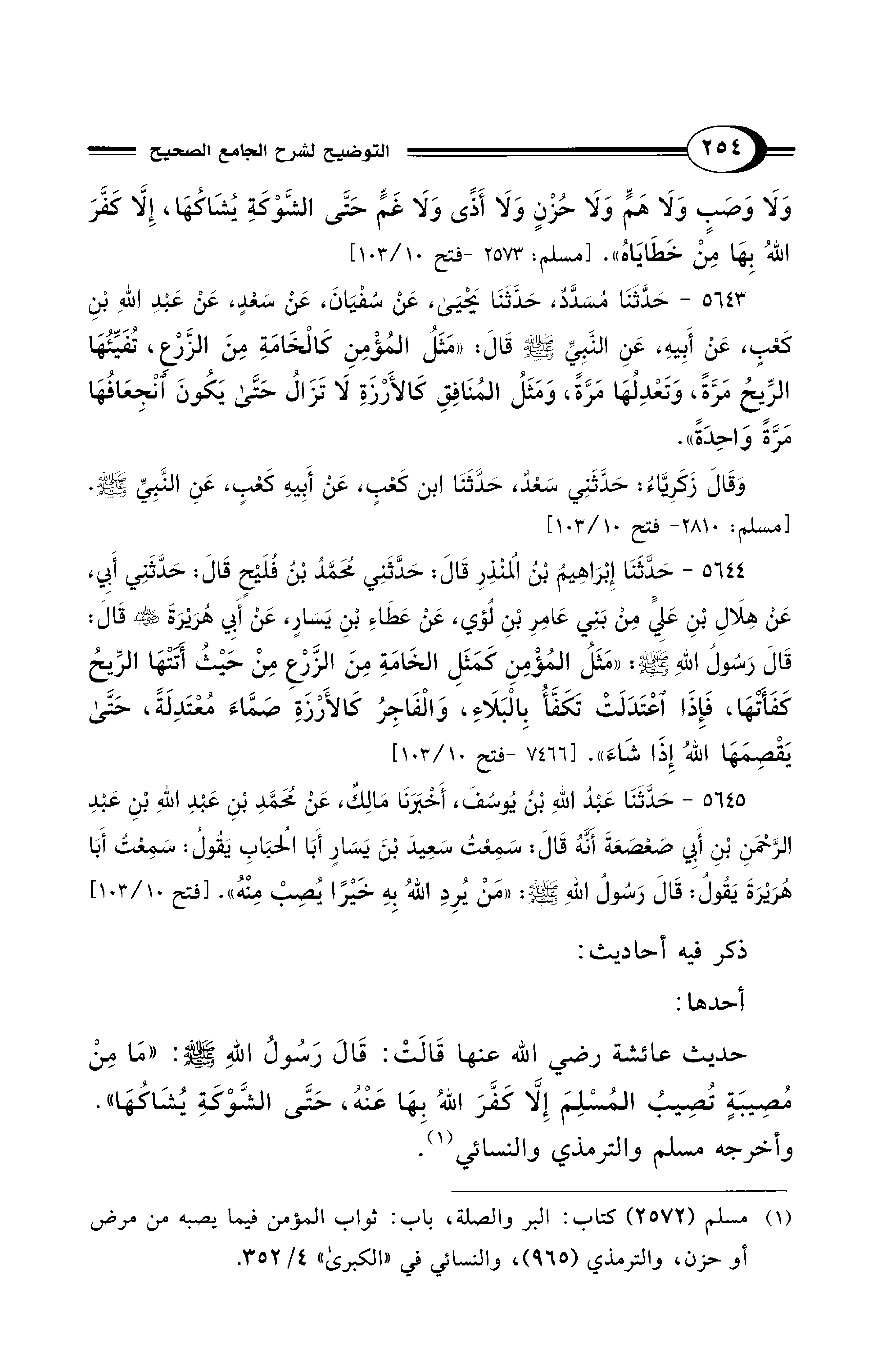 حديث عائشة - رضي الله عنها - قَالَتْ: قَالَ رَسُولُ اللهِ - صلى الله عليه وسلم -: "مَا مِنْ مُصِيبَةٍ تُصِيبُ المُسْلِمَ إِلَّا كَفَّرَ اللهُ بِهَا عَنْهُ، حَتَّى الشَّوْكَةِ يُشَاكُهَا". وأخرجه مسلم والترمذي والنسائي (¬1).