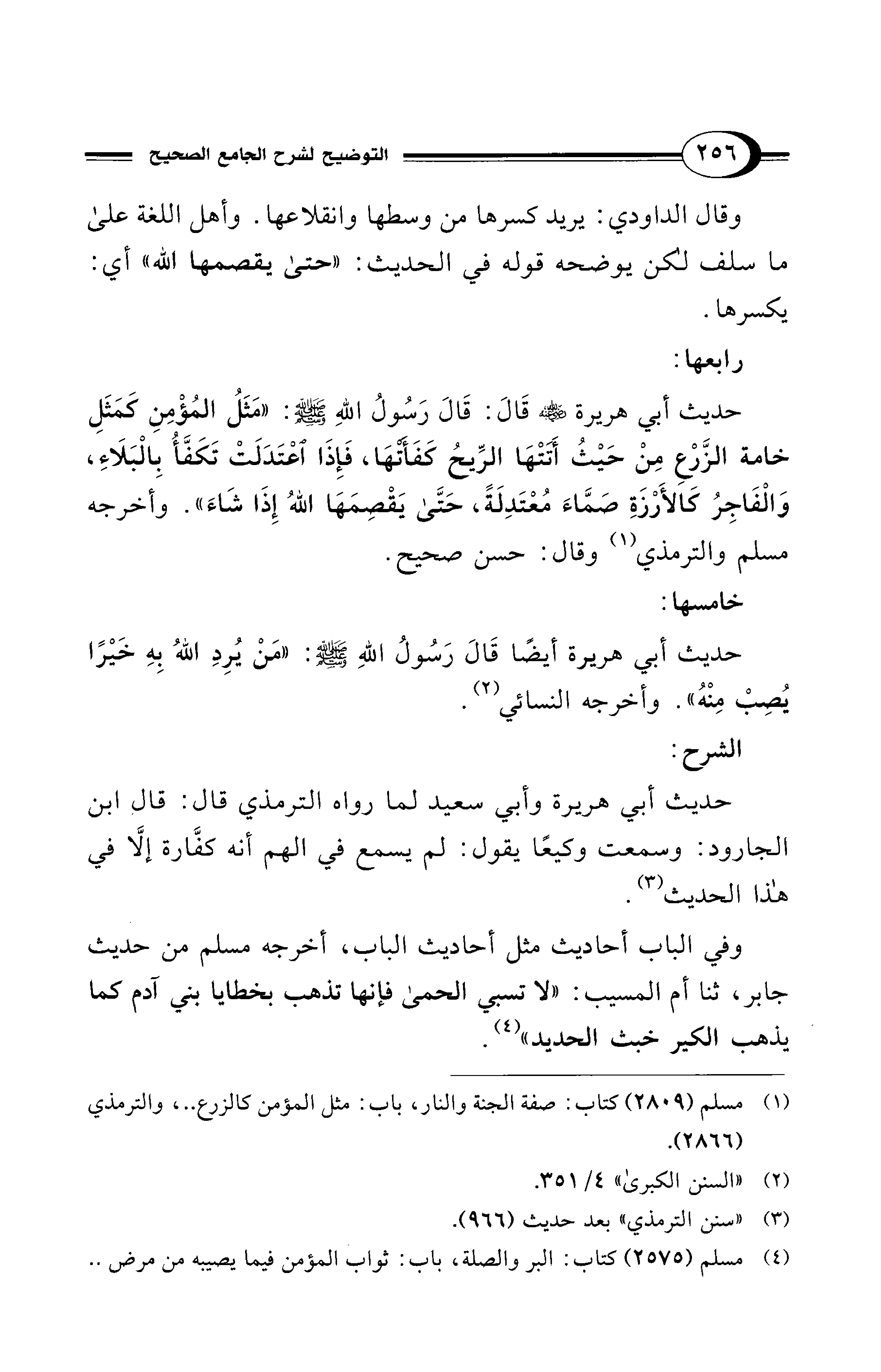 حديث أبي هريرة - رضي الله عنه - قَالَ: قَالَ رَسُولُ اللهِ - صلى الله عليه وسلم -: "مَثَلُ المُؤْمِنِ كَمَثَلِ خامة الزَّرْعِ مِنْ حَيْثُ أَتَتْهَا الرِّيحُ كَفَأَتْهَا، فَإِذَا اعْتَدَلَتْ تَكَفَّأُ بِالْبَلَاءِ، وَالْفَاجِرُ كَالأَرْزَةِ صَمَّاءَ مُعْتَدِلَةً، حَتَّى يَقْصِمَهَا اللهُ إِذَا شَاءَ". وأخرجه مسلم والترمذي (¬1) وقال: حسن صحيح.
