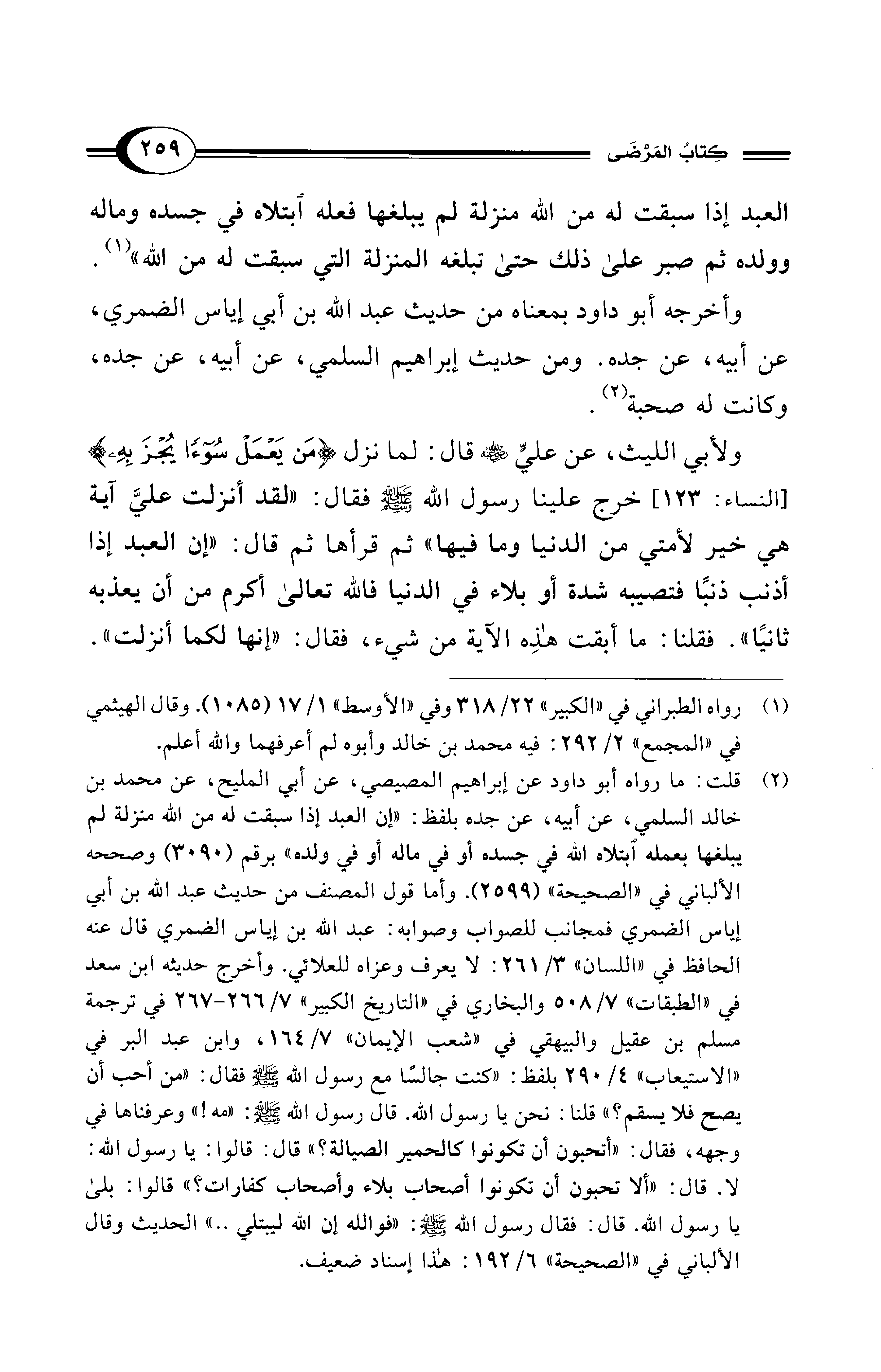 (¬2) قلت: ما رواه أبو داود عن إبراهيم المصيصي، عن أبي المليح، عن محمد بن خالد السلمي، عن أبيه، عن جده بلفظ: "إن العبد إذا سبقت له من الله منزلة لم يبلغها بعمله ابتلاه الله في جسده أو في ماله أو في ولده" برقم (3090) وصححه الألباني في "الصحيحة" (2599). وأما قول المصنف من حديث عبد الله بن أبي إياس الضمري فمجانب للصواب وصوابه: عبد الله بن إياس الضمري قال عنه الحافظ في "اللسان" 3/ 261: لا يعرف وعزاه للعلائي. وأخرج حديثه ابن سعد في "الطبقات" 7/ 508 والبخاري في "التاريخ الكبير" 7/ 266 - 267 في ترجمة مسلم بن عقيل والبيهقي في "شعب الإيمان" 7/ 164، وابن عبد البر في "الاستيعاب" 4/ 290 بلفظ: "كنت جالسًا مع رسول الله - صلى الله عليه وسلم - فقال: "من أحب أن يصح فلا يسقم؟ " قلنا: نحن يا رسول الله. قال رسول الله - صلى الله عليه وسلم -: "مه! " وعرفناها في وجهه، فقال: "أتحبون أن تكونوا كالحمير الصيالة؟ " قال: قالوا: يا رسول الله: لا. قال: "ألا تحبون أن تكونوا أصحاب بلاء وأصحاب كفارات؟ " قالوا: بلى يا رسول الله. قال: فقال رسول الله - صلى الله عليه وسلم -: "فوالله إن الله ليبتلي .. " الحديث وقال الألباني في "الصحيحة" 6/ 192: هذا إسناد ضعيف.