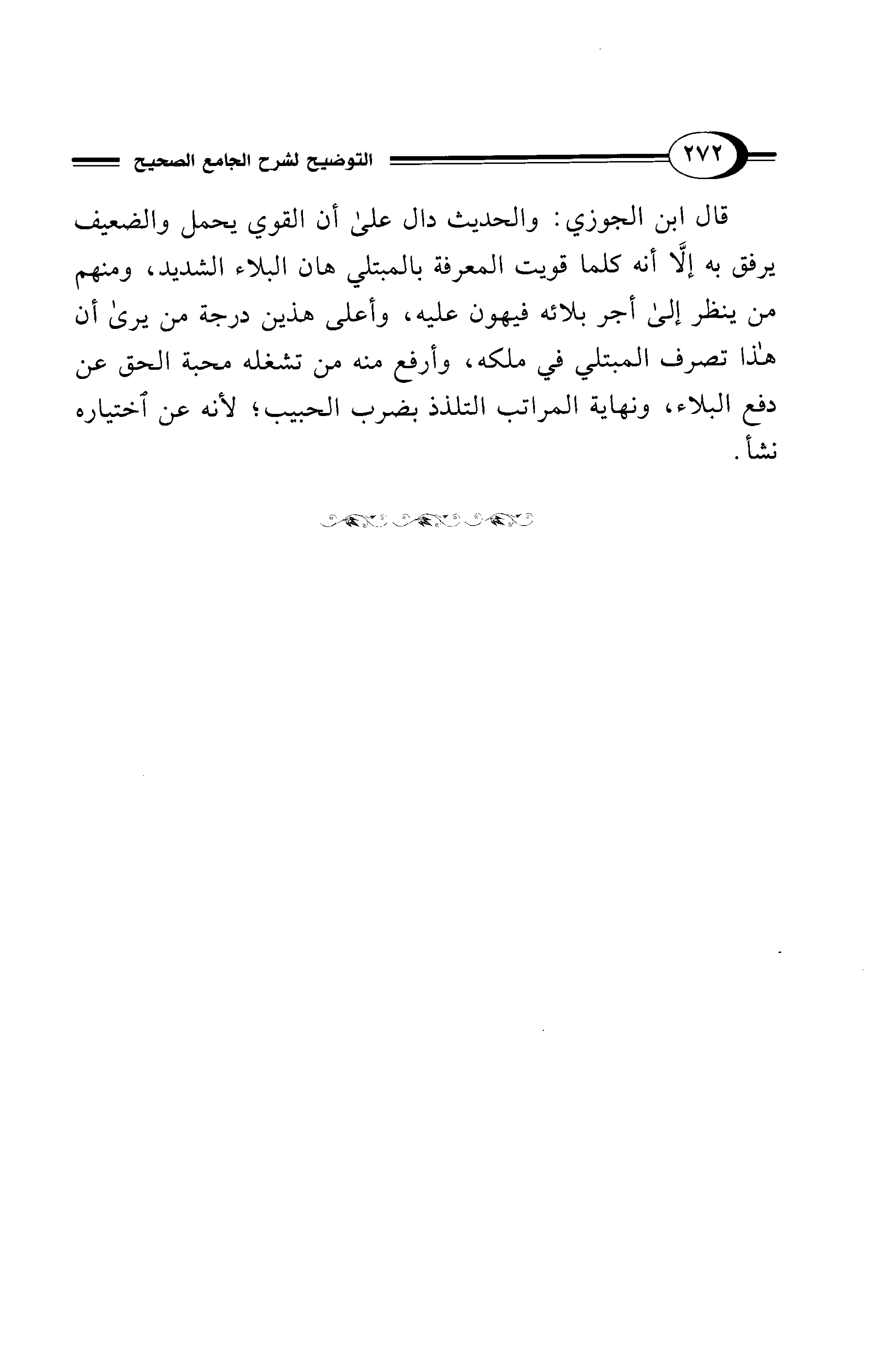 قال ابن الجوزي: والحديث دال على أن القوي يحمل والضعيف يرفق به إلاَّ أنه كلما قويت المعرفة بالمبتلي هان البلاء الشديد، ومنهم من ينظر إلى أجر بلائه فيهون عليه، وأعلى هذين درجة من يرى أن هذا تصرف المبتلي في ملكه، وأرفع منه من تشغله محبة الحق عن دفع البلاء، ونهاية المراتب التلذذ بضرب الحبيب؛ لأنه عن اختياره نشأ.