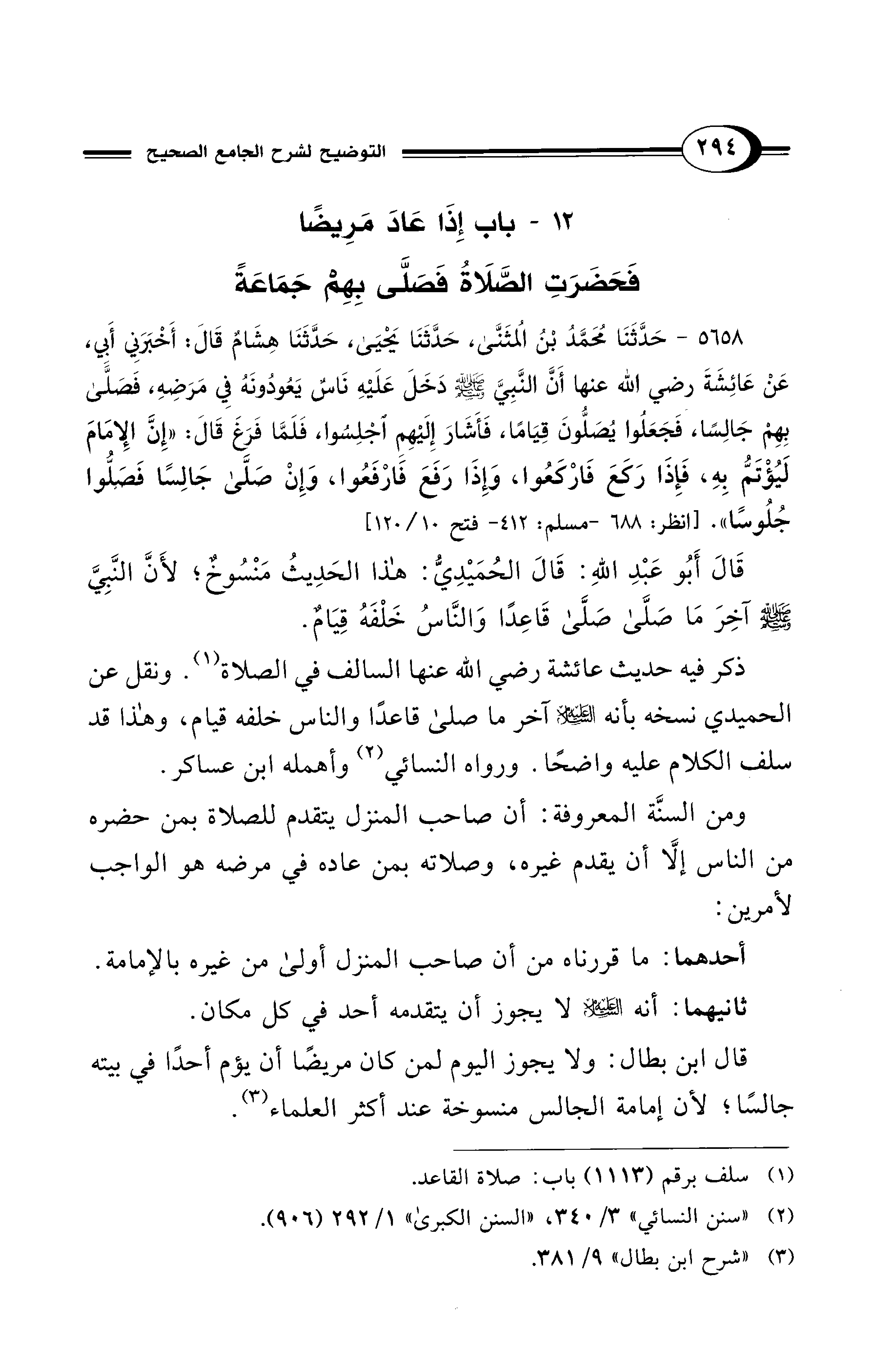 قَالَ أَبُو عَبْدِ اللهِ: قَالَ الْحُمَيْدِيُّ: هَذَا الْحَدِيثُ مَنْسُوخٌ؛ لأَنَّ النَّبِيَّ - صلى الله عليه وسلم - آخِرَ مَا صَلَّى صَلَّى قَاعِدًا وَالنَّاسُ خَلْفَهُ قِيَامٌ.