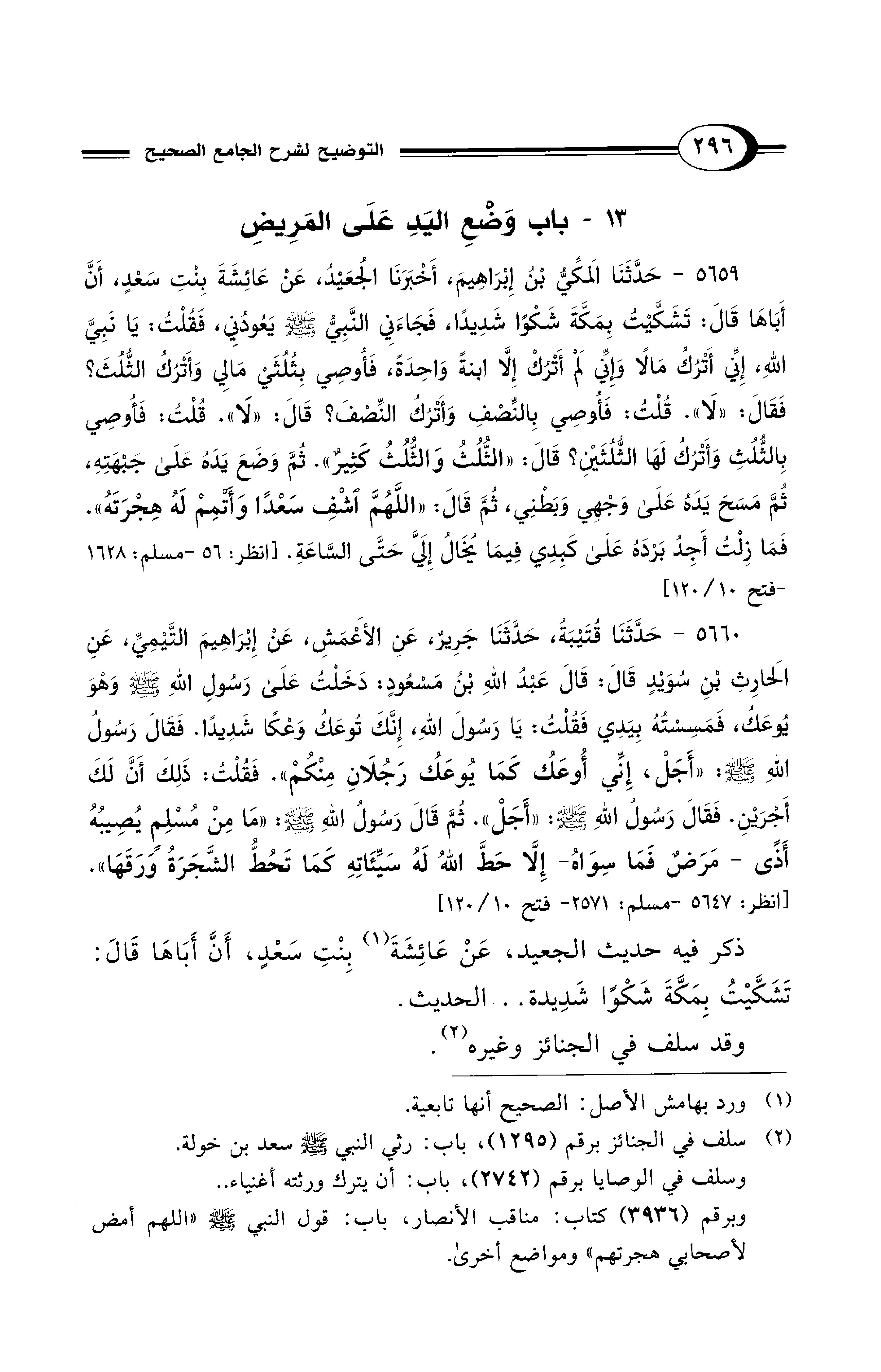 5659 - حَدَّثَنَا الْمَكِّيُّ بْنُ إِبْرَاهِيمَ، أَخْبَرَنَا الْجُعَيْدُ، عَنْ عَائِشَةَ بِنْتِ سَعْدٍ، أَنَّ أَبَاهَا قَالَ: تَشَكَّيْتُ بِمَكَّةَ شَكْوًا شَدِيدًا، فَجَاءَنِي النَّبِيُّ - صلى الله عليه وسلم - يَعُودُنِي، فَقُلْتُ: يَا نَبِيَّ اللهِ، إِنِّي أَتْرُكُ مَالاً وَإِنِّي لَمْ أَتْرُكْ إِلاَّ ابْنَةً وَاحِدَةً، فَأُوصِي بِثُلُثَيْ مَالِي وَأَتْرُكُ الثُّلُثَ؟ فَقَالَ: «لاَ». قُلْتُ: فَأُوصِي بِالنِّصْفِ وَأَتْرُكُ النِّصْفَ؟ قَالَ: «لاَ». قُلْتُ: فَأُوصِي بِالثُّلُثِ وَأَتْرُكُ لَهَا الثُّلُثَيْنِ؟ قَالَ: «الثُّلُثُ وَالثُّلُثُ كَثِيرٌ». ثُمَّ وَضَعَ يَدَهُ عَلَى جَبْهَتِهِ، ثُمَّ مَسَحَ يَدَهُ عَلَى وَجْهِي وَبَطْنِي، ثُمَّ قَالَ: «اللَّهُمَّ اشْفِ سَعْدًا وَأَتْمِمْ لَهُ هِجْرَتَهُ». فَمَا زِلْتُ أَجِدُ بَرْدَهُ عَلَى كَبِدِي فِيمَا يُخَالُ إِلَيَّ حَتَّى السَّاعَةِ. [انظر: 56 - مسلم: 1628 - فتح 10/ 120]
