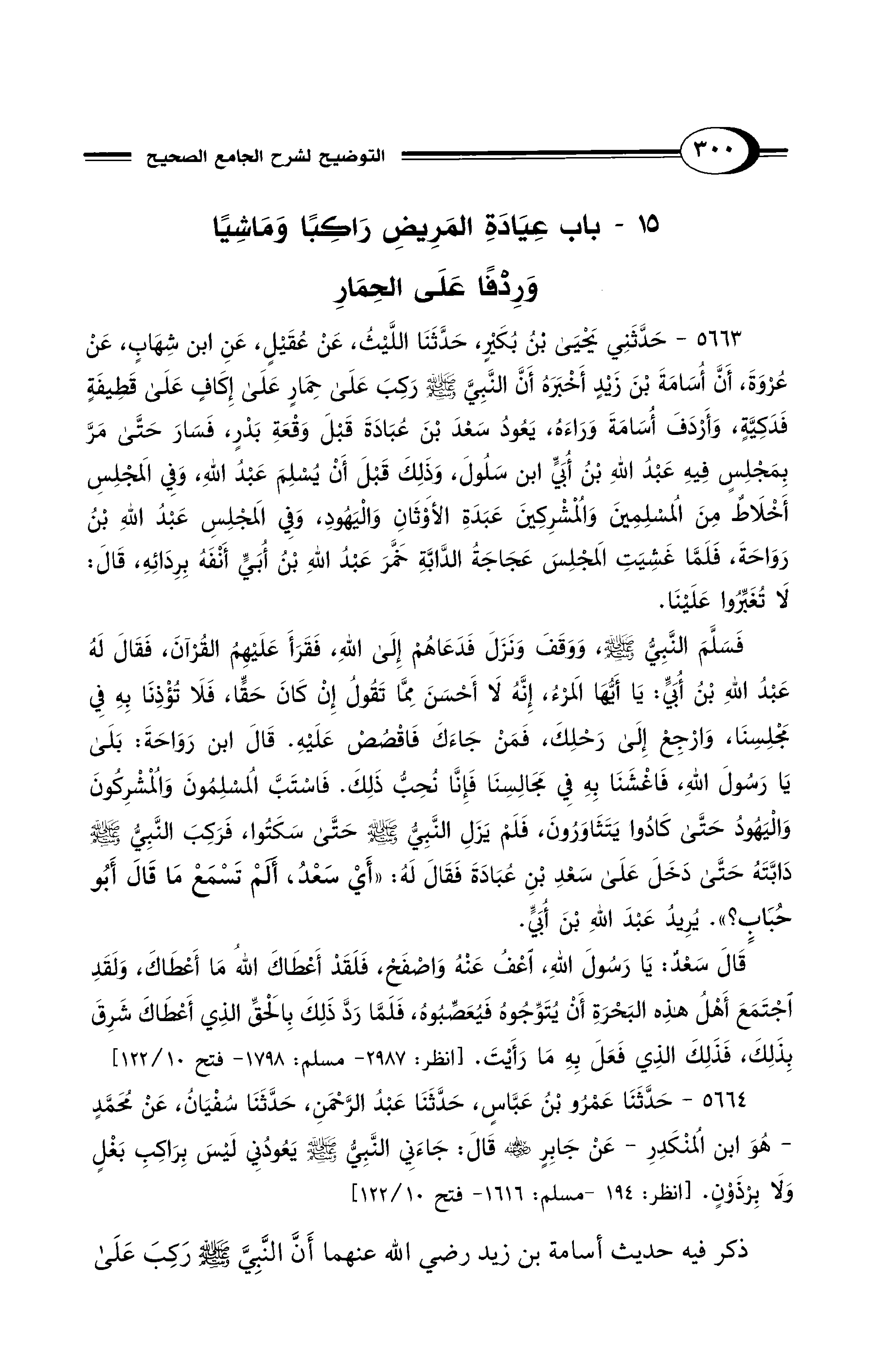 5663 - حَدَّثَنِي يَحْيَى بْنُ بُكَيْرٍ، حَدَّثَنَا اللَّيْثُ، عَنْ عُقَيْلٍ، عَنِ ابْنِ شِهَابٍ، عَنْ عُرْوَةَ، أَنَّ أُسَامَةَ بْنَ زَيْدٍ أَخْبَرَهُ أَنَّ النَّبِيَّ - صلى الله عليه وسلم - رَكِبَ عَلَى حِمَارٍ عَلَى إِكَافٍ على قَطِيفَةٍ فَدَكِيَّةٍ، وَأَرْدَفَ أُسَامَةَ وَرَاءَهُ، يَعُودُ سَعْدَ بْنَ عُبَادَةَ قَبْلَ وَقْعَةِ بَدْرٍ، فَسَارَ حَتَّى مَرَّ بِمَجْلِسٍ فِيهِ عَبْدُ اللهِ بْنُ أُبَيٍّ ابْنُ سَلُولَ، وَذَلِكَ قَبْلَ أَنْ يُسْلِمَ عَبْدُ اللهِ، وَفِي الْمَجْلِسِ أَخْلاَطٌ مِنَ الْمُسْلِمِينَ وَالْمُشْرِكِينَ عَبَدَةِ الأَوْثَانِ وَالْيَهُودِ، وَفِي الْمَجْلِسِ عَبْدُ اللهِ بْنُ رَوَاحَةَ، فَلَمَّا غَشِيَتِ الْمَجْلِسَ عَجَاجَةُ الدَّابَّةِ خَمَّرَ عَبْدُ اللهِ بْنُ أُبَيٍّ أَنْفَهُ بِرِدَائِهِ، قَالَ: لاَ تُغَبِّرُوا عَلَيْنَا.