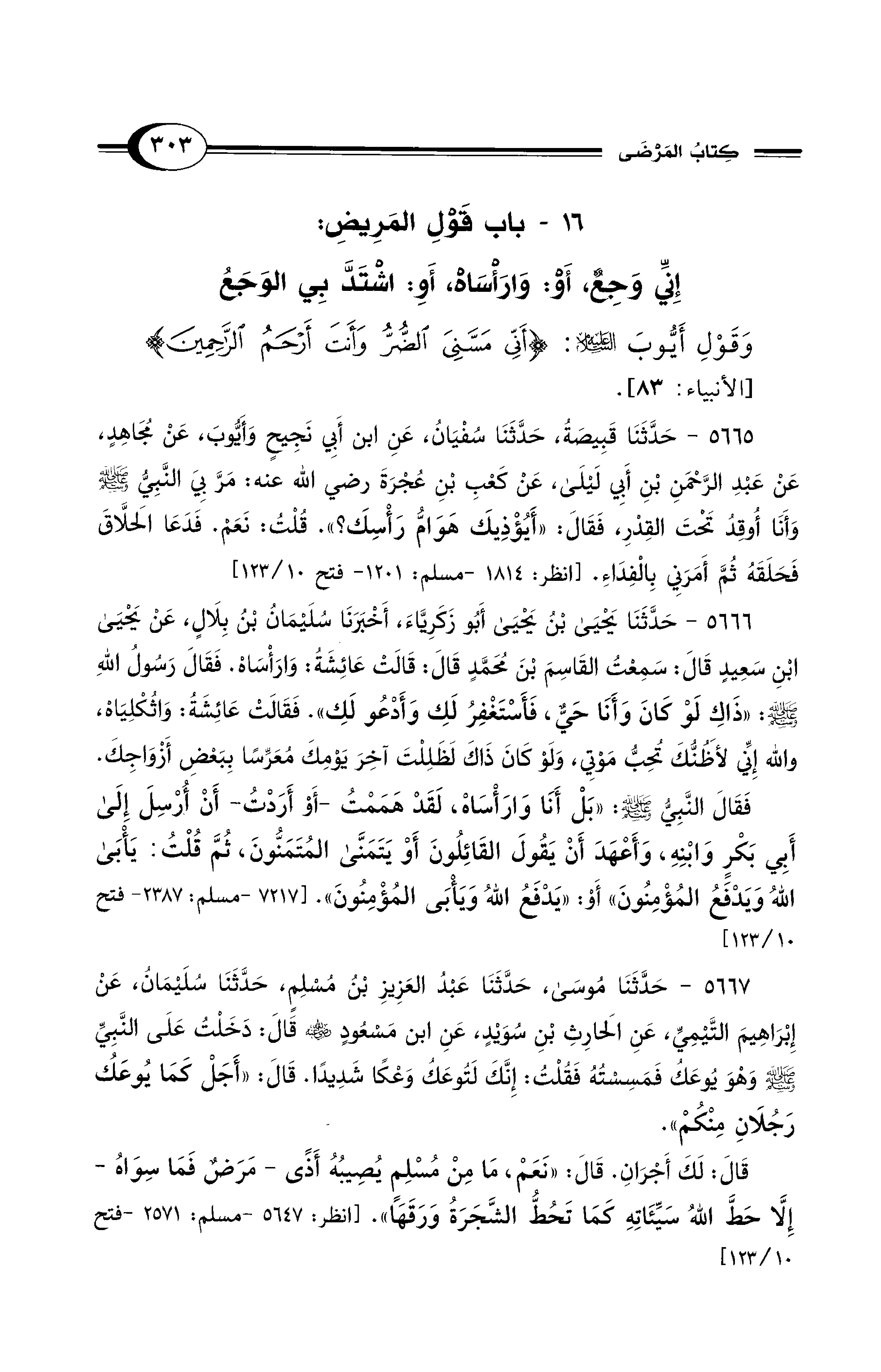 16 - باب قَوْلِ الْمَرِيضِ: إِنِّي وَجِعٌ، أَوْ: وَارَأْسَاهْ، أَوِ: اشْتَدَّ بِي الْوَجَعُ