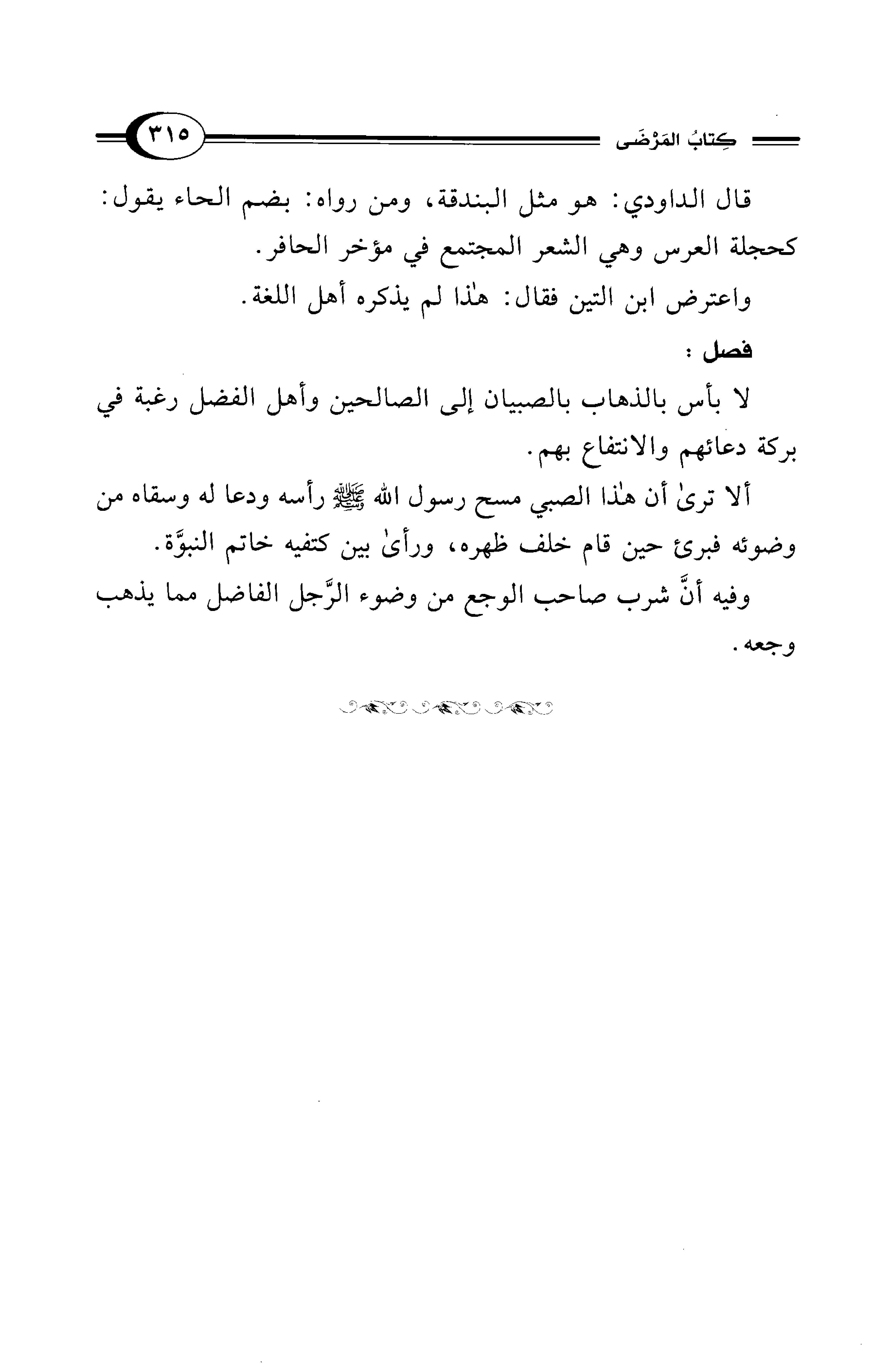 ألا ترى أن هذا الصبي مسح رسول الله - صلى الله عليه وسلم - رأسه ودعا له وسقاه من وضوئه فبرئ حين قام خلف ظهره، ورأى بين كتفيه خاتم النبوَّة.