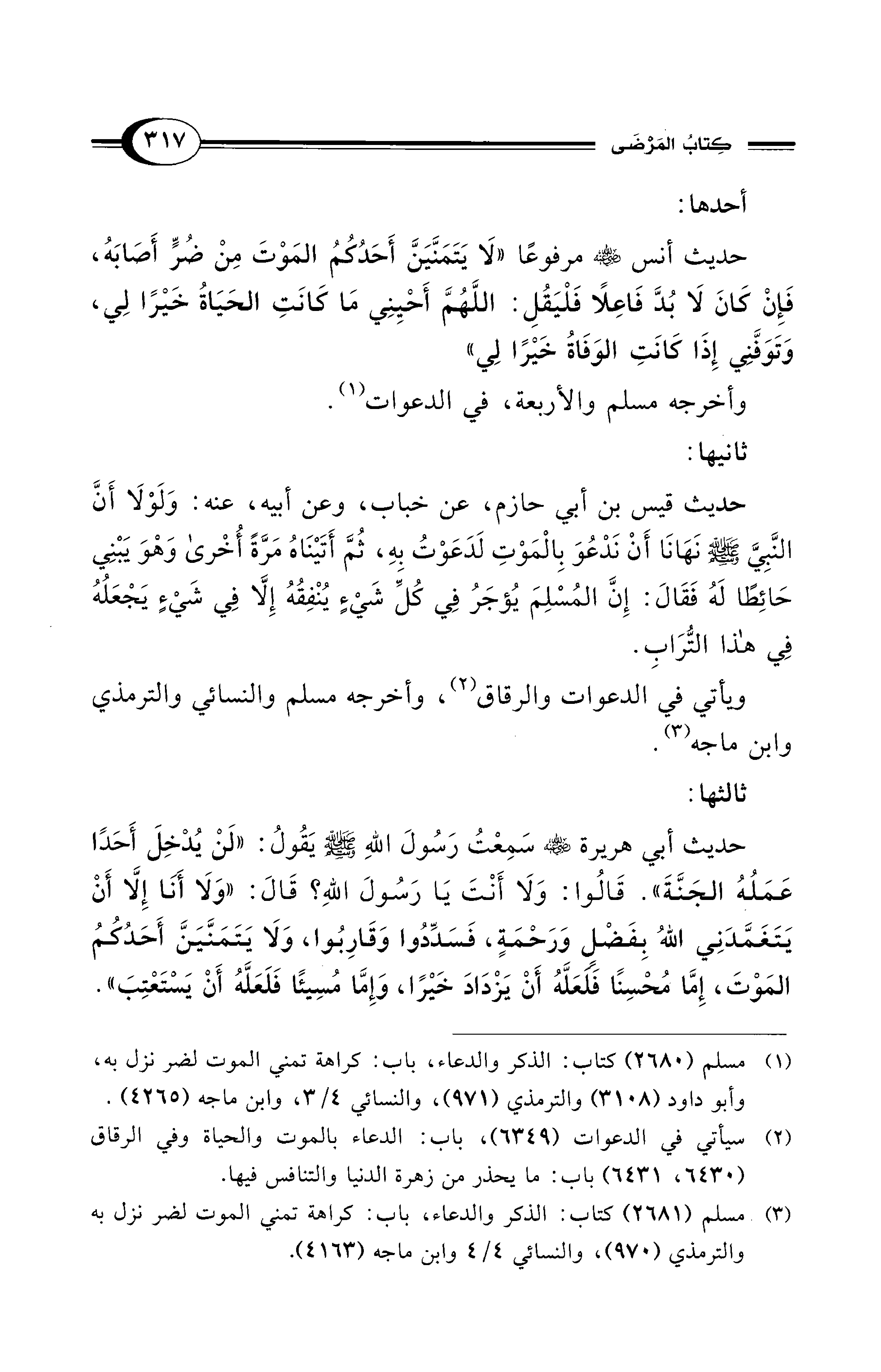 (¬3) مسلم (2681) كتاب: الذكر والدعاء، باب: كراهة تمني الموت لضر نزل به والترمذي (970)، والنسائي 4/ 4 وابن ماجه (4163).