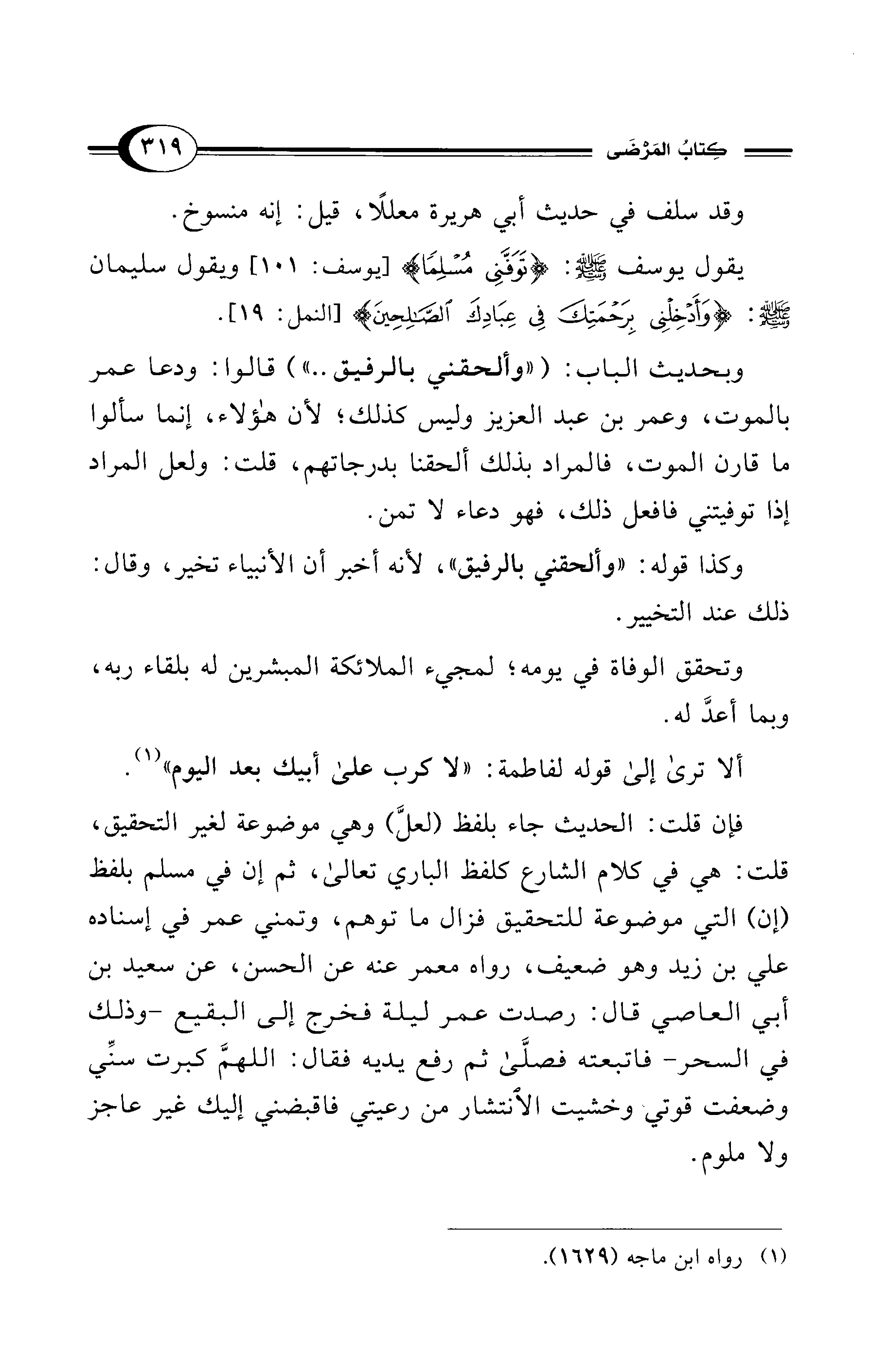 وبحديث الباب: ("وألحقني بالرفيق .. ") قالوا: ودعا عمر بالموت، وعمر بن عبد العزيز وليس كذلك؛ لأن هؤلاء، إنما سألوا ما قارن الموت، فالمراد بذلك ألحقنا بدرجاتهم، قلت: ولعل المراد إذا توفيتني فافعل ذلك، فهو دعاء لا تمن.