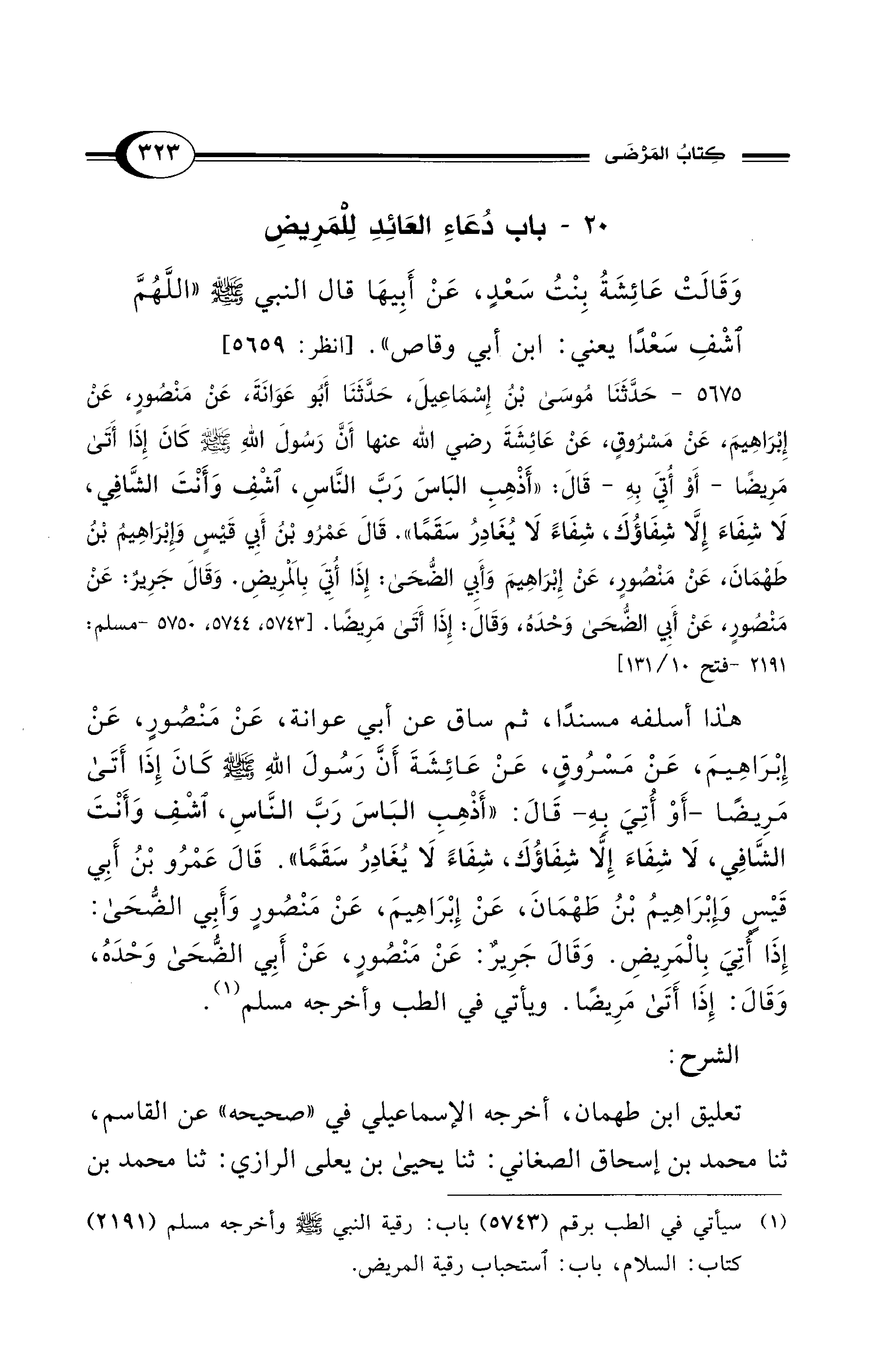 5675 - حَدَّثَنَا مُوسَى بْنُ إِسْمَاعِيلَ، حَدَّثَنَا أَبُو عَوَانَةَ، عَنْ مَنْصُورٍ، عَنْ إِبْرَاهِيمَ، عَنْ مَسْرُوقٍ، عَنْ عَائِشَةَ - رضي الله عنها - أَنَّ رَسُولَ اللهِ - صلى الله عليه وسلم - كَانَ إِذَا أَتَى مَرِيضًا -أَوْ أُتِيَ بِهِ- قَالَ: «أَذْهِبِ الْبَاسَ رَبَّ النَّاسِ، اشْفِ وَأَنْتَ الشَّافِي، لاَ شِفَاءَ إِلاَّ شِفَاؤُكَ، شِفَاءً لاَ يُغَادِرُ سَقَمًا». قَالَ عَمْرُو بْنُ أَبِي قَيْسٍ وَإِبْرَاهِيمُ بْنُ طَهْمَانَ، عَنْ مَنْصُورٍ، عَنْ إِبْرَاهِيمَ وَأَبِي الضُّحَى: إِذَا أُتِيَ بِالْمَرِيضِ. وَقَالَ جَرِيرٌ: عَنْ مَنْصُورٍ، عَنْ أَبِي الضُّحَى وَحْدَهُ، وَقَالَ: إِذَا أَتَى مَرِيضًا. [5743، 5744، 5750 - مسلم: 2191 - فتح 10/ 131]