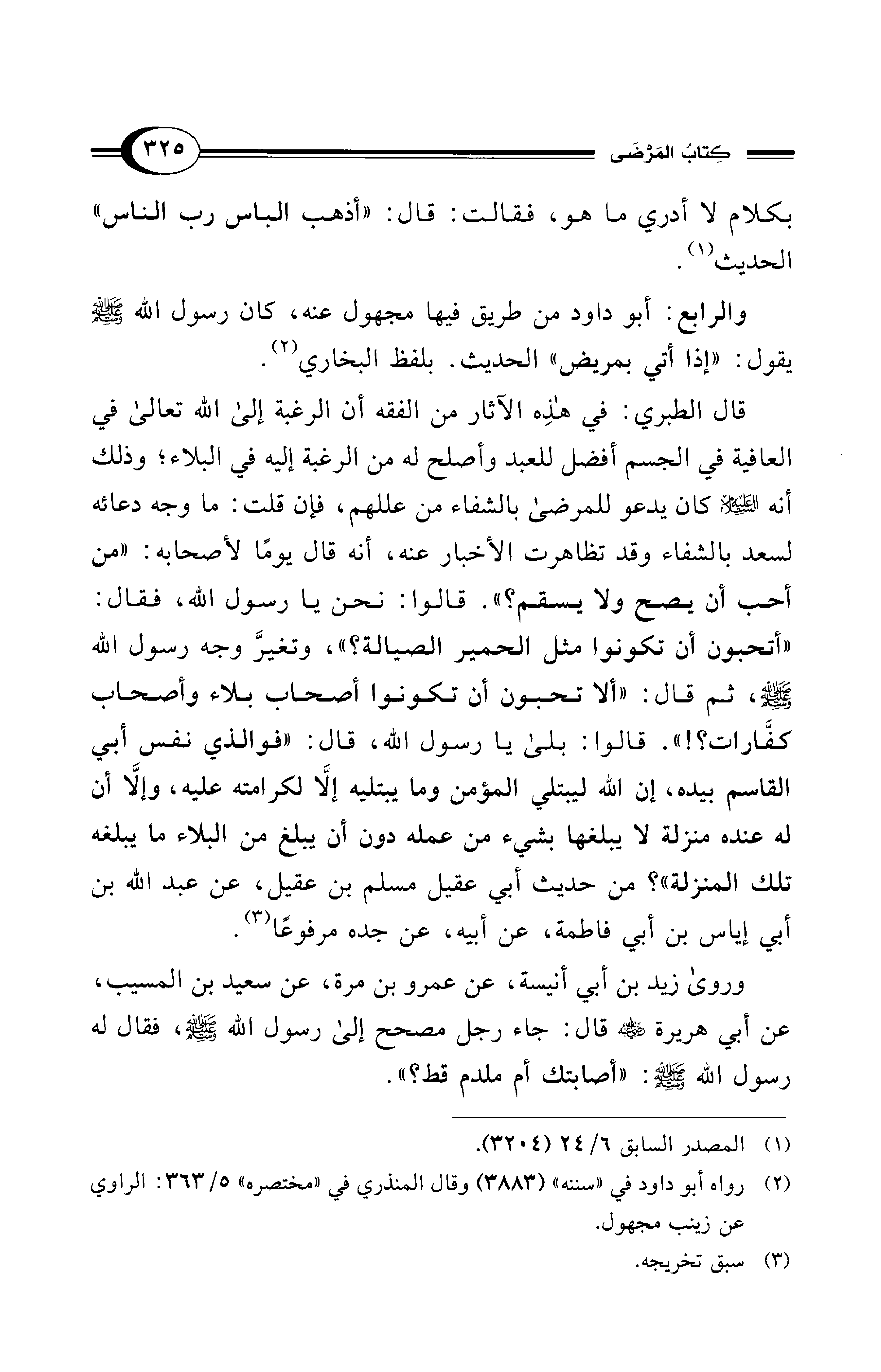 قال الطبري: في هذِه الآثار من الفقه أن الرغبة إلى الله تعالى في العافية في الجسم أفضل للعبد وأصلح له من الرغبة إليه في البلاء؛ وذلك أنه - عليه السلام - كان يدعو للمرضى بالشفاء من عللهم، فإن قلت: ما وجه دعائه لسعد بالشفاء وقد تظاهرت الأخبار عنه، أنه قال يومًا لأصحابه: "من أحب أن يصح ولا يسقم؟ ". قالوا: نحن يا رسول الله، فقال: "أتحبون أن تكونوا مثل الحمير الصيالة؟ "، وتغيرَّ وجه رسول الله - صلى الله عليه وسلم -، ثم قال: "ألا تحبون أن تكونوا أصحاب بلاء وأصحاب كفَّارات؟! ". قالوا: بلى يا رسول الله، قال: "فوالذي نفس أبي القاسم بيده، إن الله ليبتلي المؤمن وما يبتليه إلاَّ لكرامته عليه، وإلَّا أن له عنده منزلة لا يبلغها بشيء من عمله دون أن يبلغ من البلاء ما يبلغه تلك المنزلة"؟ من حديث أبي عقيل مسلم بن عقيل، عن عبد الله بن أبي إياس بن أبي فاطمة، عن أبيه، عن جده مرفوعًا (¬3).