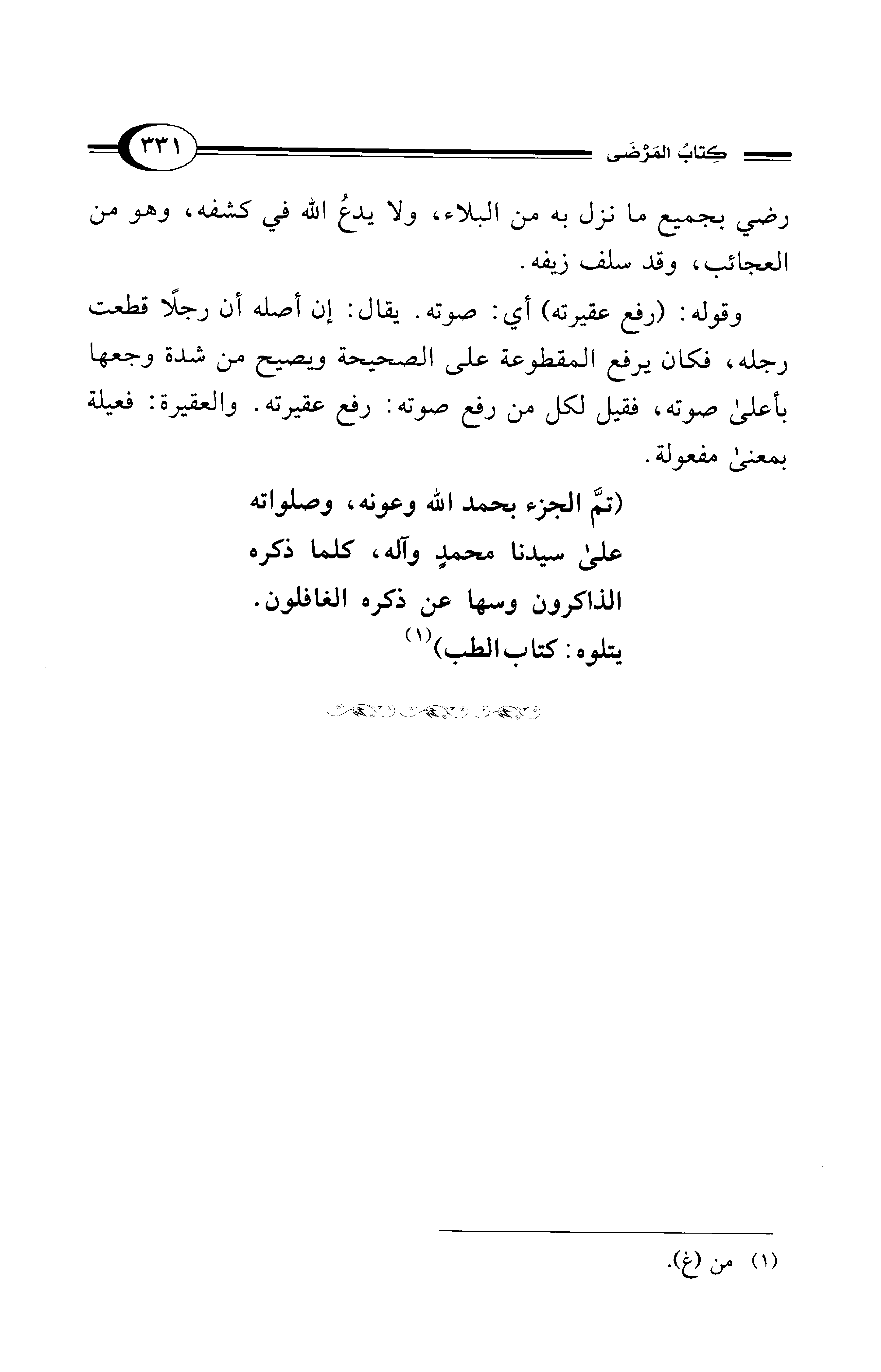 (تمَّ الجزء بحمد الله وعونه، وصلواته على سيدنا محمدٍ وآله، كلما ذكره الذاكرون وسها عن ذكره الغافلون. يتلوه: كتاب الطب) (¬1)