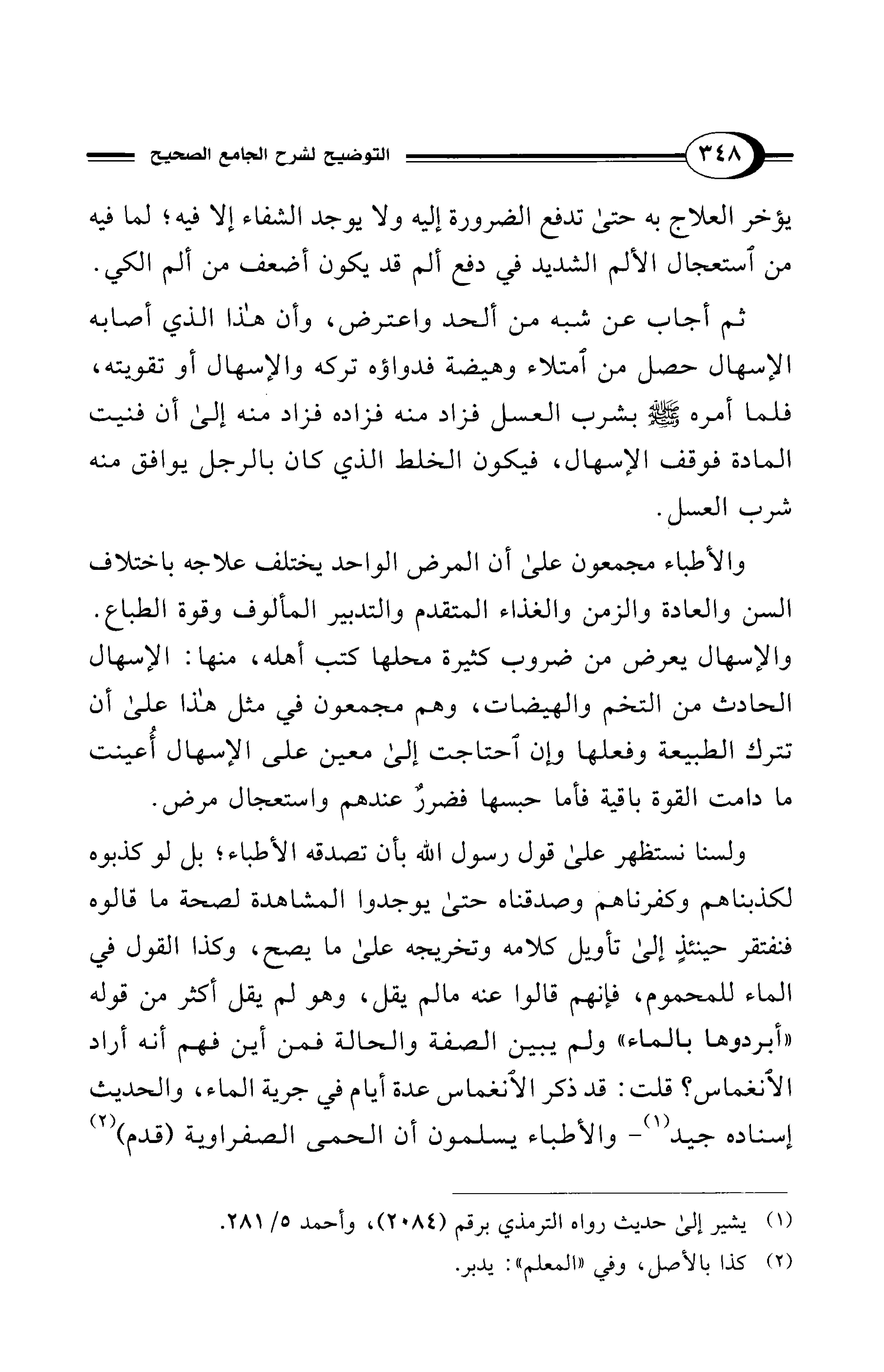 ولسنا نستظهر على قول رسول الله بأن تصدقه الأطباء؛ بل لو كذبوه لكذبناهم وكفرناهم وصدقناه حتى يوجدوا المشاهدة لصحة ما قالوه فنفتقر حينئذٍ إلى تأويل كلامه وتخريجه على ما يصح، وكذا القول في الماء للمحموم، فإنهم قالوا عنه مالم يقل، وهو لم يقل أكثر من قوله "أبردوها بالماء" ولم يبين الصفة والحالة فمن أين فهم أنه أراد الانغماس؟ قلت: قد ذكر الانغماس عدة أيام في جرية الماء، والحديث إسناده جيد (¬1) - والأطباء يسلمون أن الحمى الصفراوية (قدم) (¬2)