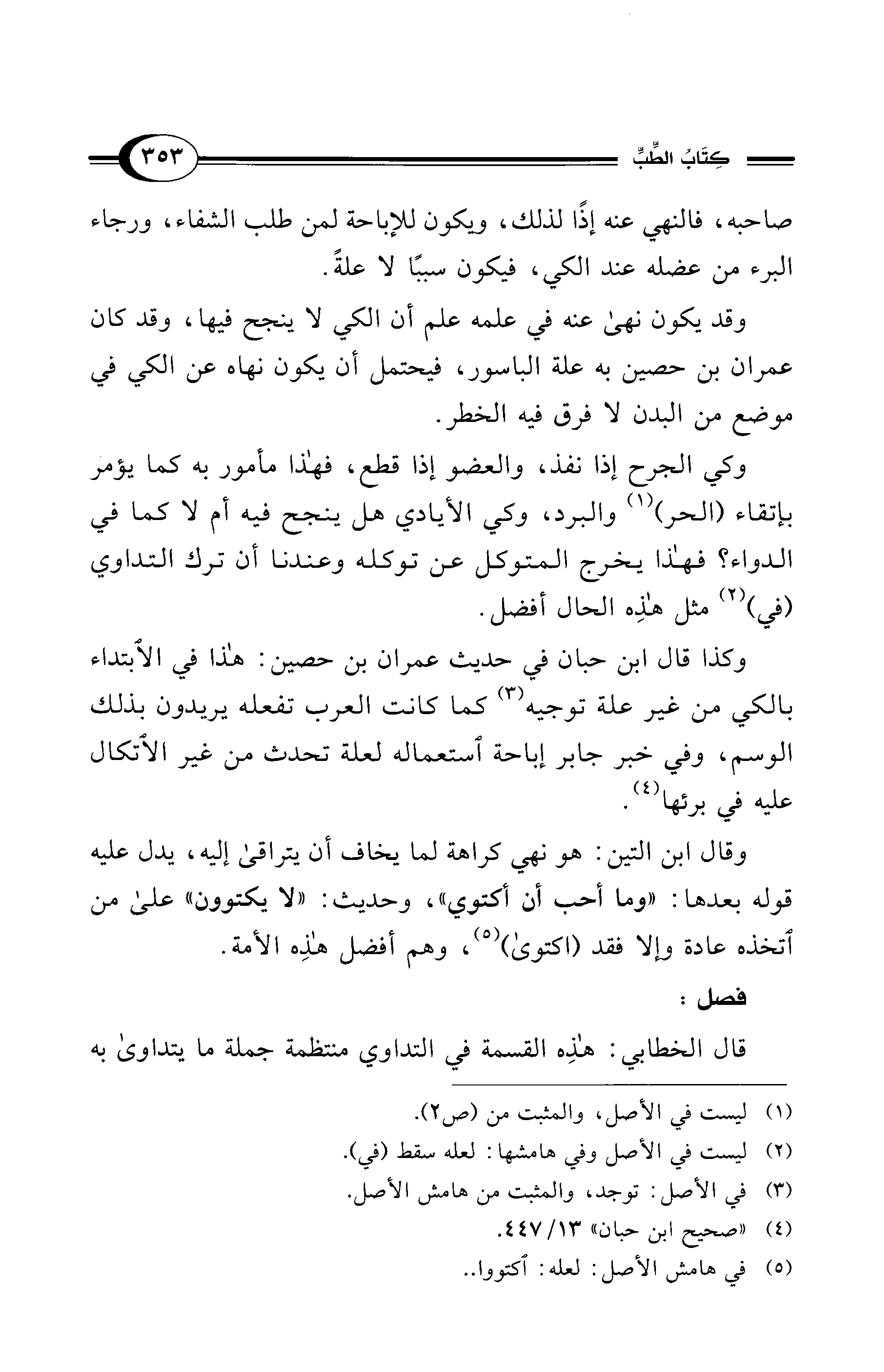 وكذا قال ابن حبان في حديث عمران بن حصين: هذا في الابتداء بالكي من غير علة توجيه (¬3) كما كانت العرب تفعله يريدون بذلك الوسم، وفي خبر جابر إباحة استعماله لعلة تحدث من غير الاتكال عليه في برئها (¬4).