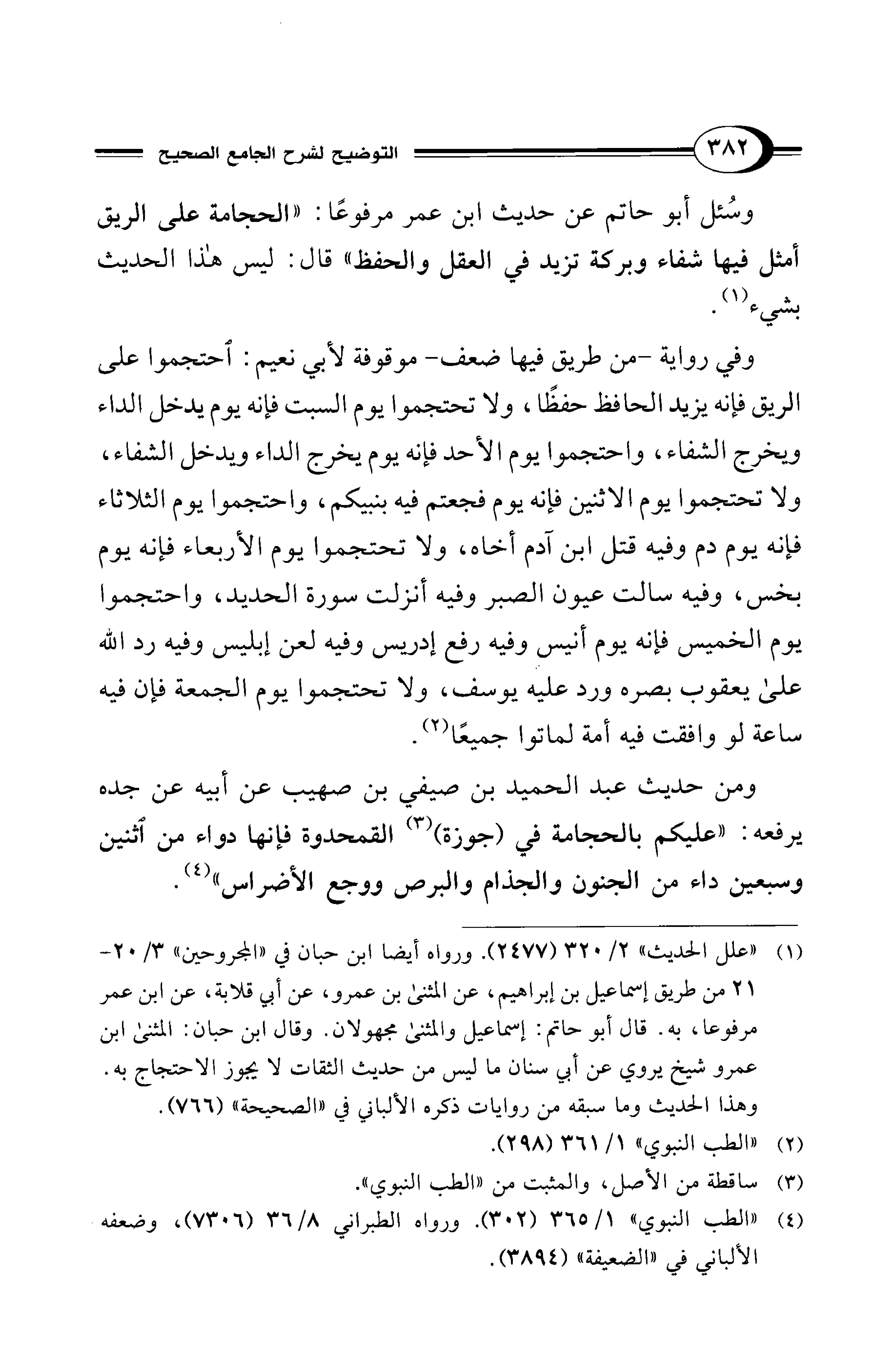 وسُئل أبو حاتم عن حديث ابن عمر مرفوعًا: "الحجامة على الريق أمثل فيها شفاء وبركة تزيد في العقل والحفظ" قال: ليس هذا الحديث بشيء (¬1).