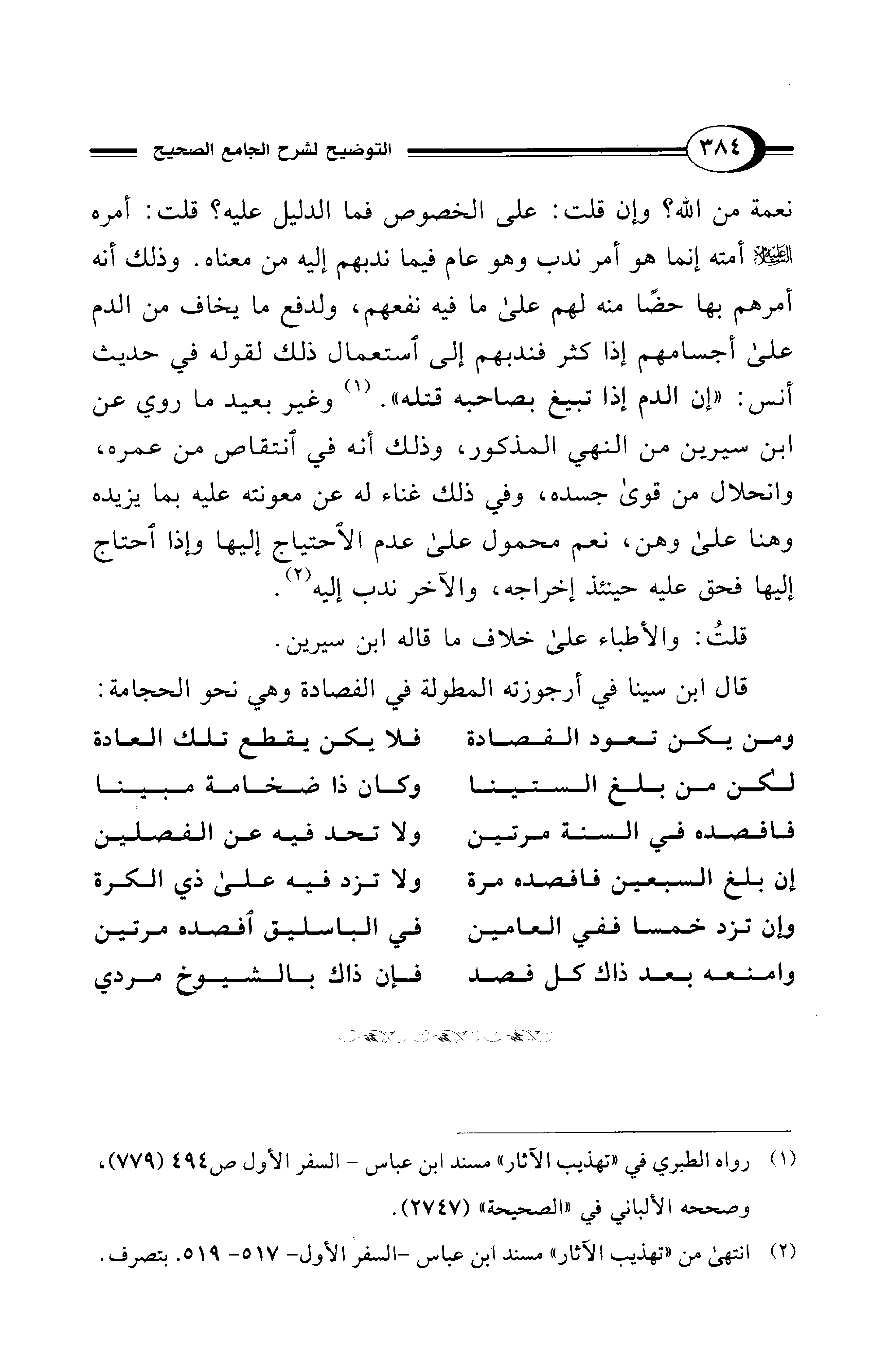 نعمة من الله؟ وإن قلت: على الخصوص فما الدليل عليه؟ قلت: أمره - عليه السلام - أمته إنما هو أمر ندب وهو عام فيما ندبهم إليه من معناه. وذلك أنه أمرهم بها حضًا منه لهم على ما فيه نفعهم، ولدفع ما يخاف من الدم على أجسامهم إذا كثر فندبهم إلى استعمال ذلك لقوله في حديث أنس: "إن الدم إذا تبيغ بصاحبه قتله". (¬1) وغير بعيد ما روي عن ابن سيرين من النهي المذكور، وذلك أنه في انتقاص من عمره، وانحلال من قوى جسده، وفي ذلك غناء له عن معونته عليه بما يزيده وهنا على وهن، نعم محمول على عدم الاحتياج إليها وإذا احتاج إليها فحق عليه حينئذ إخراجه، والآخر ندب إليه (¬2).