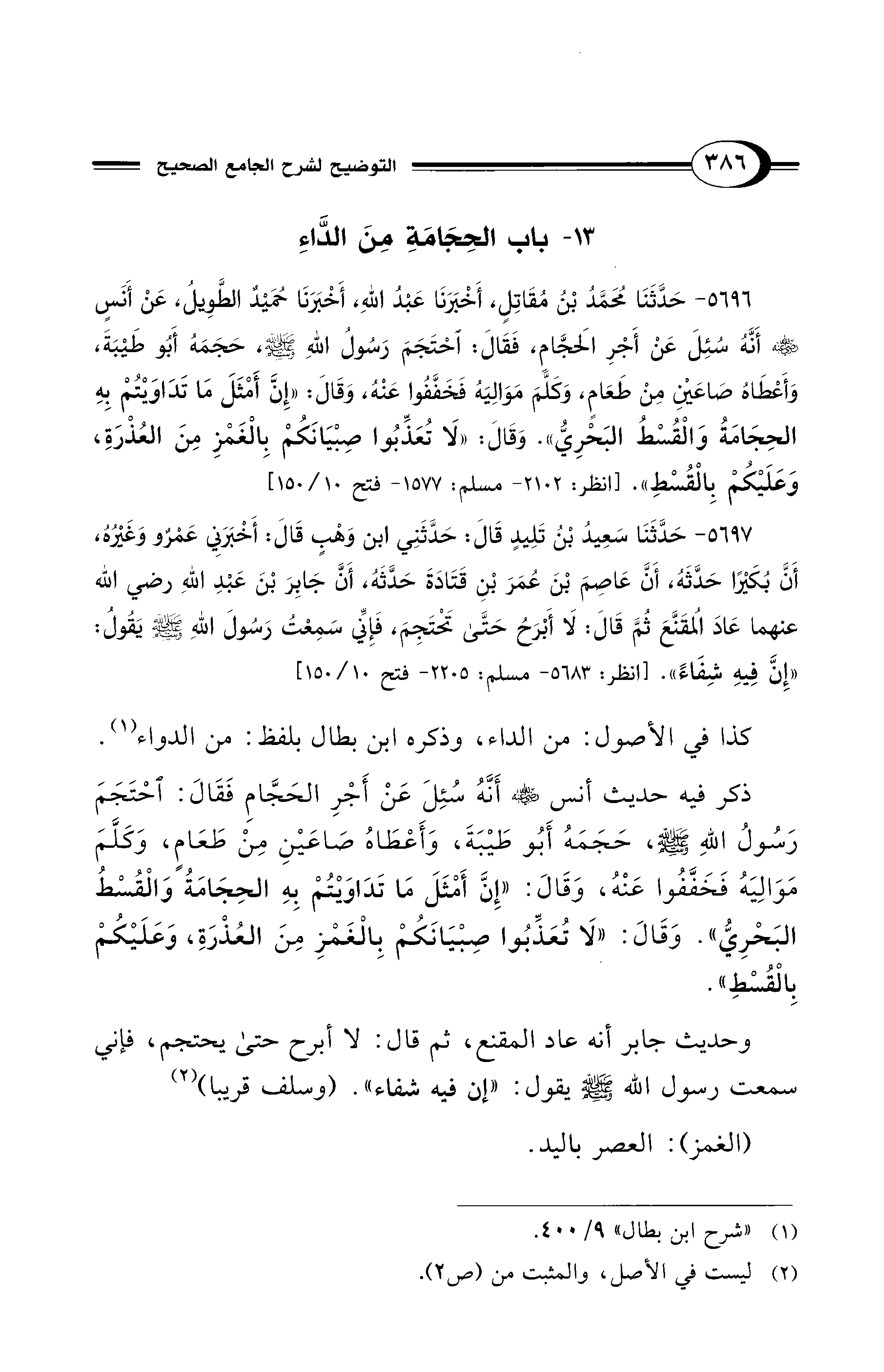 5697 - حَدَّثَنَا سَعِيدُ بْنُ تَلِيدٍ قَالَ: حَدَّثَنِي ابْنُ وَهْبٍ قَالَ: أَخْبَرَنِي عَمْرٌو وَغَيْرُهُ: أَنَّ بُكَيْرًا حَدَّثَهُ، أَنَّ عَاصِمَ بْنَ عُمَرَ بْنِ قَتَادَةَ حَدَّثَهُ، أَنَّ جَابِرَ بْنَ عَبْدِ اللهِ - رضي الله عنهما - عَادَ الْمُقَنَّعَ ثُمَّ قَالَ: لاَ أَبْرَحُ حَتَّى تَحْتَجِمَ، فَإِنِّي سَمِعْتُ رَسُولَ اللهِ - صلى الله عليه وسلم - يَقُولُ: «إِنَّ فِيهِ شِفَاءً». [انظر: 5683 - مسلم: 2205 - فتح 10/ 150]
