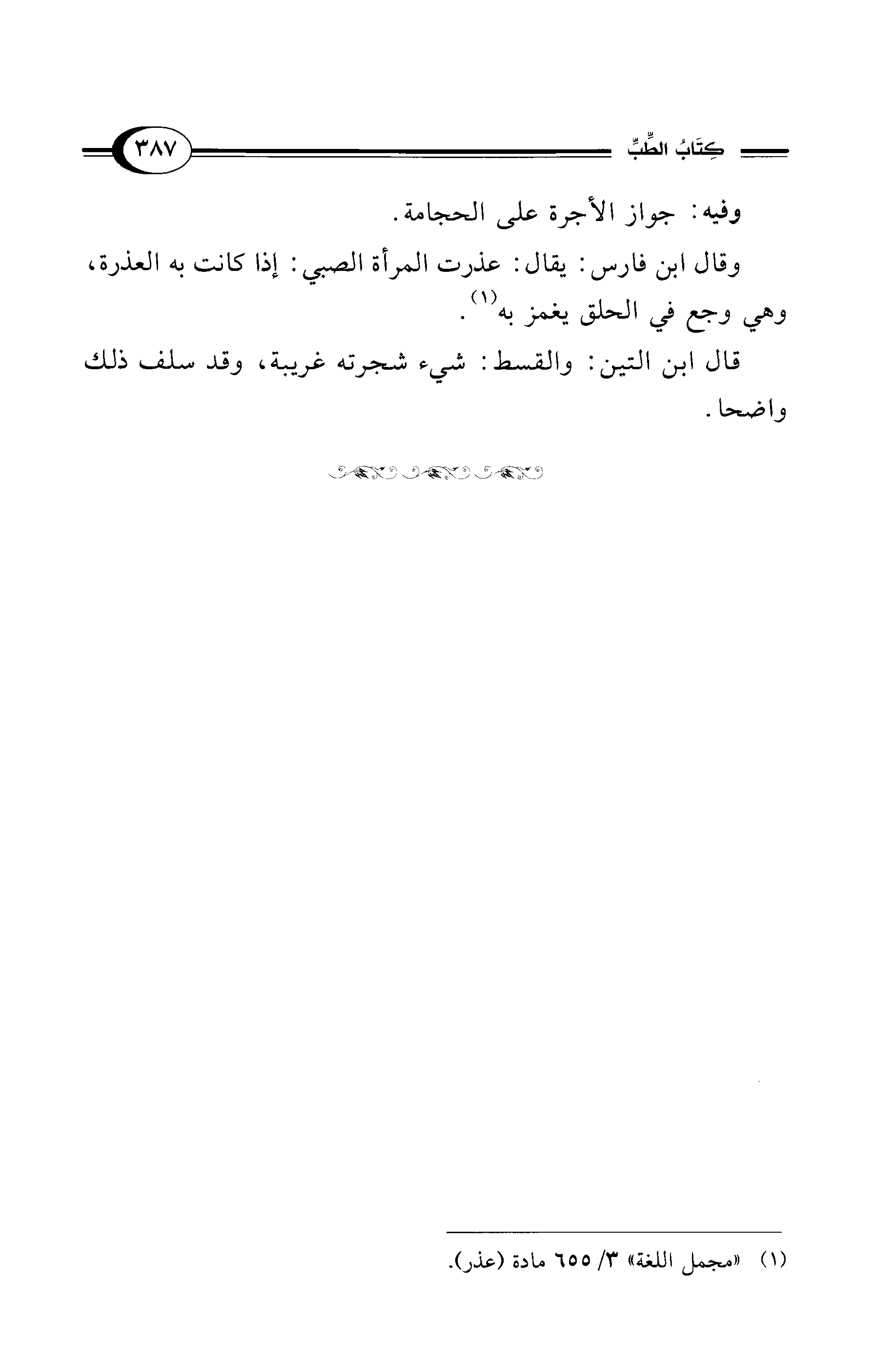 وقال ابن فارس: يقال: عذرت المرأة الصبي: إذا كانت به العذرة، وهي وجع في الحلق يغمز به (¬1).