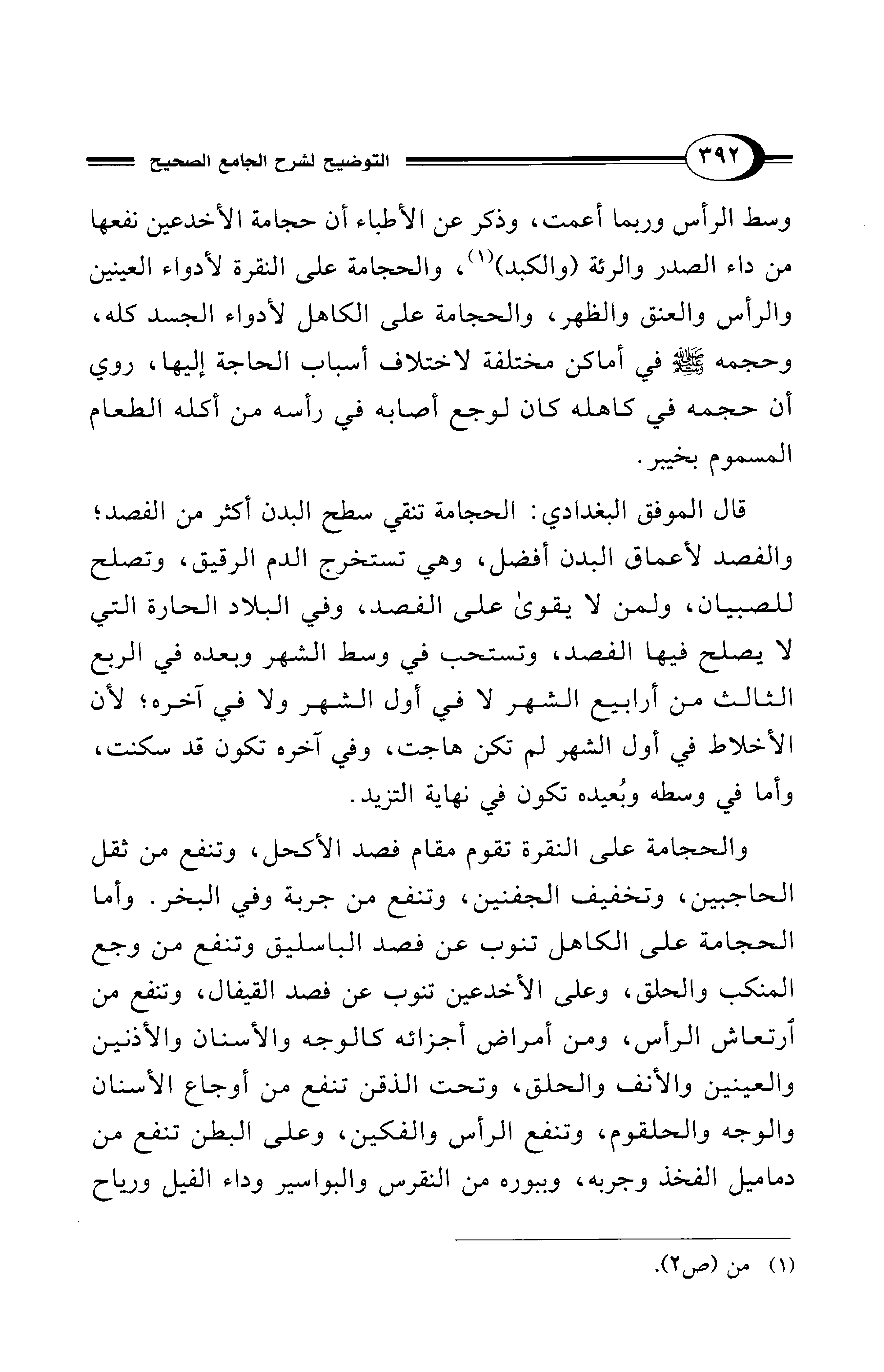 قال الموفق البغدادي: الحجامة تنقي سطح البدن أكثر من الفصد؛ والفصد لأعماق البدن أفضل، وهي تستخرج الدم الرقيق، وتصلح للصبيان، ولمن لا يقوى على الفصد، وفي البلاد الحارة التي لا يصلح فيها الفصد، وتستحب في وسط الشهر وبعده في الربع الثالث من أرابيع الشهر لا في أول الشهر ولا في آخره؛ لأن الأخلاط في أول الشهر لم تكن هاجت، وفي آخره تكون قد سكنت، وأما في وسطه وبُعيده تكون في نهاية التزيد.