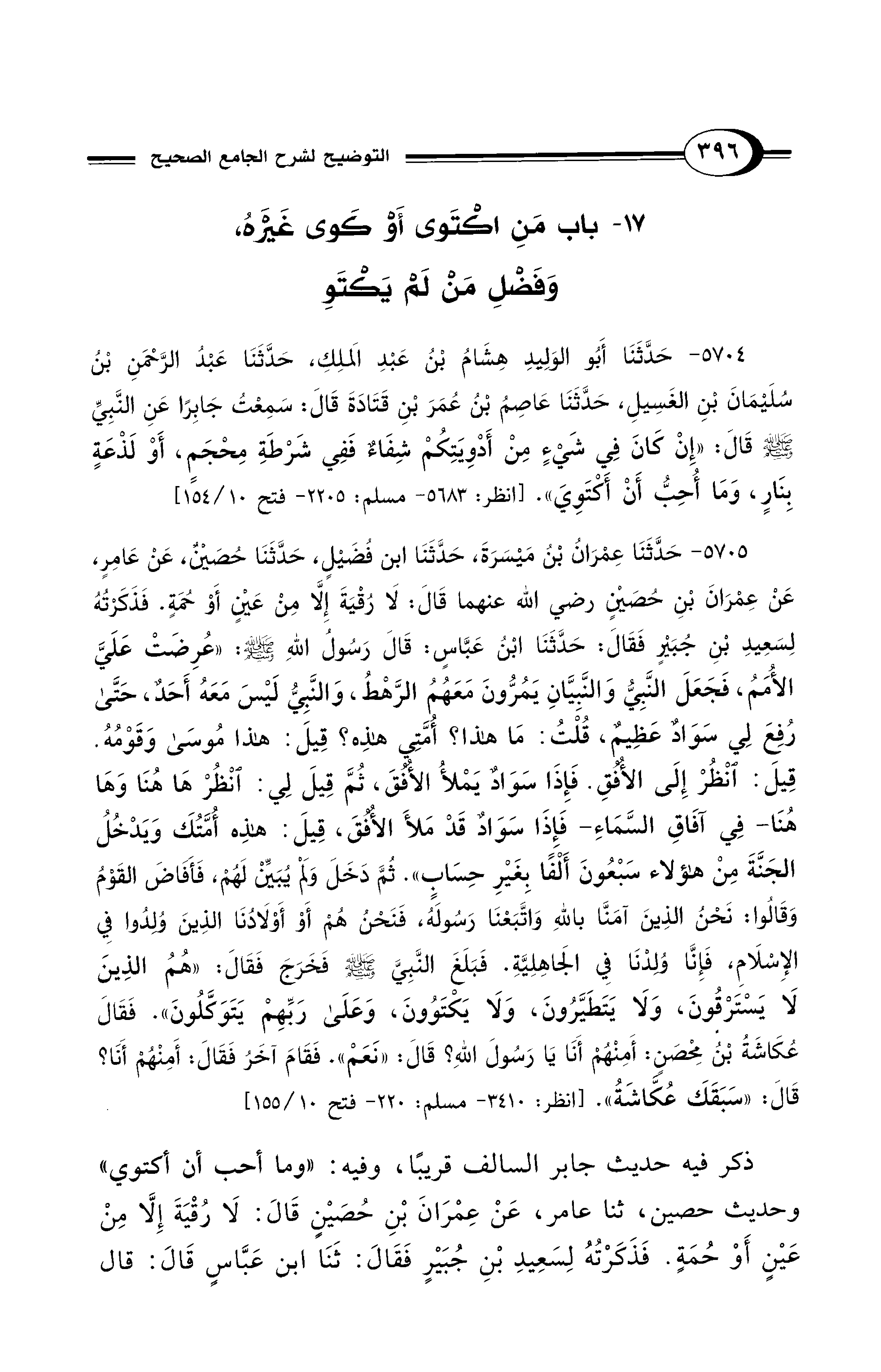5705 - حَدَّثَنَا عِمْرَانُ بْنُ مَيْسَرَةَ، حَدَّثَنَا ابْنُ فُضَيْلٍ، حَدَّثَنَا حُصَيْنٌ، عَنْ عَامِرٍ، عَنْ عِمْرَانَ بْنِ حُصَيْنٍ - رضي الله عنهما -قَالَ: لاَ رُقْيَةَ إِلاَّ مِنْ عَيْنٍ أَوْ حُمَةٍ. فَذَكَرْتُهُ لِسَعِيدِ بْنِ جُبَيْرٍ فَقَالَ: حَدَّثَنَا ابْنُ عَبَّاسٍ: قَالَ رَسُولُ اللهِ - صلى الله عليه وسلم -: «عُرِضَتْ عَلَيَّ الأُمَمُ، فَجَعَلَ النَّبِيُّ وَالنَّبِيَّانِ يَمُرُّونَ مَعَهُمُ الرَّهْطُ، وَالنَّبِيُّ لَيْسَ مَعَهُ أَحَدٌ، حَتَّى رُفِعَ لِي سَوَادٌ عَظِيمٌ، قُلْتُ: مَا هَذَا؟ أُمَّتِي هَذِهِ؟ قِيلَ: هَذَا مُوسَى وَقَوْمُهُ. قِيلَ انْظُرْ إِلَى الأُفُقِ. فَإِذَا سَوَادٌ يَمْلأُ الأُفُقَ، ثُمَّ قِيلَ لِي: انْظُرْ هَا هُنَا وَهَا هُنَا -فِي آفَاقِ السَّمَاءِ- فَإِذَا سَوَادٌ قَدْ مَلأَ الأُفُقَ، قِيلَ: هَذِهِ أُمَّتُكَ وَيَدْخُلُ الْجَنَّةَ مِنْ هَؤُلاَءِ سَبْعُونَ أَلْفًا بِغَيْرِ حِسَابٍ". ثُمَّ دَخَلَ وَلَمْ يُبَيِّنْ لَهُمْ، فَأَفَاضَ الْقَوْمُ وَقَالُوا: نَحْنُ الَّذِينَ آمَنَّا بِاللهِ وَاتَّبَعْنَا رَسُولَهُ، فَنَحْنُ هُمْ أَوْ أَوْلاَدُنَا الَّذِينَ وُلِدُوا فِي الإِسْلاَمِ، فَإِنَّا وُلِدْنَا فِي الْجَاهِلِيَّةِ. فَبَلَغَ النَّبِيَّ - صلى الله عليه وسلم - فَخَرَجَ فَقَالَ: "هُمُ الَّذِينَ لاَ يَسْتَرْقُونَ، وَلاَ يَتَطَيَّرُونَ، وَلاَ يَكْتَوُونَ، وَعَلَى رَبِّهِمْ يَتَوَكَّلُونَ». فَقَالَ عُكَّاشَةُ بْنُ مِحْصَنٍ: أَمِنْهُمْ أَنَا يَا رَسُولَ اللهِ؟ قَالَ: «نَعَمْ». فَقَامَ آخَرُ فَقَالَ: أَمِنْهُمْ أَنَا؟ قَالَ: «سَبَقَكَ عُكَّاشَةُ». [انظر: 3410 - مسلم: 220 - فتح 10/ 155]