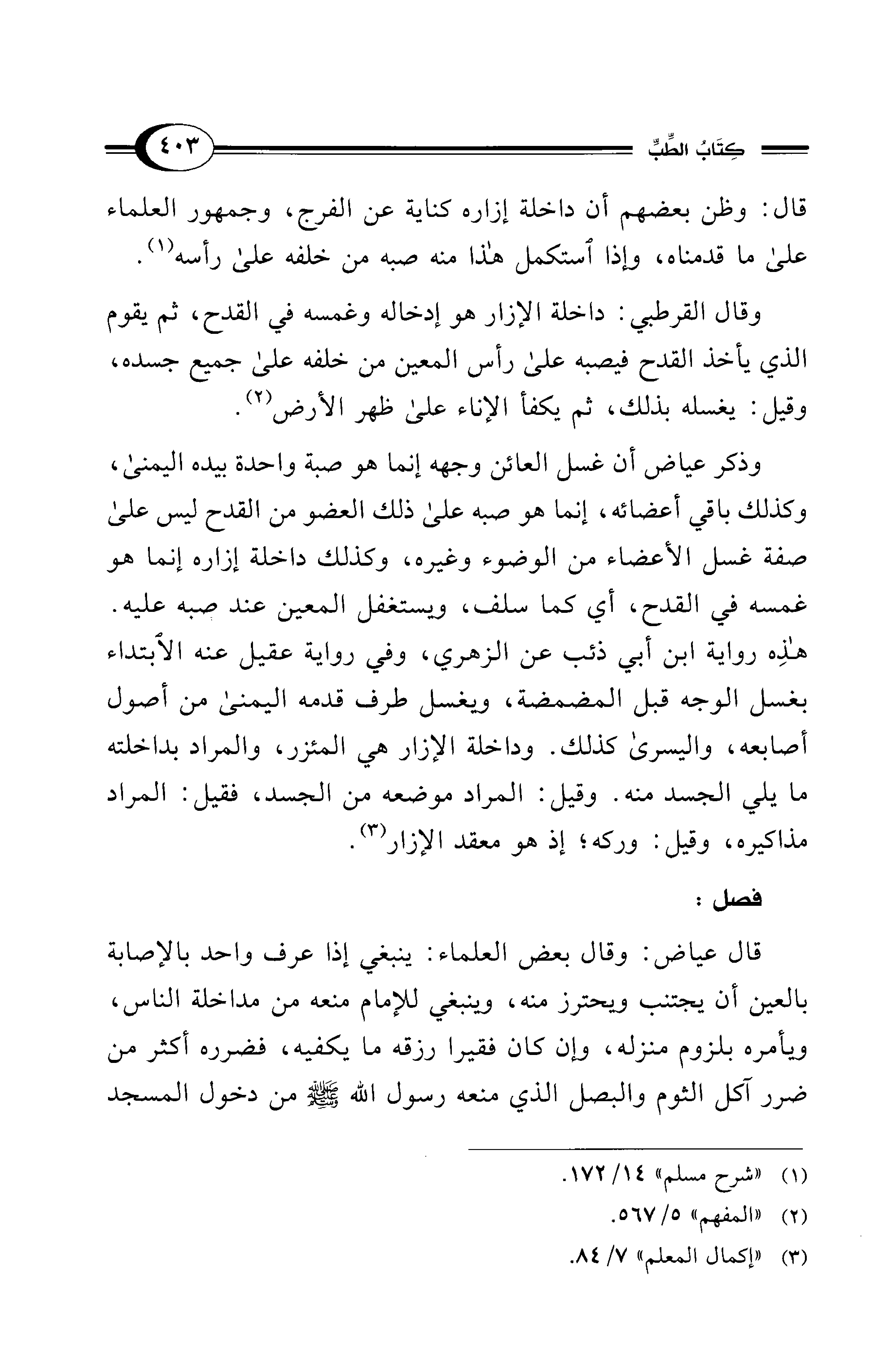وذكر عياض أن غسل العائن وجهه إنما هو صبة واحدة بيده اليمنى، وكذلك باقي أعضائه، إنما هو صبه على ذلك العضو من القدح ليس على صفة غسل الأعضاء من الوضوء وغيره، وكذلك داخلة إزاره إنما هو غمسه في القدح، أي كما سلف، ويستغفل المعين عند صبه عليه. هذِه رواية ابن أبي ذئب عن الزهري، وفي رواية عقيل عنه الابتداء بغسل الوجه قبل المضمضة، ويغسل طرف قدمه اليمنى من أصول أصابعه، واليسرى كذلك. وداخلة الإزار هي المئزر، والمراد بداخلته ما يلي الجسد منه. وقيل: المراد موضعه من الجسد، فقيل: المراد مذاكيره، وقيل: وركه؛ إذ هو معقد الإزار (¬3).