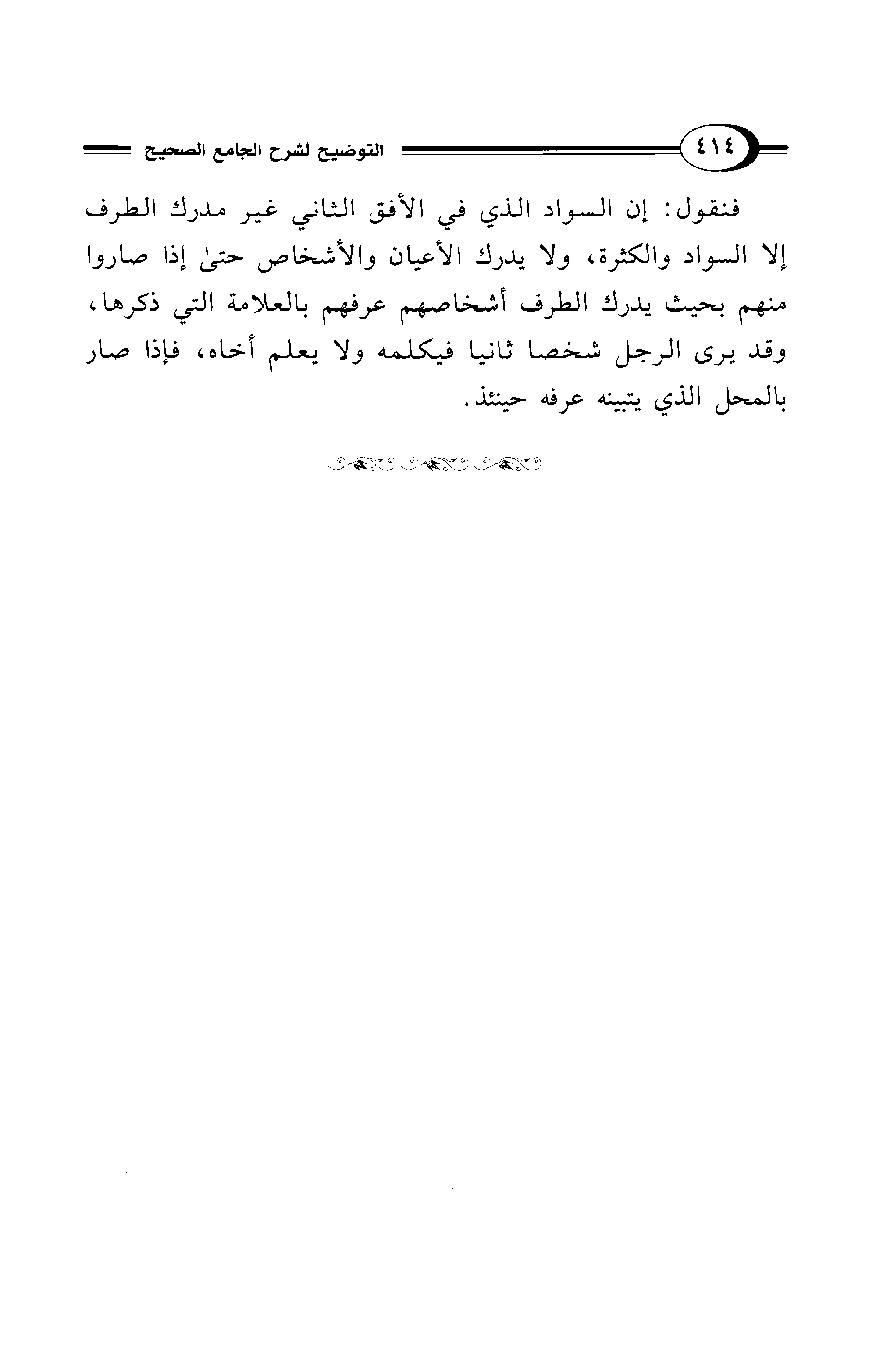 فنقول: إن السواد الذي في الأفق الثاني غير مدرك الطرف إلا السواد والكثرة، ولا يدرك الأعيان والأشخاص حتى إذا صاروا منهم بحيث يدرك الطرف أشخاصهم عرفهم بالعلامة التي ذكرها، وقد يرى الرجل شخصا ثانيا فيكلمه ولا يعلم أخاه، فإذا صار بالمحل الذي يتبينه عرفه حينئذ.