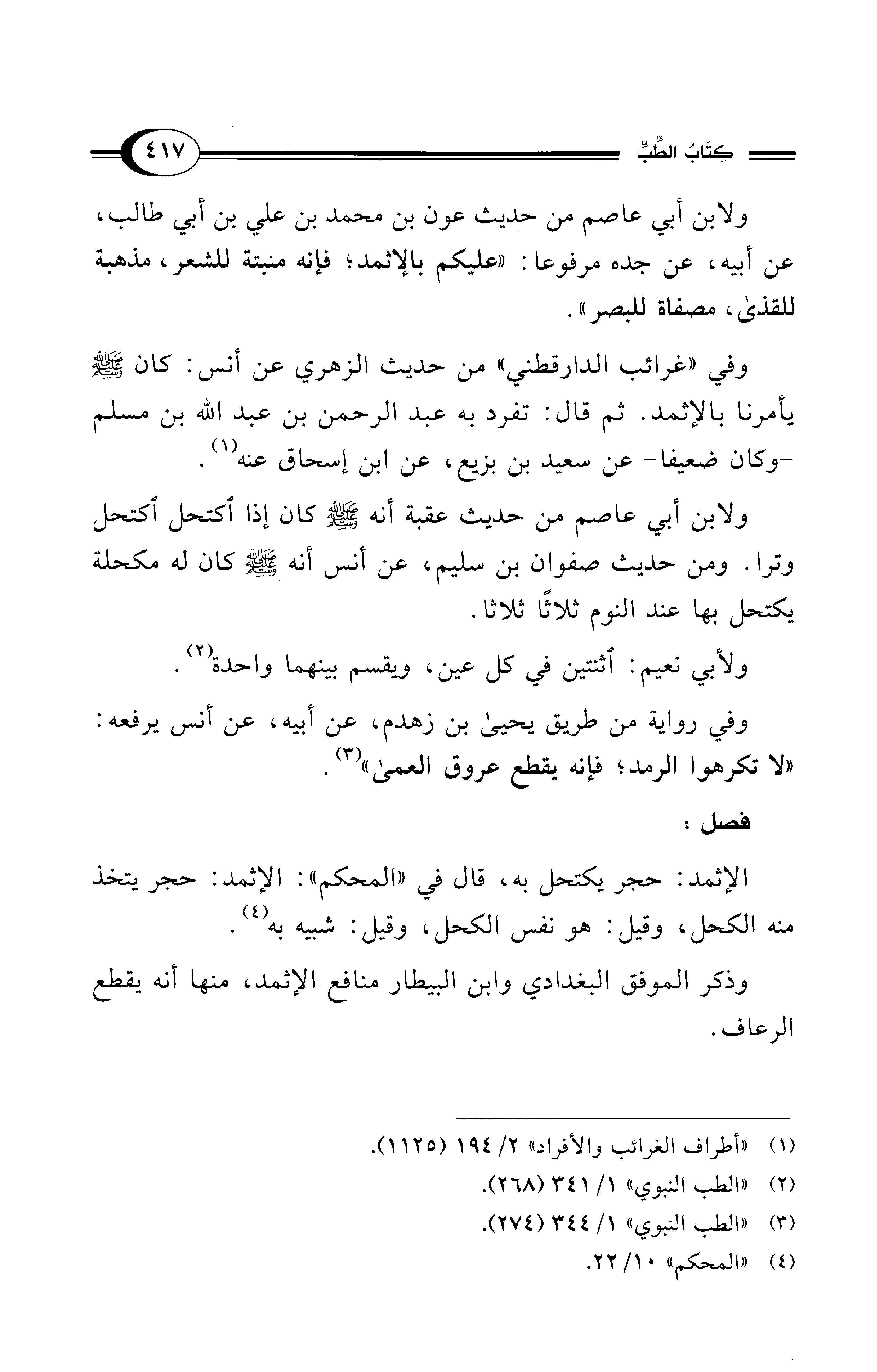 ولابن أبي عاصم من حديث عون بن محمد بن علي بن أبي طالب، عن أبيه، عن جده مرفوعا: "عليكم بالإثمد؛ فإنه منبتة للشعر، مذهبة للقذى، مصفاة للبصر".