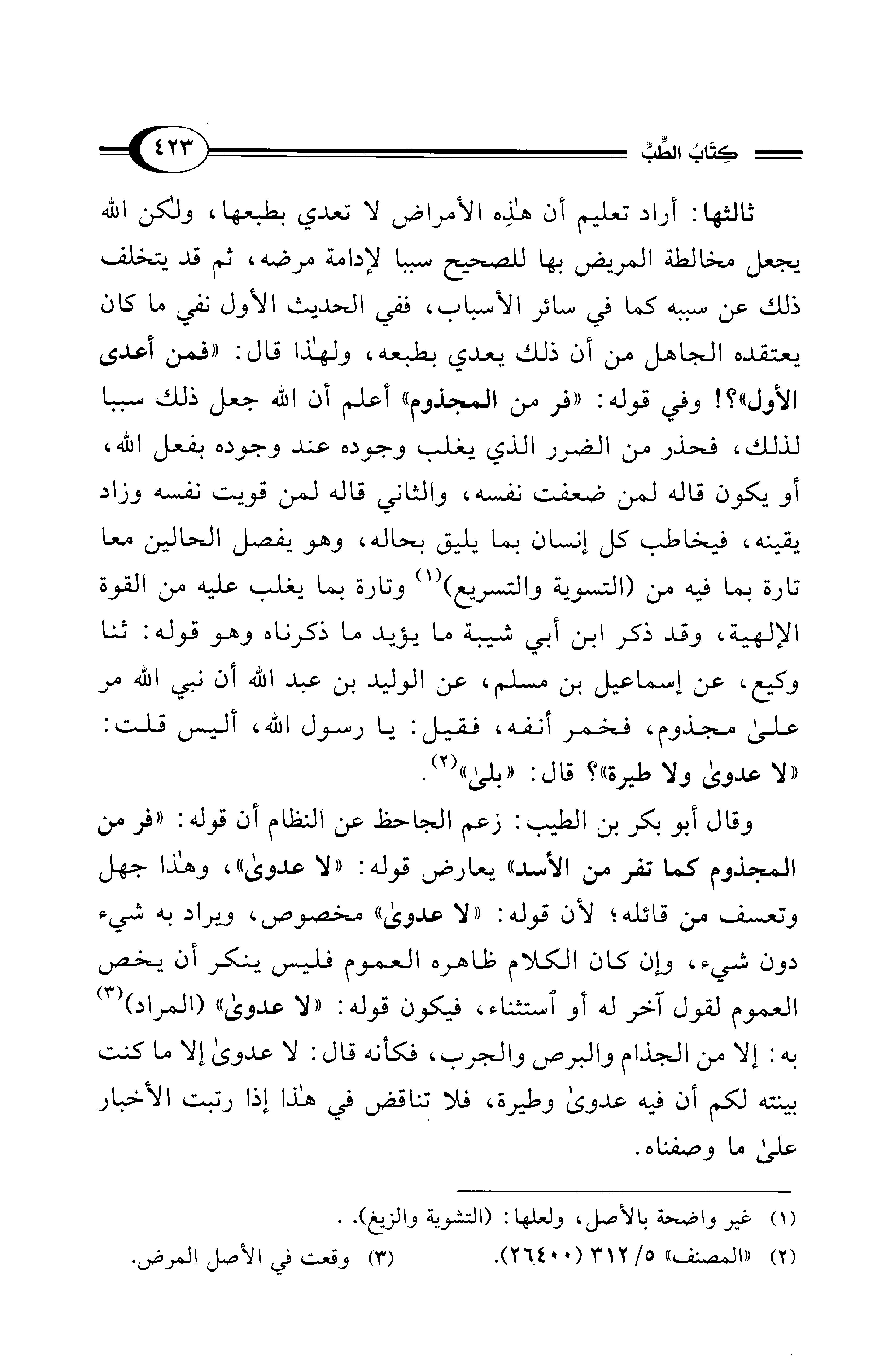 وقال أبو بكر بن الطيب: زعم الجاحظ عن النظام أن قوله: "فر من المجذوم كما تفر من الأسد" يعارض قوله: "لا عدوى"، وهذا جهل وتعسف من قائله؛ لأن قوله: "لا عدوى" مخصوص، ويراد به شيء دون شيء، وإن كان الكلام ظاهره العموم فليس ينكر أن يخص العموم لقول آخر له أو استثناء، فيكون قوله: "لا عدوى" (المراد) (¬3) به: إلا من الجذام والبرص والجرب، فكأنه قال: لا عدوى إلا ما كنت بينته لكم أن فيه عدوى وطيرة، فلا تناقض في هذا إذا رتبت الأخبار على ما وصفناه.