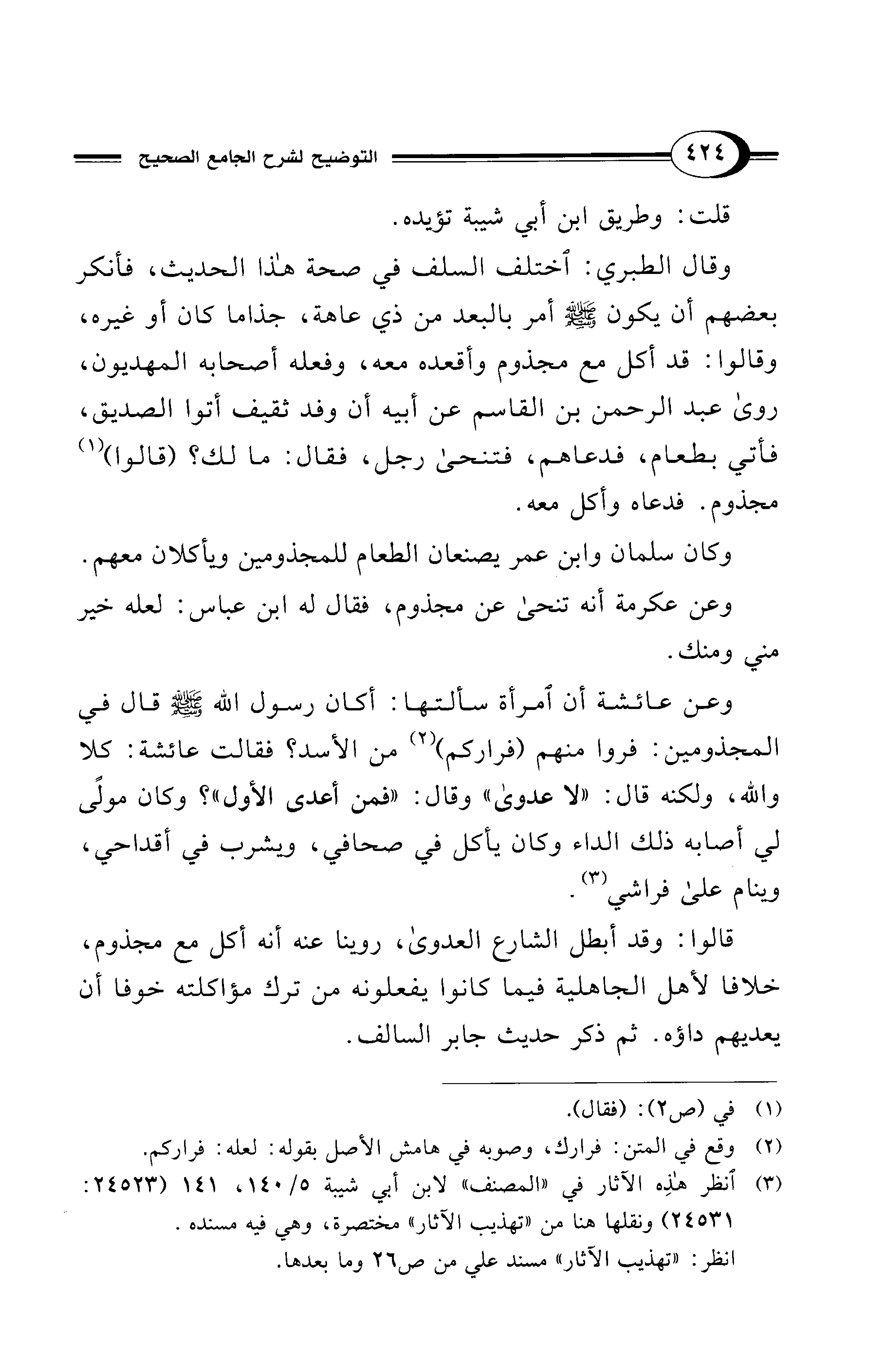 وقال الطبري: اختلف السلف في صحة هذا الحديث، فأنكر بعضهم أن يكون - صلى الله عليه وسلم - أمر بالبعد من ذي عاهة، جذاما كان أو غيره، وقالوا: قد أكل مع مجذوم وأقعده معه، وفعله أصحابه المهديون، روى عبد الرحمن بن القاسم عن أبيه أن وفد ثقيف أتوا الصديق، فأتي بطعام، فدعاهم، فتنحى رجل، فقال: ما لك؟ (قالوا) (¬1) مجذوم. فدعاه وأكل معه.