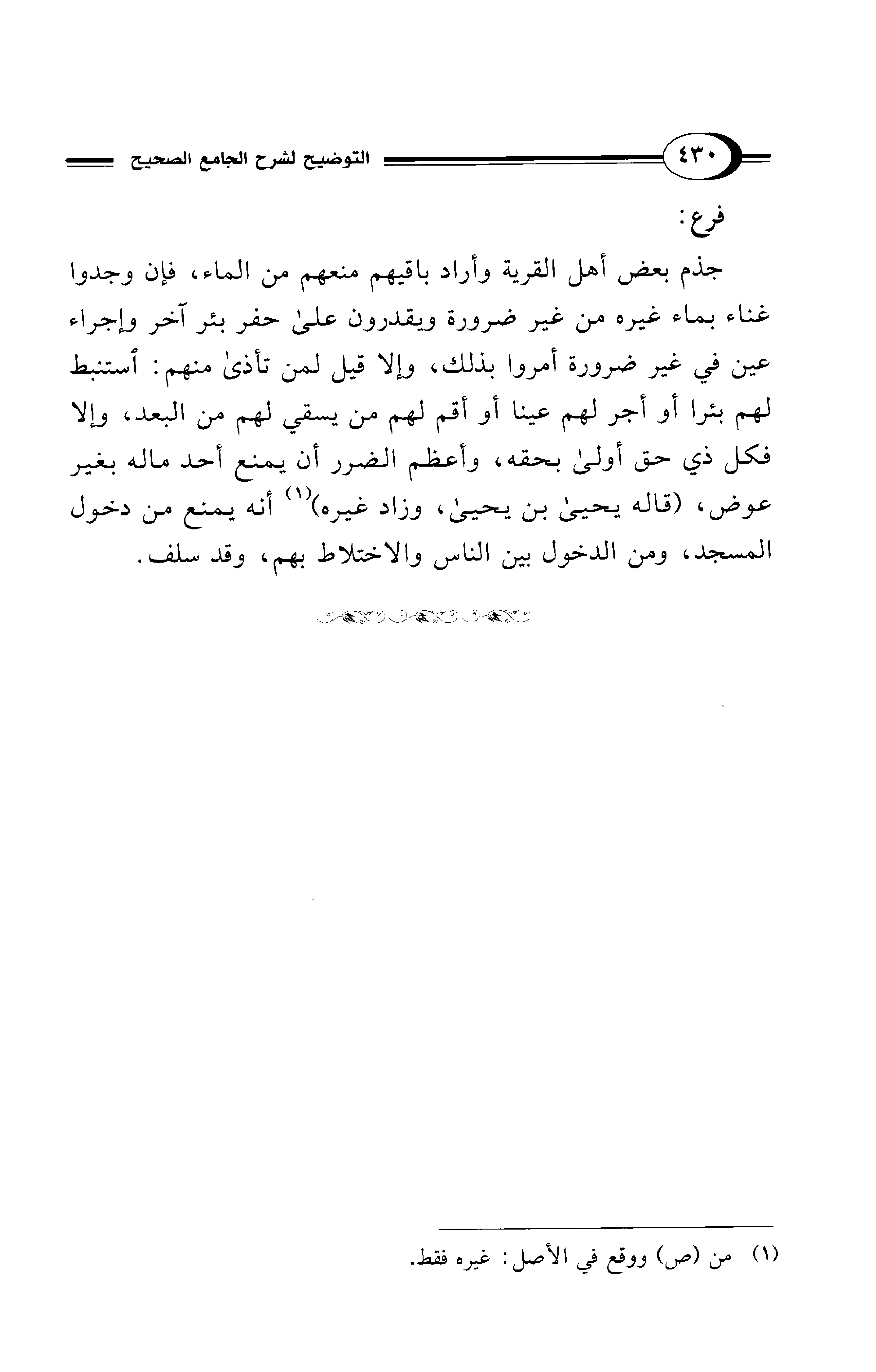 جذم بعض أهل القرية وأراد باقيهم منعهم من الماء، فإن وجدوا غناء بماء غيره من غير ضرورة ويقدرون على حفر بئر آخر وإجراء عين في غير ضرورة أمروا بذلك، وإلا قيل لمن تأذى منهم: استنبط لهم بئرا أو أجر لهم عينا أو أقم لهم من يسقي لهم من البعد، وإلا فكل ذي حق أولى بحقه، وأعظم الضرر أن يمنع أحد ماله بغير عوض، (قاله يحيى بن يحيى، وزاد غيره) (¬1) أنه يمنع من دخول المسجد، ومن الدخول بين الناس والاختلاط بهم، وقد سلف.