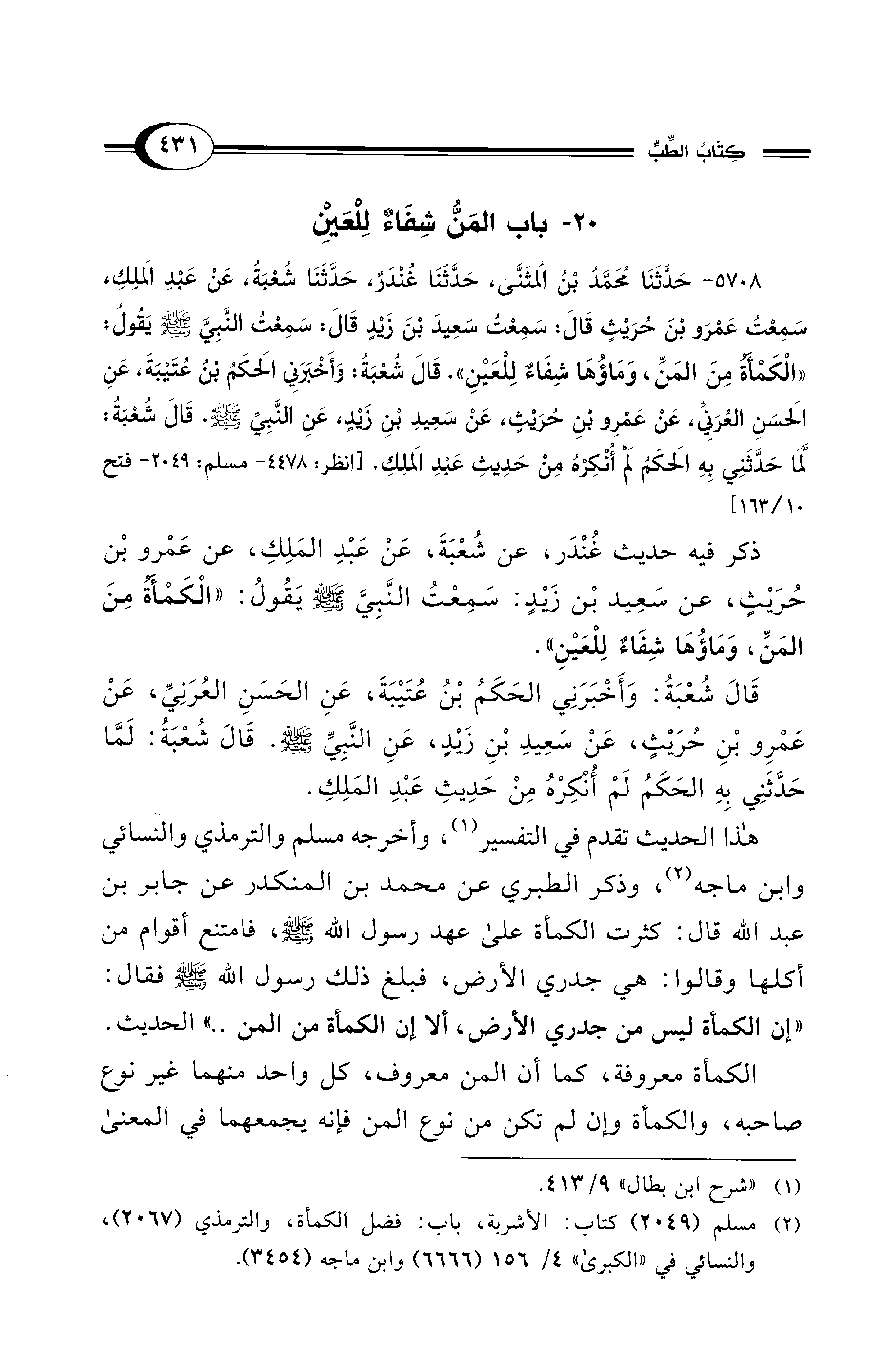ذكر فيه حديث غُنْدَر، عن شُعْبَةَ، عَنْ عَبْدِ المَلِكِ، عن عَمْرو بْن حُرَيْثٍ، عن سَعِيد بْن زَيْدٍ: سَمِعْتُ النَّبِيَّ - صلى الله عليه وسلم - يقُولُ: "الْكَمْأَةُ مِنَ المَنِّ، وَمَاؤُهَا شِفَاءٌ لِلْعَيْنِ".