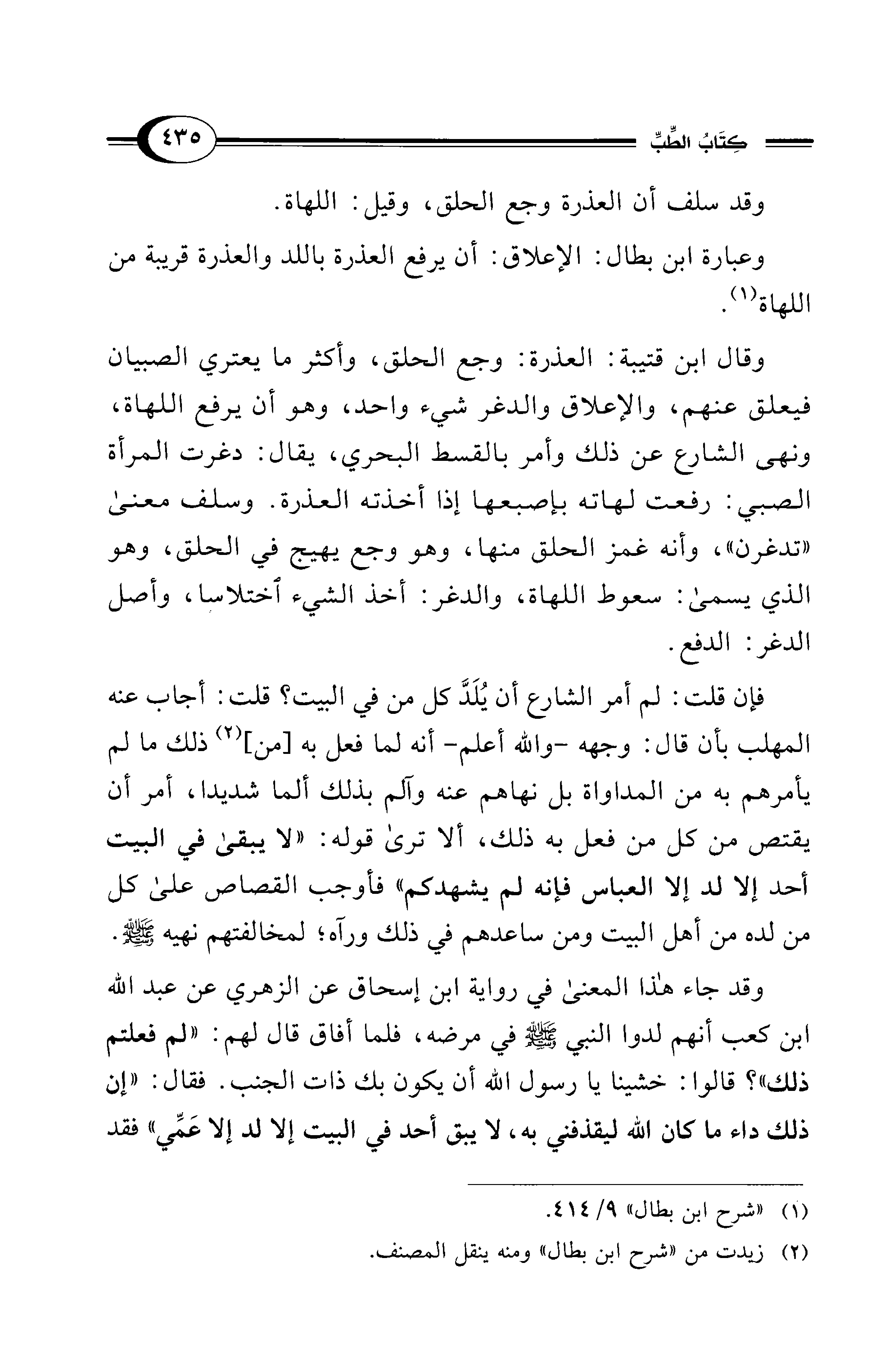 فإن قلت: لم أمر الشارع أن يُلَدَّ كل من في البيت؟ قلت: أجاب عنه المهلب بأن قال: وجهه -والله أعلم- أنه لما فعل به [من] (¬2) ذلك ما لم يأمرهم به من المداواة بل نهاهم عنه وآلم بذلك ألما شديدا، أمر أن يقتص من كل من فعل به ذلك، ألا ترى قوله: "لا يبقى في البيت أحد إلا لد إلا العباس فإنه لم يشهدكم" فأوجب القصاص على كل من لده من أهل البيت ومن ساعدهم في ذلك ورآه؛ لمخالفتهم نهيه - صلى الله عليه وسلم -.