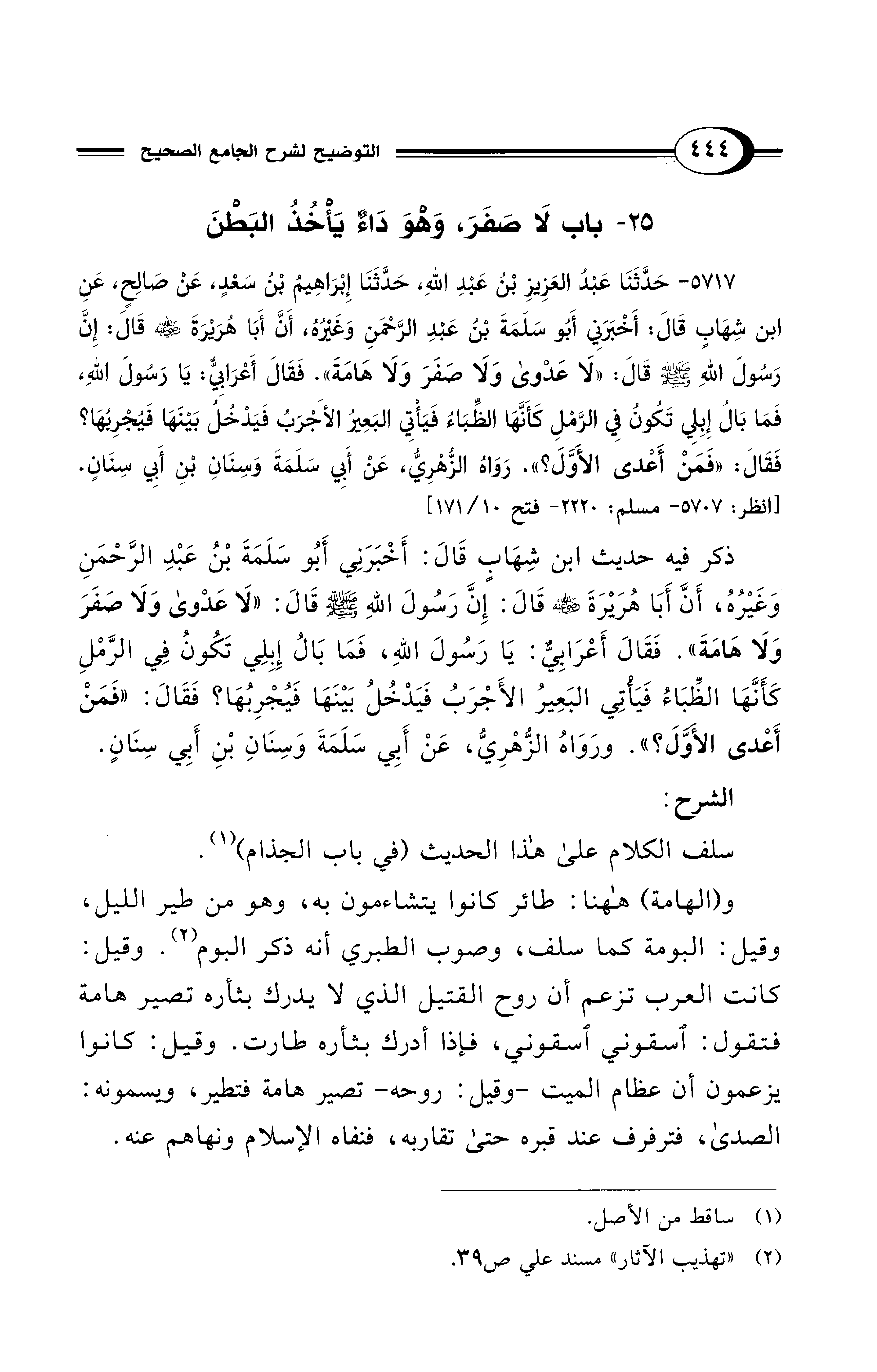 5717 - حَدَّثَنَا عَبْدُ الْعَزِيزِ بْنُ عَبْدِ اللهِ، حَدَّثَنَا إِبْرَاهِيمُ بْنُ سَعْدٍ، عَنْ صَالِحٍ، عَنِ ابْنِ شِهَابٍ قَالَ: أَخْبَرَنِي أَبُو سَلَمَةَ بْنُ عَبْدِ الرَّحْمَنِ وَغَيْرُهُ، أَنَّ أَبَا هُرَيْرَةَ - رضي الله عنه - قَالَ: إِنَّ رَسُولَ اللهِ - صلى الله عليه وسلم - قَالَ: «لاَ عَدْوَى وَلاَ صَفَرَ وَلاَ هَامَةَ». فَقَالَ أَعْرَابِيٌّ: يَا رَسُولَ اللهِ، فَمَا بَالُ إِبِلِي تَكُونُ فِي الرَّمْلِ كَأَنَّهَا الظِّبَاءُ فَيَأْتِي الْبَعِيرُ الأَجْرَبُ فَيَدْخُلُ بَيْنَهَا فَيُجْرِبُهَا؟ فَقَالَ: «فَمَنْ أَعْدَى الأَوَّلَ؟». رَوَاهُ الزُّهْرِيُّ، عَنْ أَبِي سَلَمَةَ وَسِنَانِ بْنِ أَبِي سِنَانٍ. [انظر: 5707 - مسلم: 2220 - فتح 10/ 171]