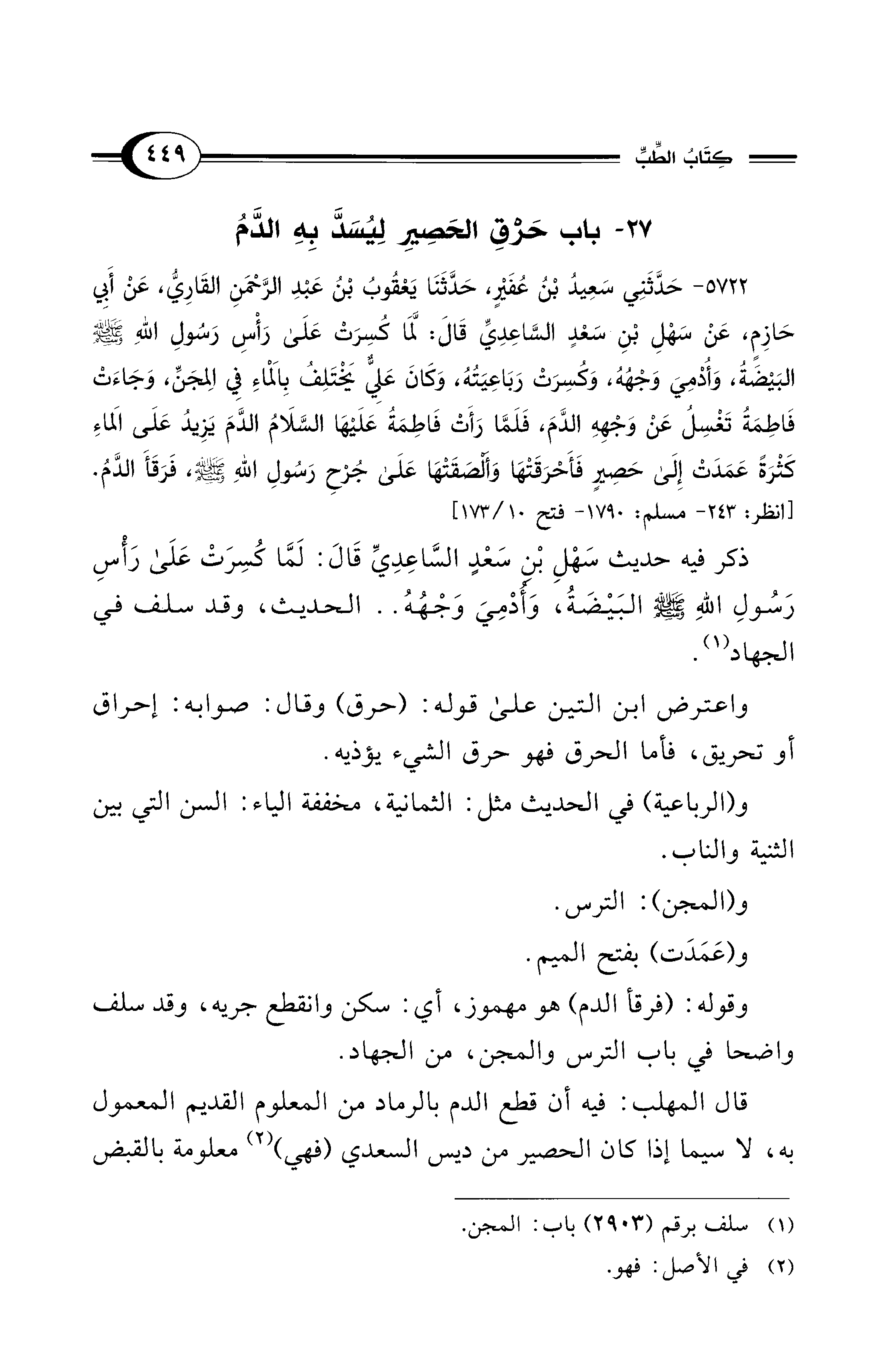 5722 - حَدَّثَنِي سَعِيدُ بْنُ عُفَيْرٍ، حَدَّثَنَا يَعْقُوبُ بْنُ عَبْدِ الرَّحْمَنِ الْقَارِيُّ، عَنْ أَبِي حَازِمٍ، عَنْ سَهْلِ بْنِ سَعْدٍ السَّاعِدِيِّ قَالَ: لَمَّا كُسِرَتْ عَلَى رَأْسِ رَسُولِ اللهِ - صلى الله عليه وسلم - البَيْضَةُ، وَأُدْمِيَ وَجْهُهُ، وَكُسِرَتْ رَبَاعِيَتُهُ، وَكَانَ عَلِيٌّ يَخْتَلِفُ بِالْمَاءِ فِي الْمِجَنِّ، وَجَاءَتْ فَاطِمَةُ تَغْسِلُ عَنْ وَجْهِهِ الدَّمَ، فَلَمَّا رَأَتْ فَاطِمَةُ - عَلَيْهَا السَّلاَمُ - الدَّمَ يَزِيدُ على الْمَاءِ كَثْرَةً عَمَدَتْ إِلَى حَصِيرٍ فَأَحْرَقَتْهَا وَأَلْصَقَتْهَا عَلَى جُرْحِ رَسُولِ اللهِ - صلى الله عليه وسلم -، فَرَقَأَ الدَّمُ. [انظر: 243 - مسلم: 1790 - فتح 10/ 173]
