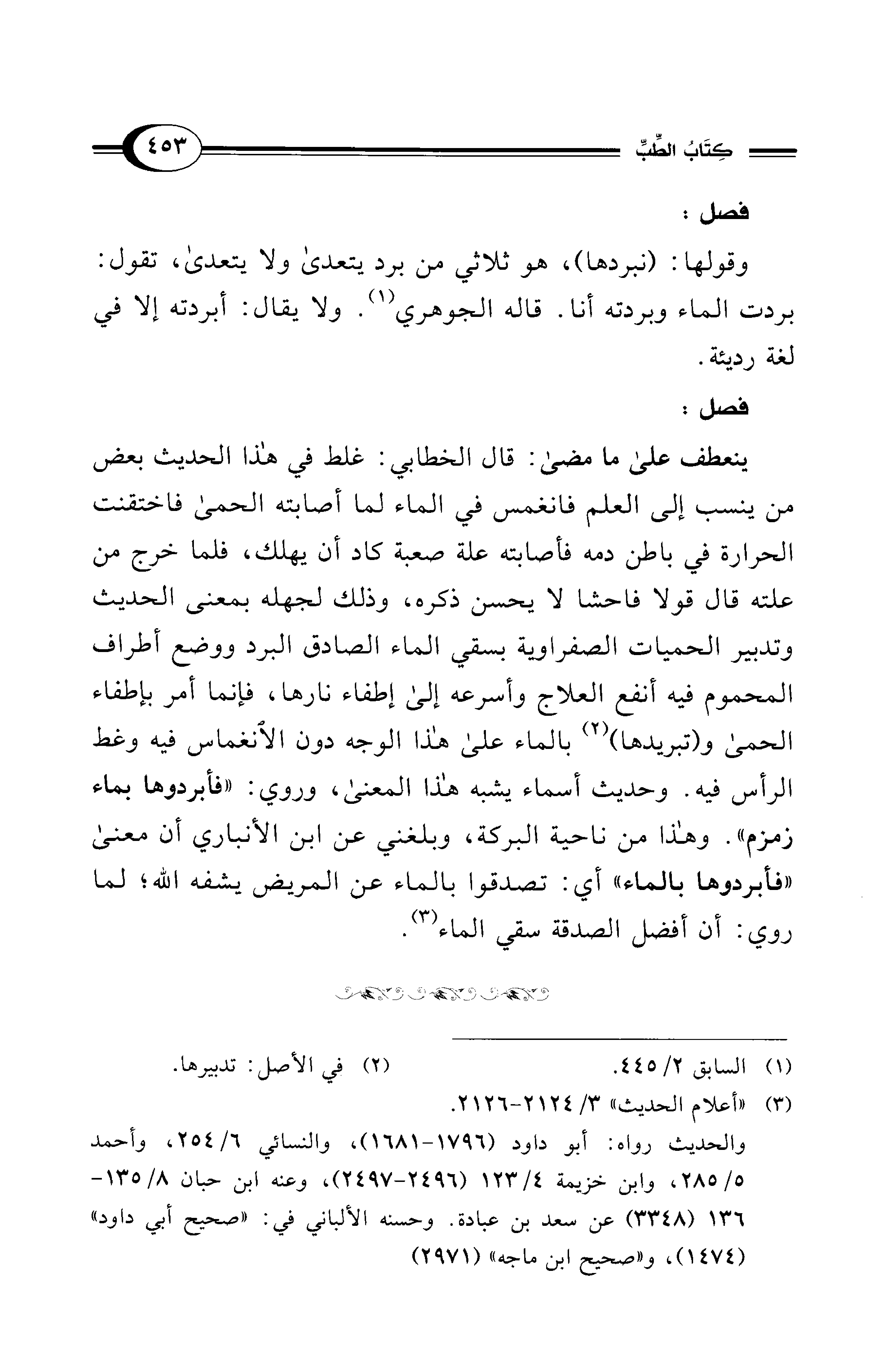 ينعطف على ما مضى: قال الخطابي: غلط في هذا الحديث بعض من ينسب إلى العلم فانغمس في الماء لما أصابته الحمى فاختقنت الحرارة في باطن دمه فأصابته علة صعبة كاد أن يهلك، فلما خرج من علته قال قولا فاحشا لا يحسن ذكره، وذلك لجهله بمعنى الحديث وتدبير الحميات الصفراوية بسقي الماء الصادق البرد ووضع أطراف المحموم فيه أنفع العلاج وأسرعه إلى إطفاء نارها، فإنما أمر بإطفاء الحمى و (تبريدها) (¬2) بالماء على هذا الوجه دون الانغماس فيه وغط الرأس فيه. وحديث أسماء يشبه هذا المعنى، وروي: "فأبردوها بماء زمزم". وهذا من ناحية البركة، وبلغني عن ابن الأنباري أن معنى "فأبردوها بالماء" أي: تصدقوا بالماء عن المريض يشفه الله؛ لما روي: أن أفضل الصدقة سقي الماء (¬3).