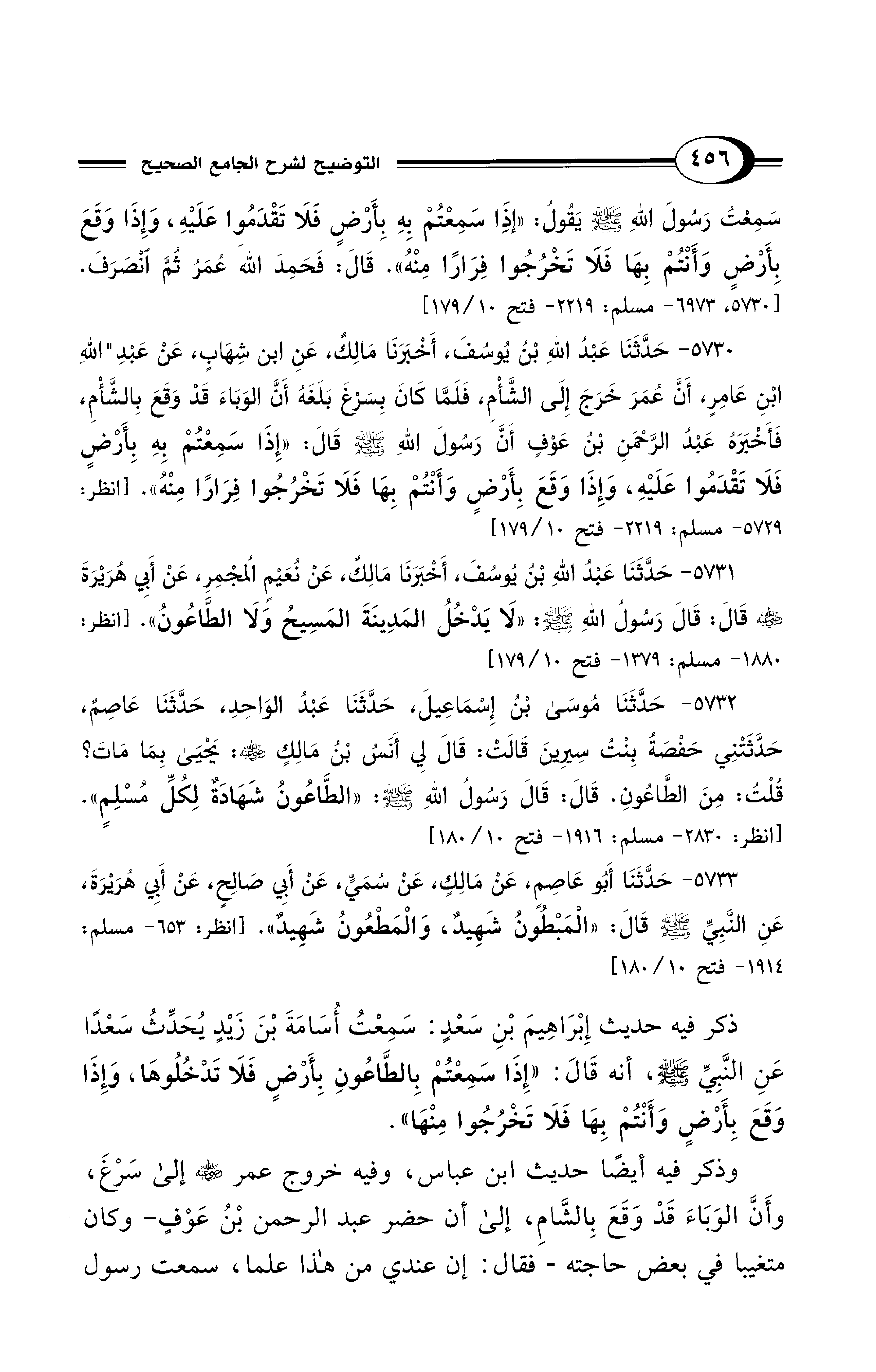 5730 - حَدَّثَنَا عَبْدُ اللهِ بْنُ يُوسُفَ، أَخْبَرَنَا مَالِكٌ، عَنِ ابْنِ شِهَابٍ، عَنْ عَبْدِ اللهِ بْنِ عَامِرٍ، أَنَّ عُمَرَ خَرَجَ إِلَى الشَّأْمِ، فَلَمَّا كَانَ بِسَرْغَ بَلَغَهُ أَنَّ الْوَبَاءَ قَدْ وَقَعَ بِالشَّأْمِ، فَأَخْبَرَهُ عَبْدُ الرَّحْمَنِ بْنُ عَوْفٍ أَنَّ رَسُولَ اللهِ - صلى الله عليه وسلم - قَالَ: «إِذَا سَمِعْتُمْ بِهِ بِأَرْضٍ فَلاَ تَقْدَمُوا عَلَيْهِ، وَإِذَا وَقَعَ بِأَرْضٍ وَأَنْتُمْ بِهَا فَلاَ تَخْرُجُوا فِرَارًا مِنْهُ». [انظر: 5729 - مسلم: 2219 - فتح 10/ 179]