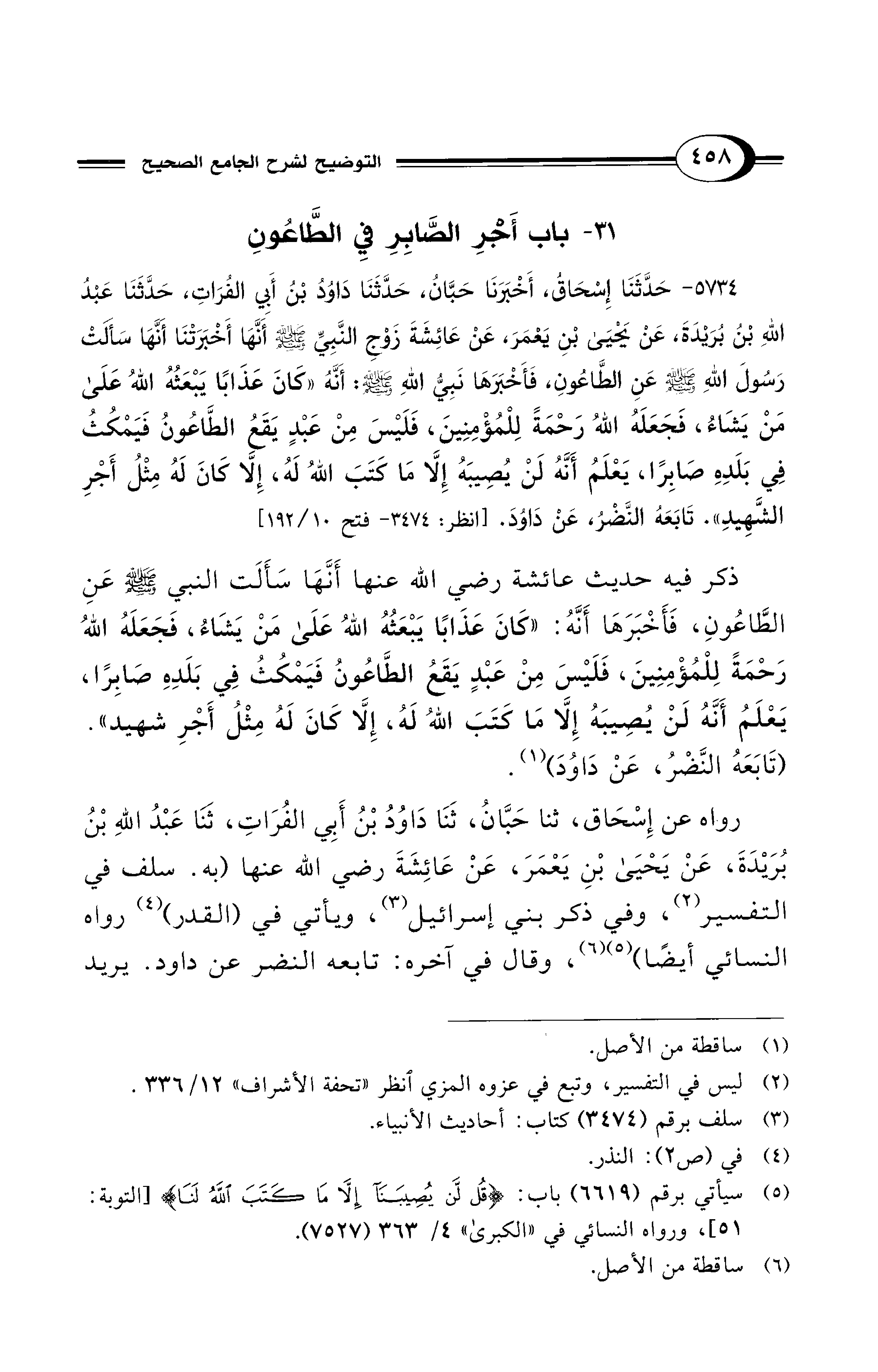 ذكر فيه حديث عائشة - رضي الله عنها - أَنَّهَا سَأَلَت النبي - صلى الله عليه وسلم - عَنِ الطَّاعُونِ، فَأَخْبَرَهَا أَنَّهُ: "كَانَ عَذَابًا يَبْعَثُهُ اللهُ عَلَى مَنْ يَشَاءُ، فَجَعَلَهُ اللهُ رَحْمَةً لِلْمُؤْمِنِينَ، فَلَيْسَ مِنْ عَبْدٍ يَقَعُ الطَّاعُونُ فَيَمْكُثُ فِي بَلَدِهِ صَابِرًا، يَعْلَمُ أَنَّهُ لَنْ يُصِيبَهُ إِلَّا مَا كَتَبَ اللهُ لَهُ، إِلَّا كَانَ لَهُ مِثْلُ أَجْرِ شهيد". (تَابَعَهُ النَّضْرُ، عَنْ دَاوُدَ) (¬1).